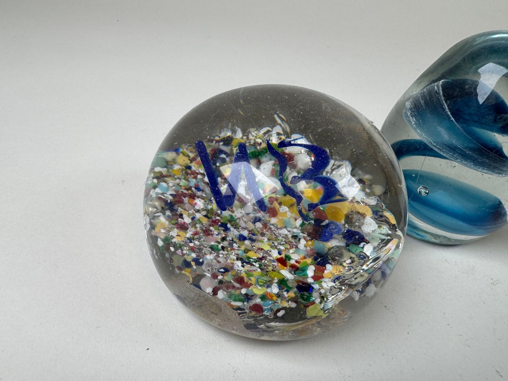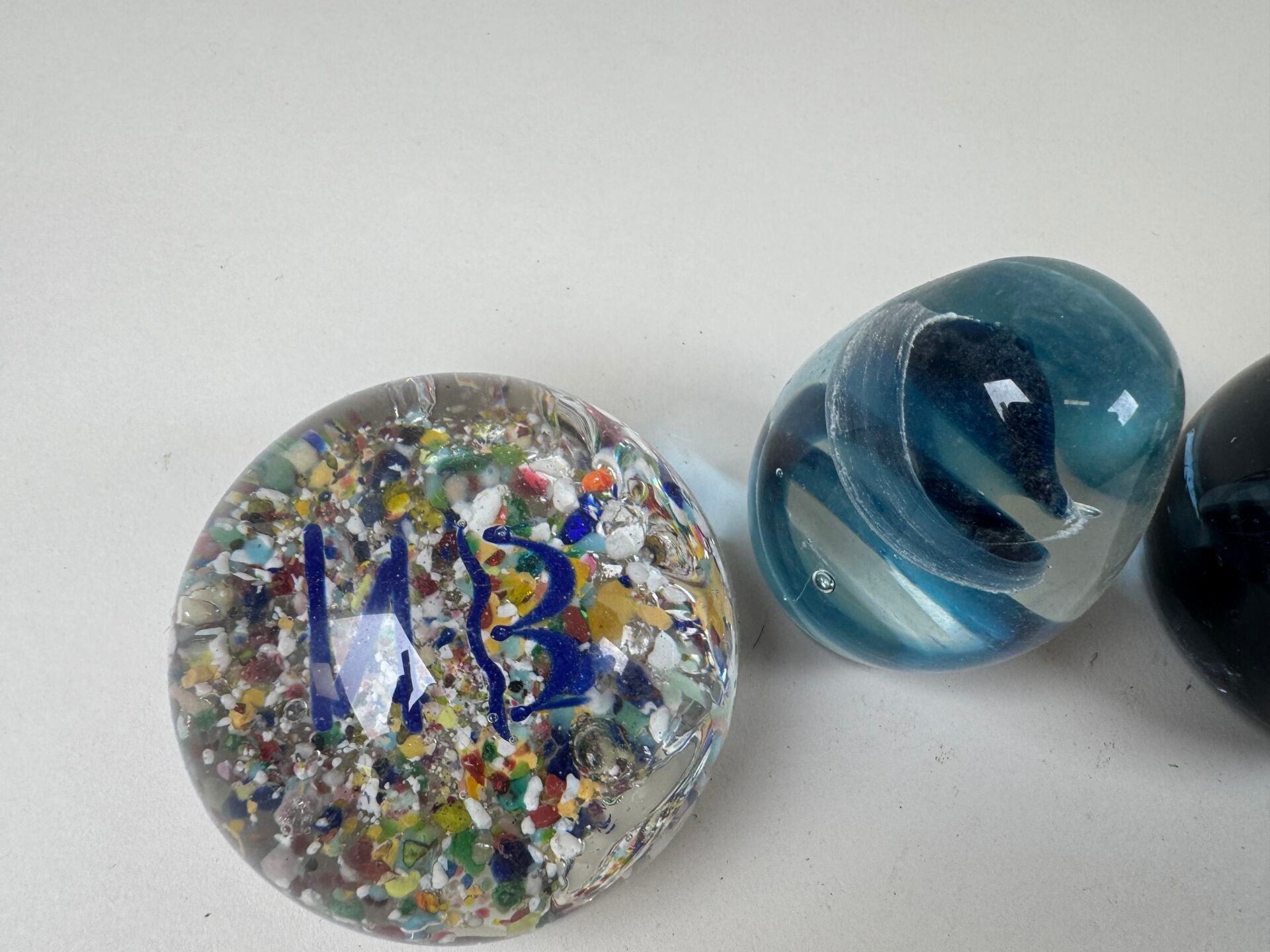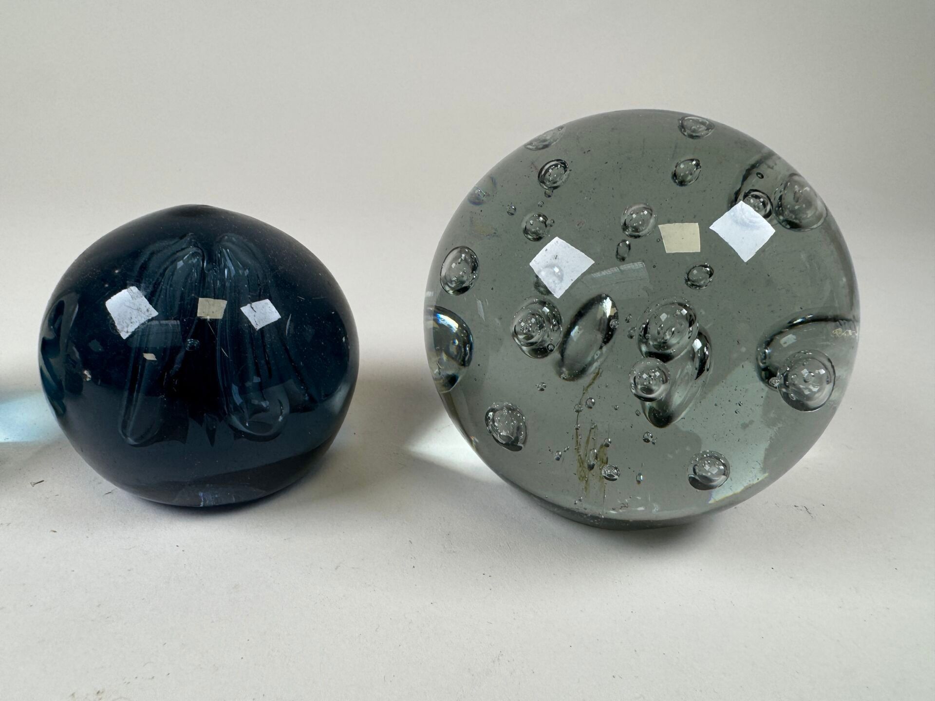 Four coloured glass paperweight sulphur balls decorated with flowers or stylised motifs, one of which is engraved.