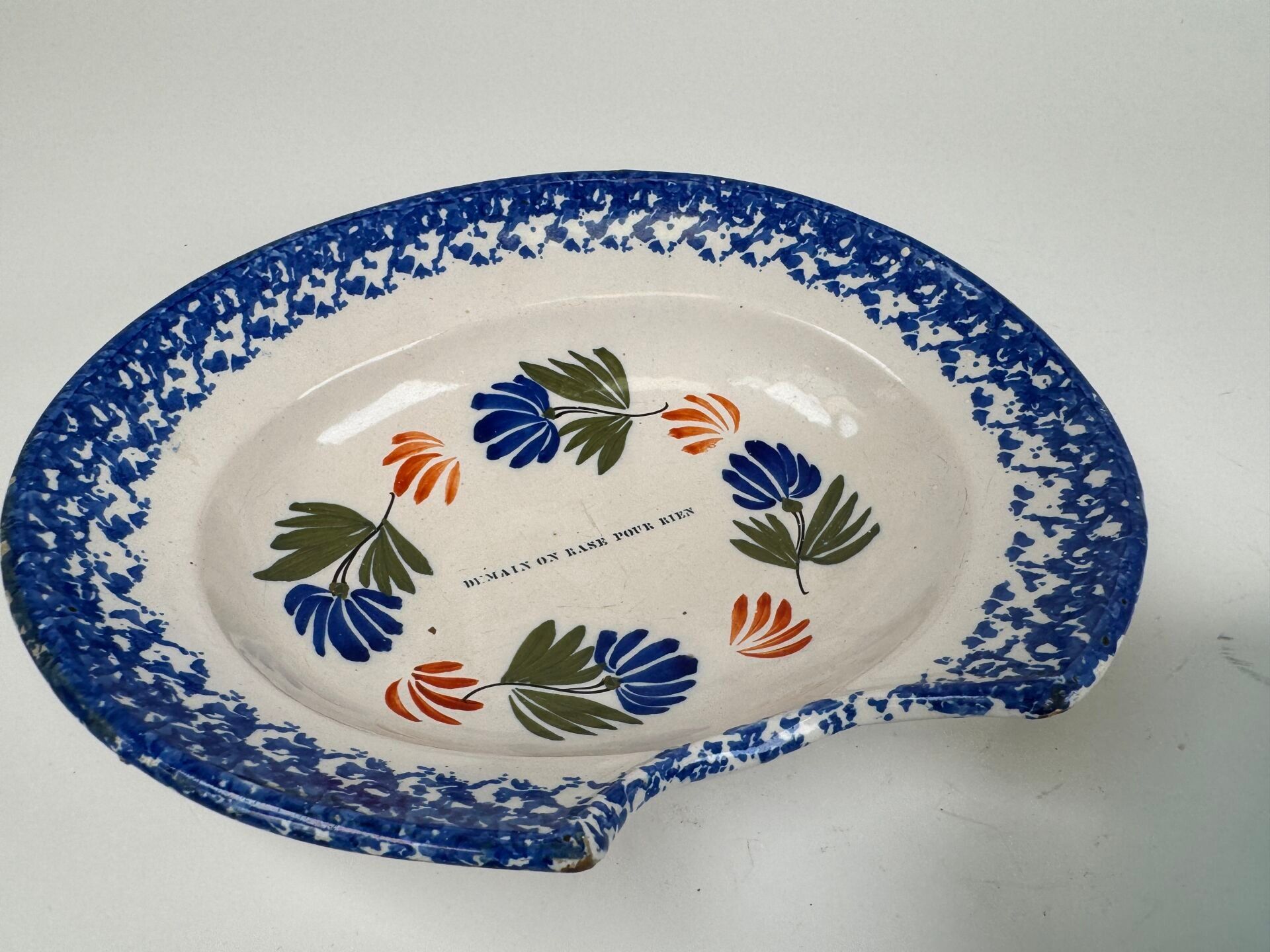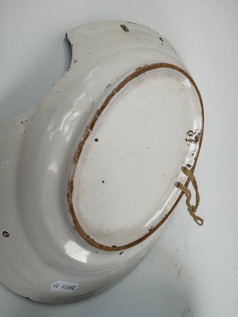 A polychrome earthenware beard dish with the inscription "Demain on rase pour rien" (Tomorrow we shave for nothing).