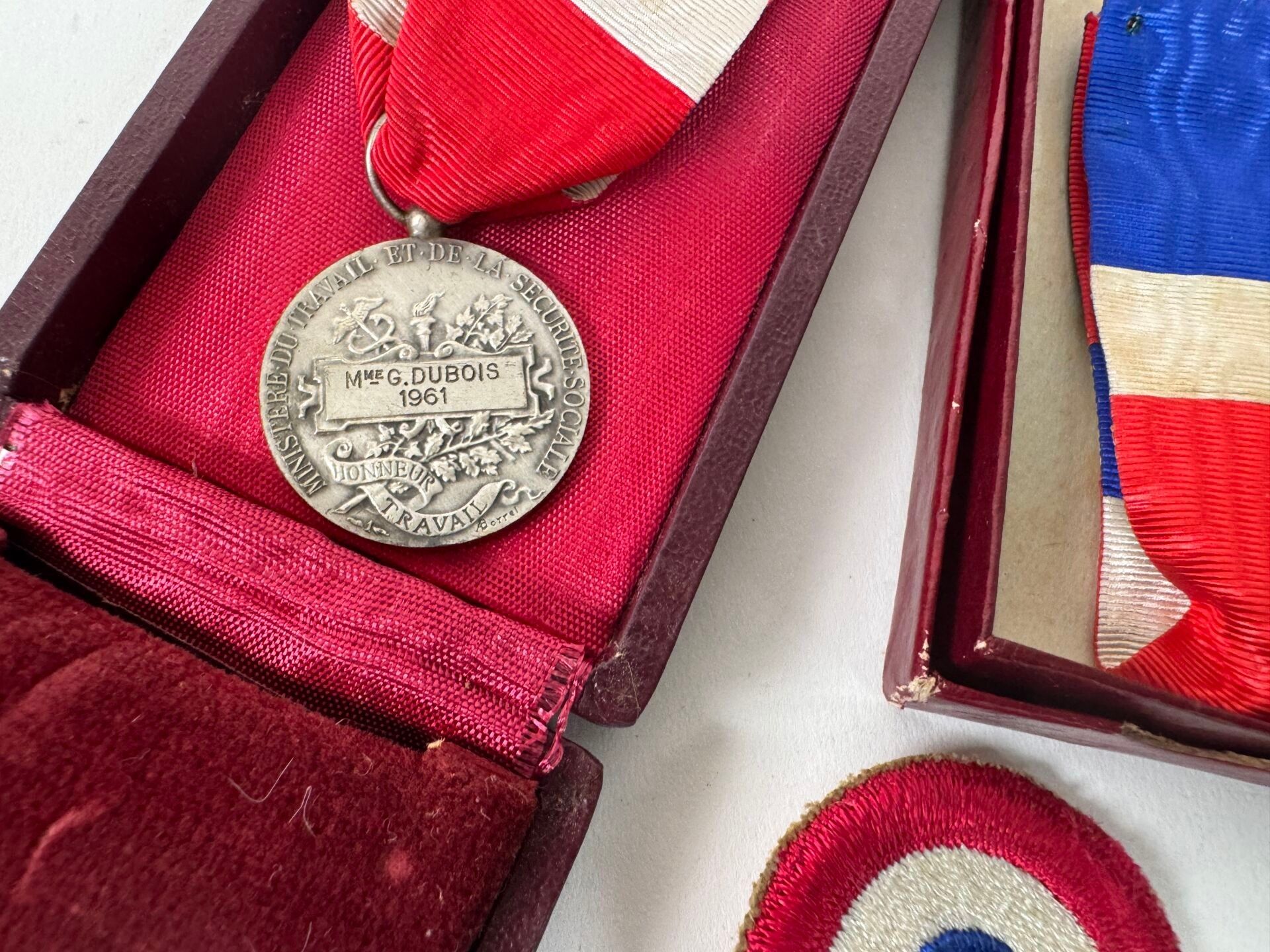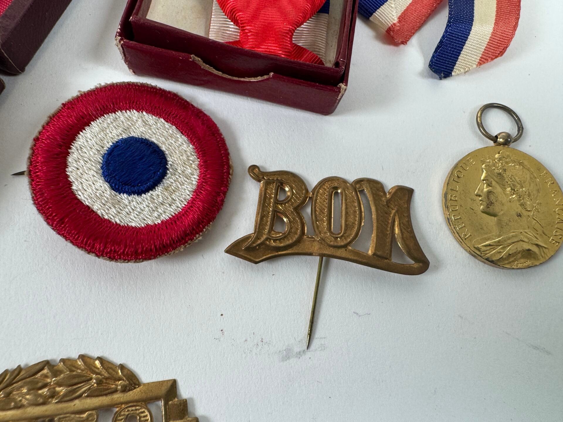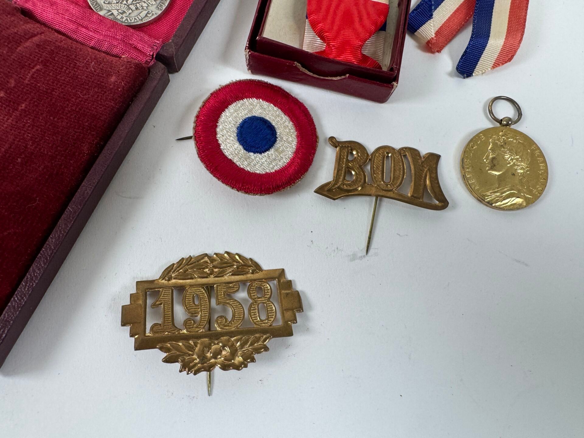 Set of decorations including two medals, tricolour cockade, "Bon" metal pin, "1958" metal pin.