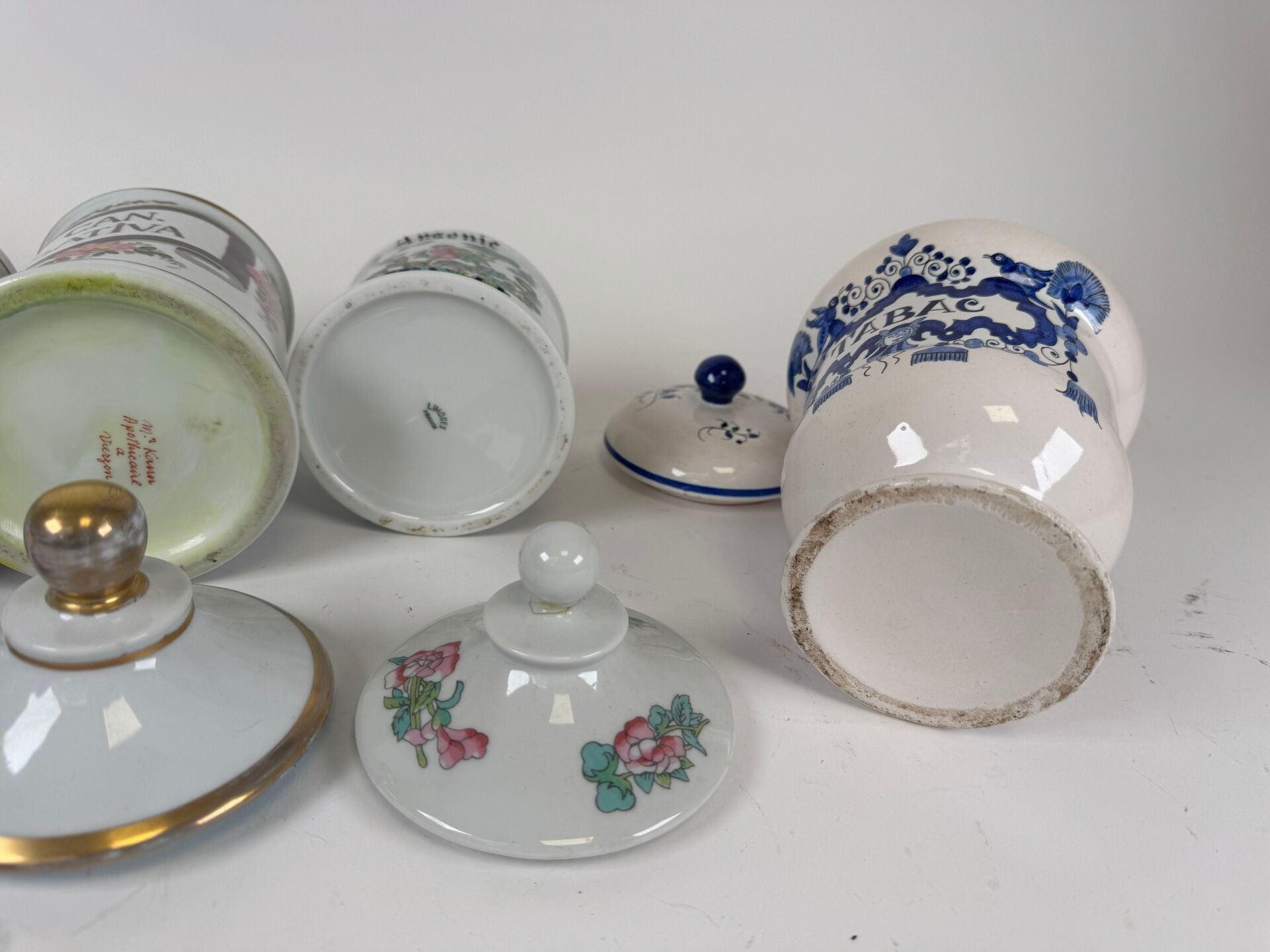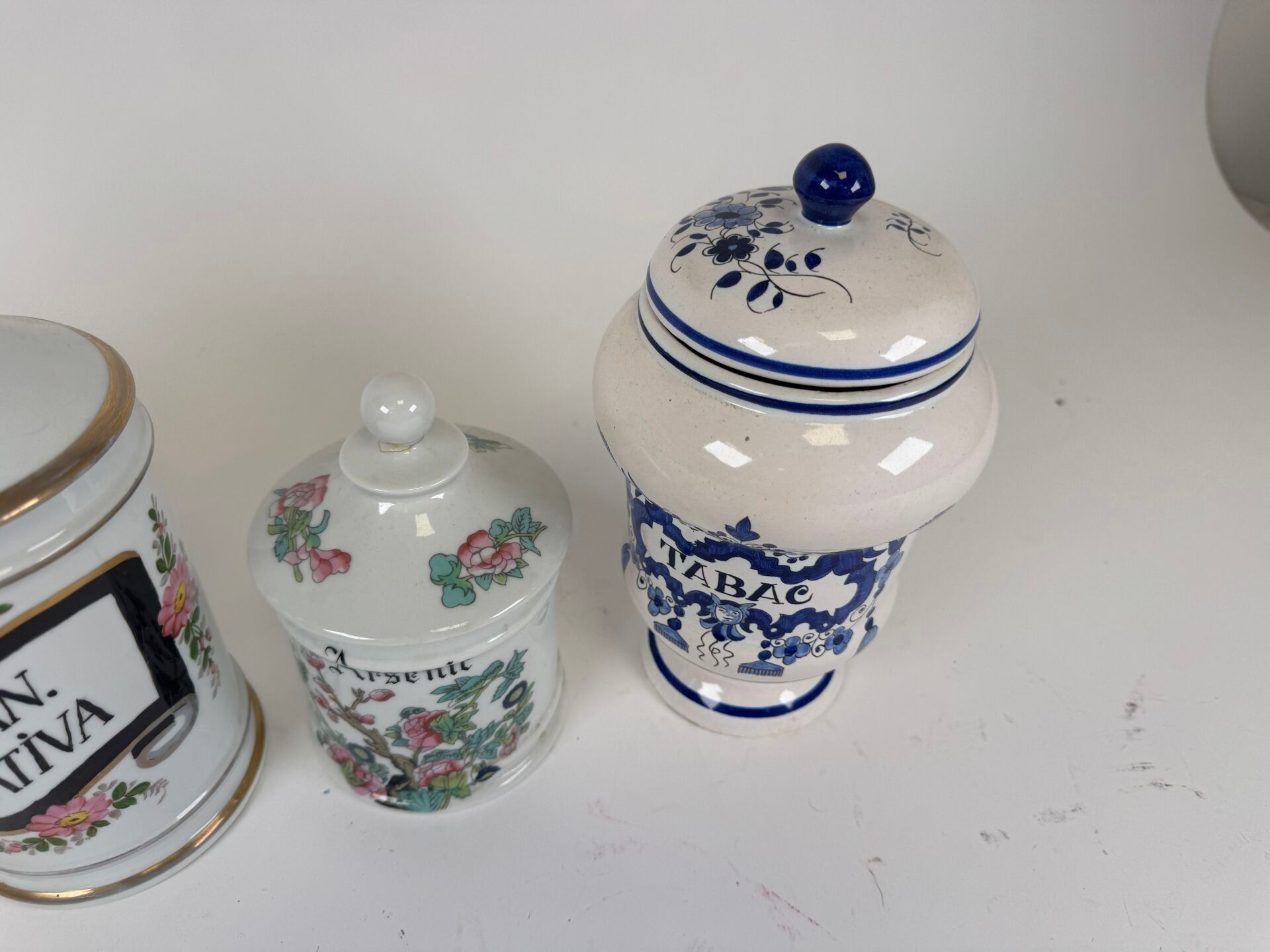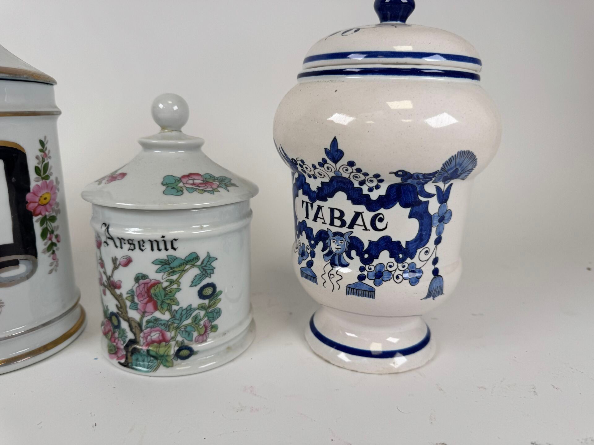 A covered polychrome porcelain pharmacy jar and an earthenware tobacco jar on a white background.