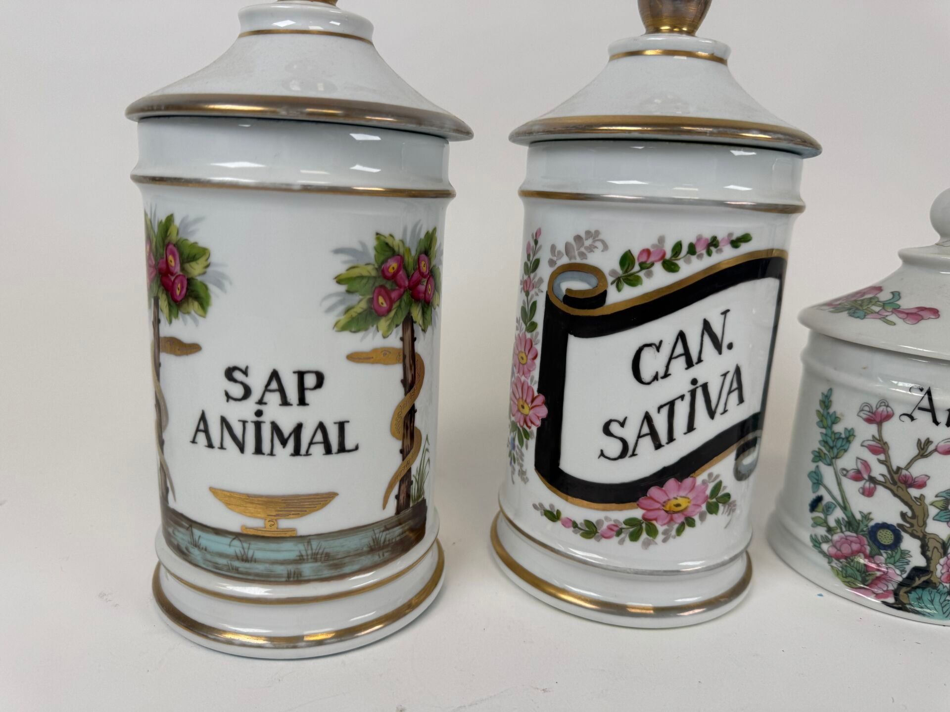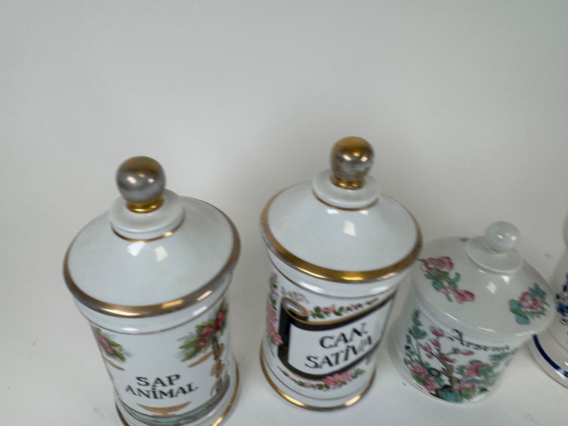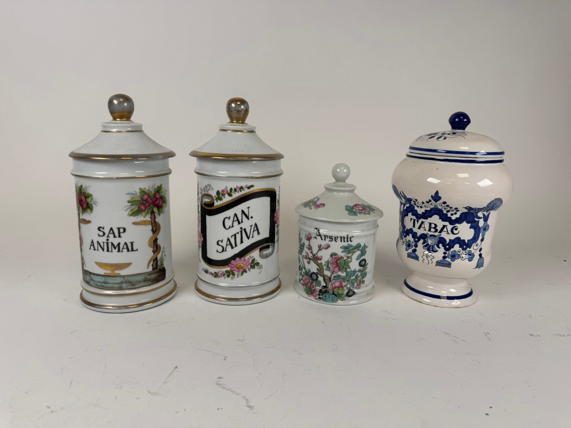 A covered polychrome porcelain pharmacy jar and an earthenware tobacco jar on a white background.