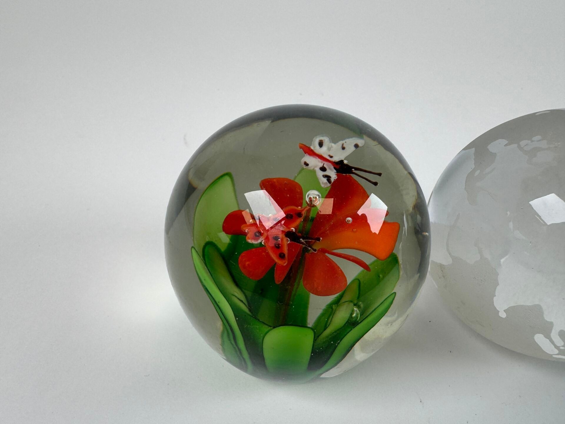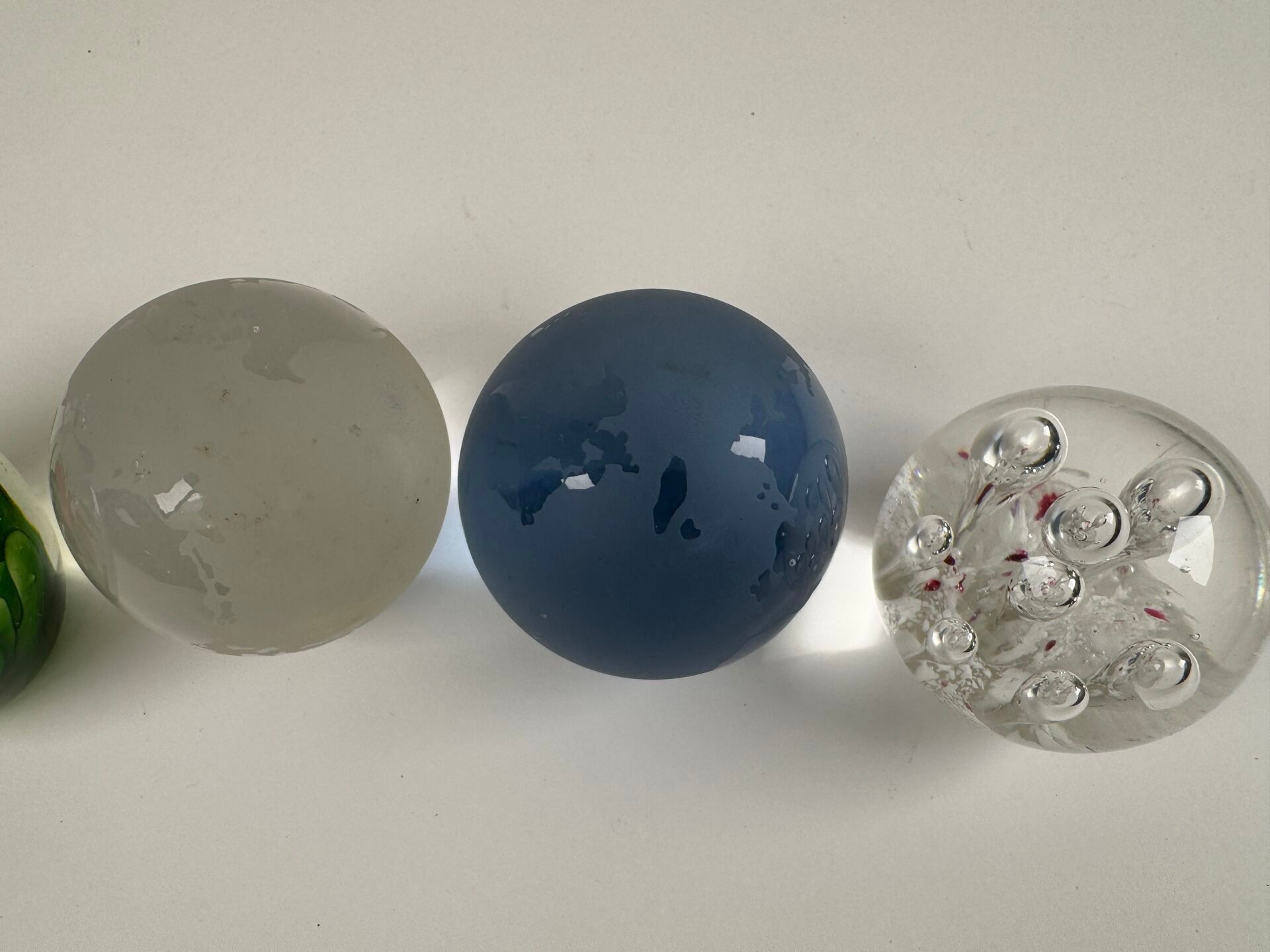 Collection of 4 coloured glass sulphur balls or paperweights, two of which are decorated with globes and one with butterflies.