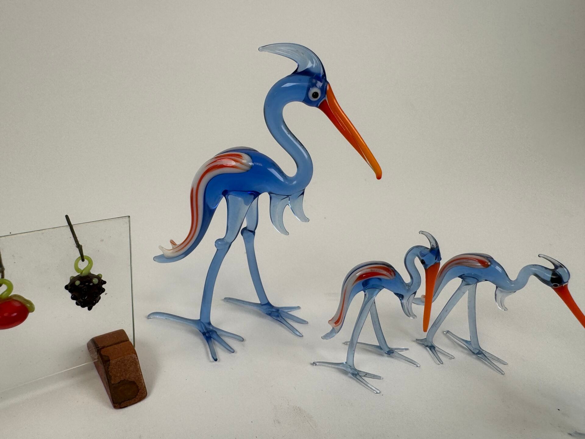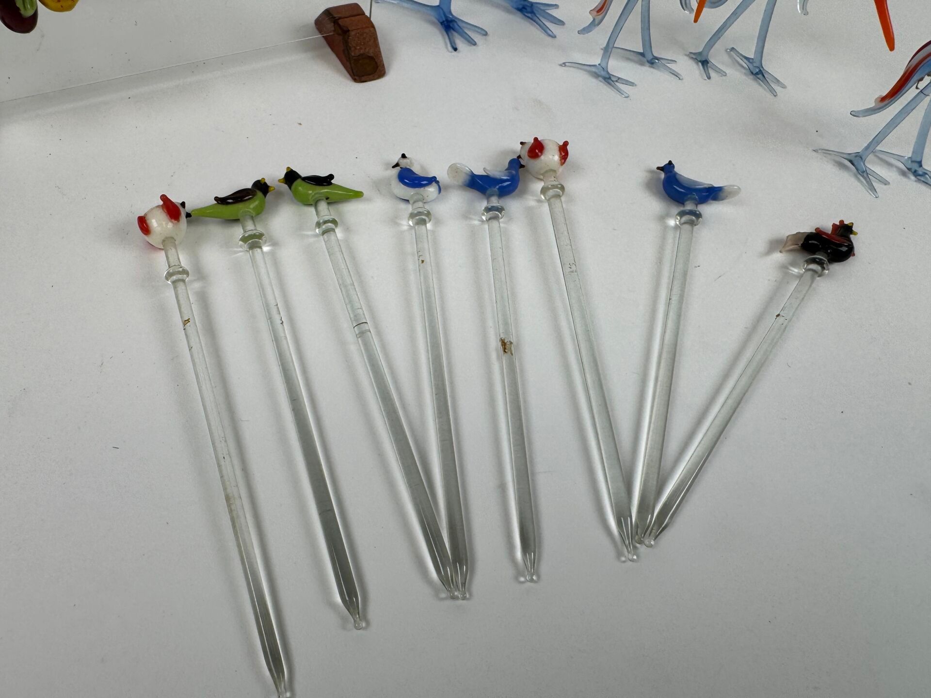 Spun glass lot including waders, 8 small swirls and small fruit-shaped elements.