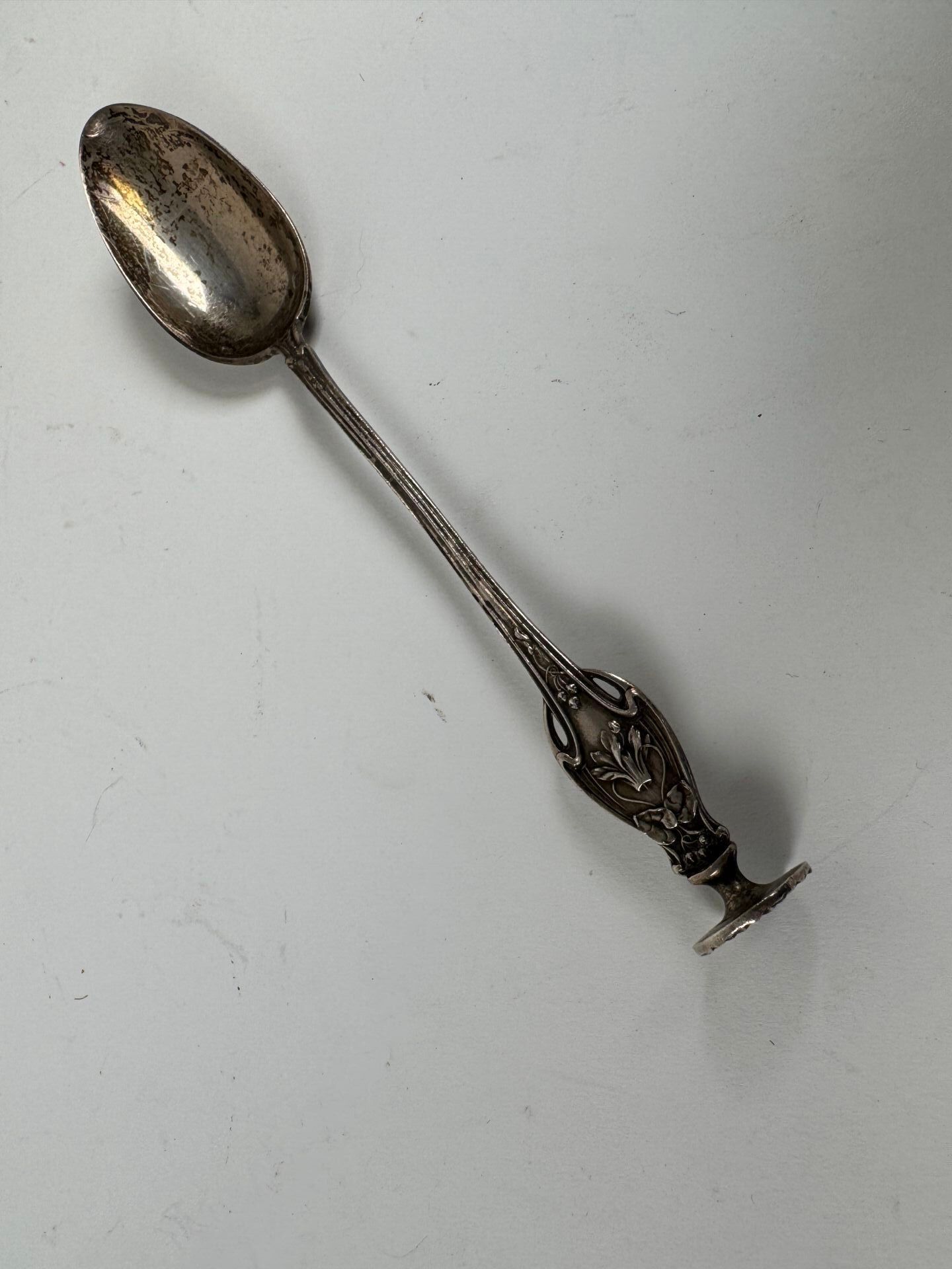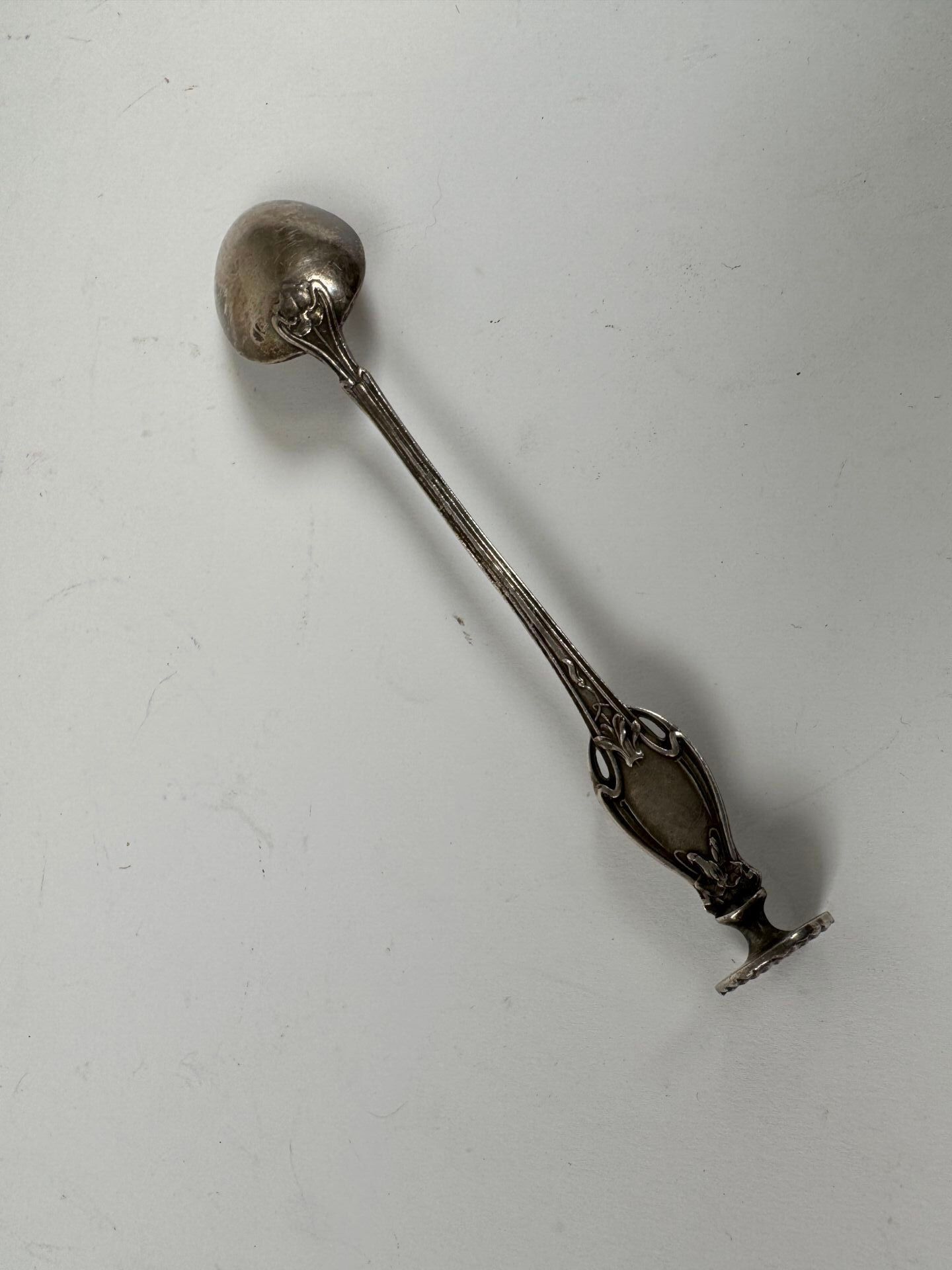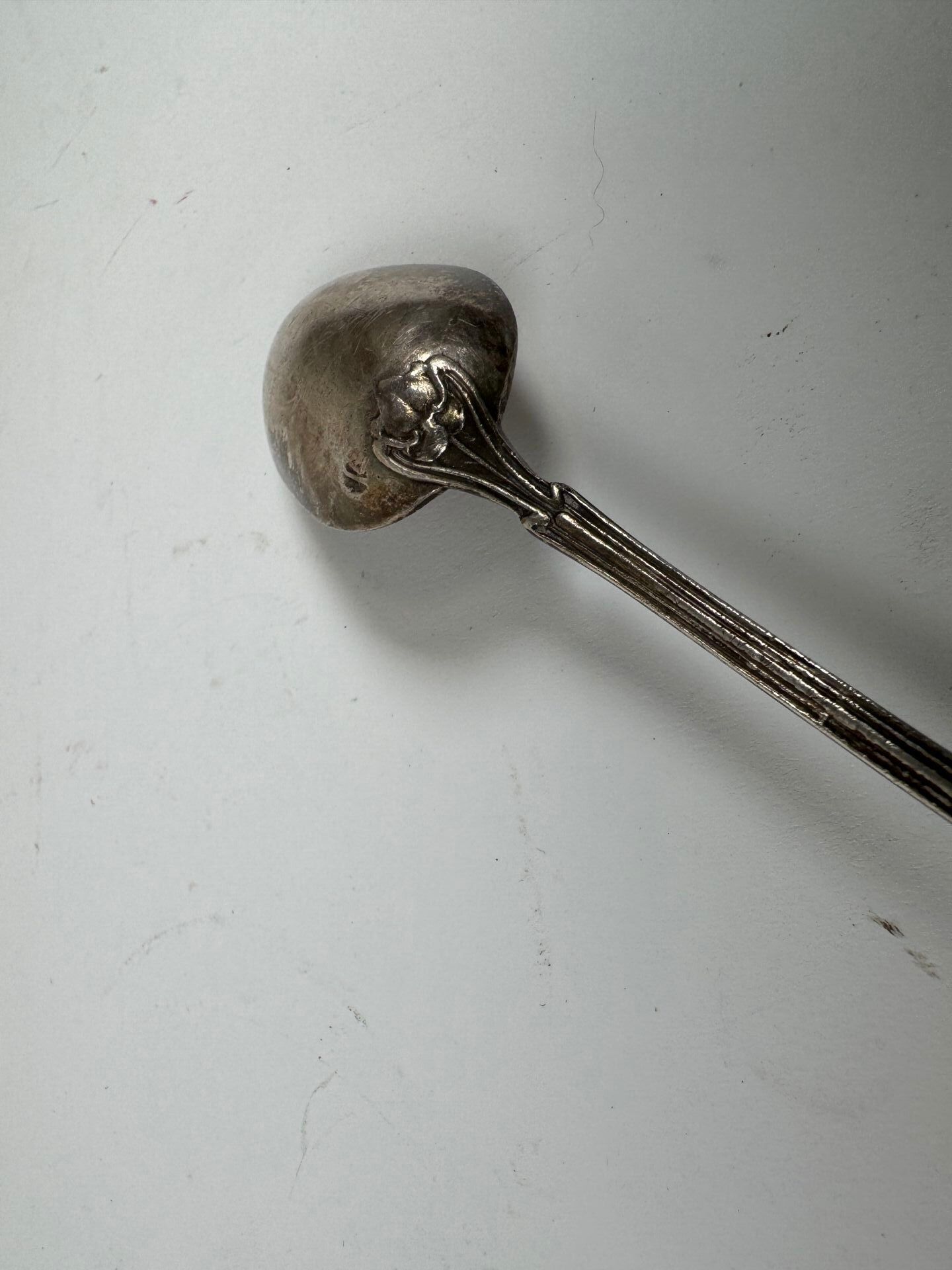 A Minerve hallmarked silver medicine spoon with foliate decoration.