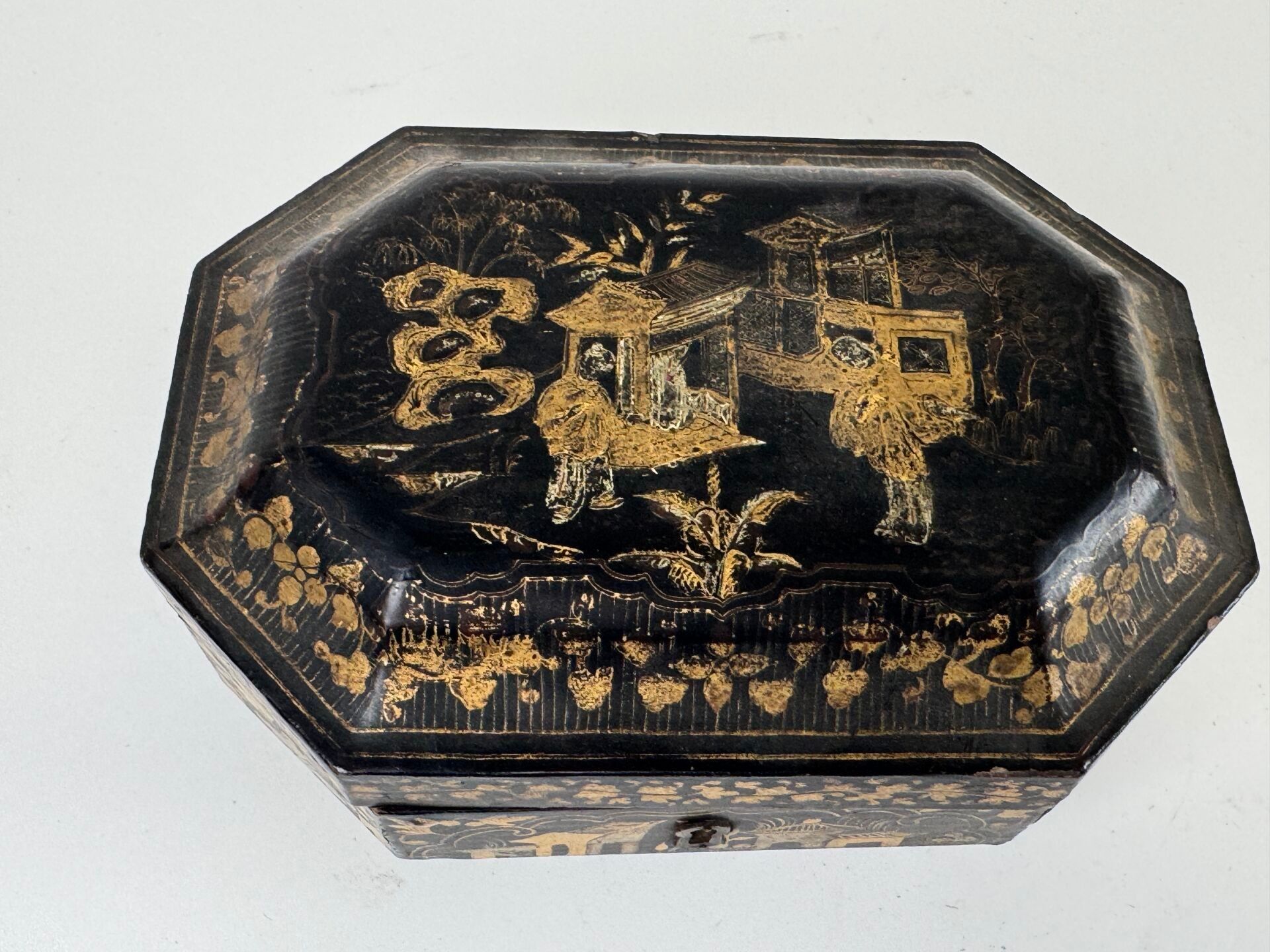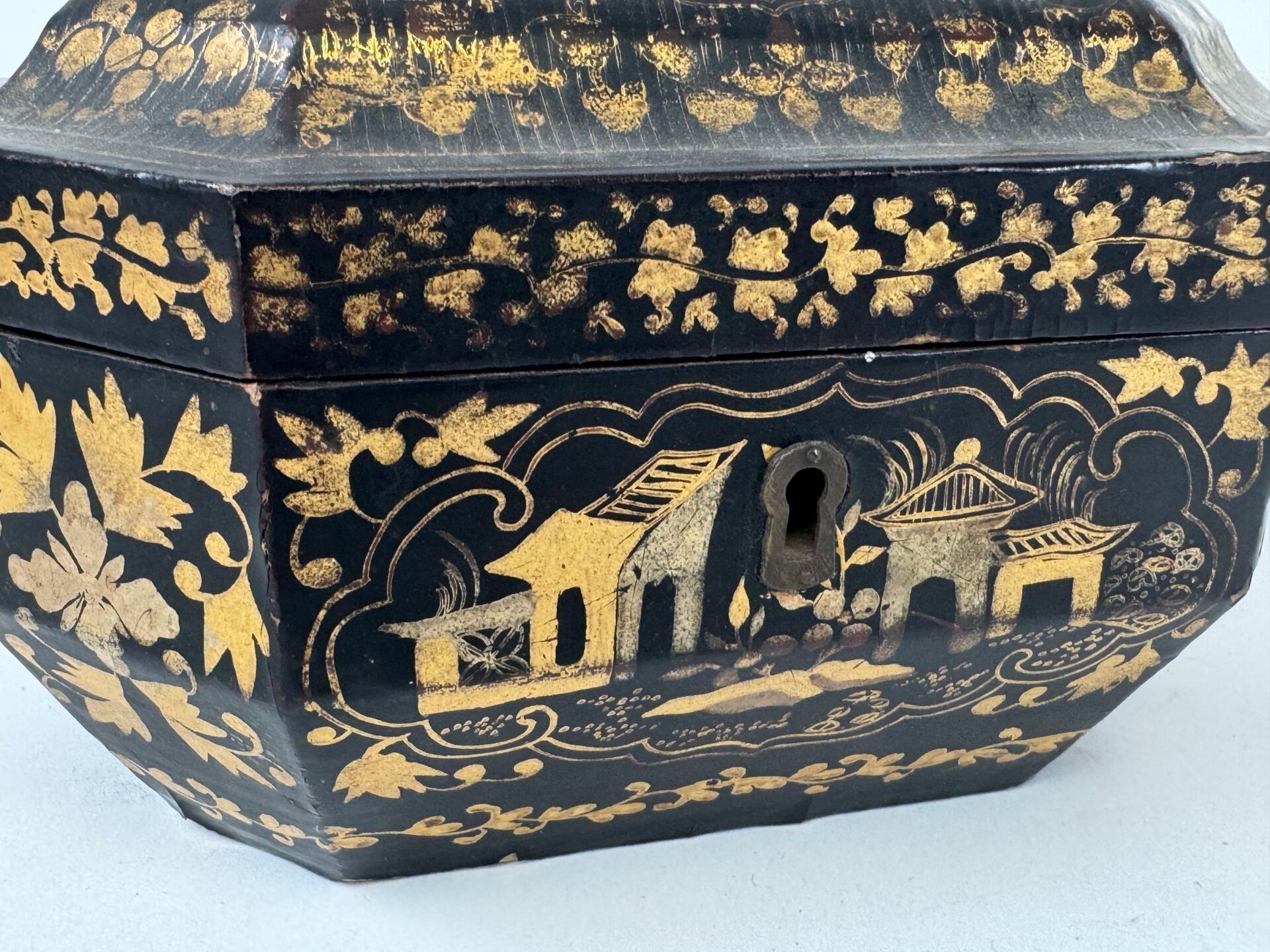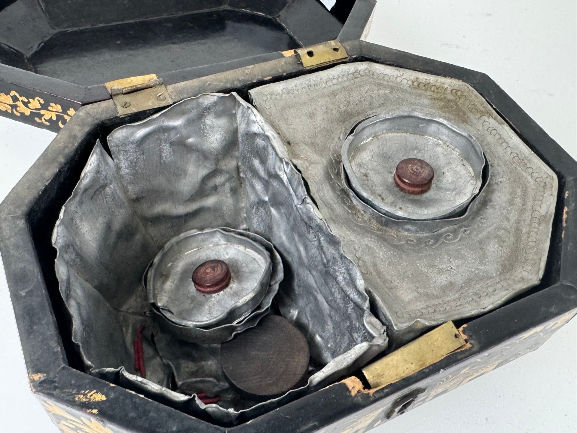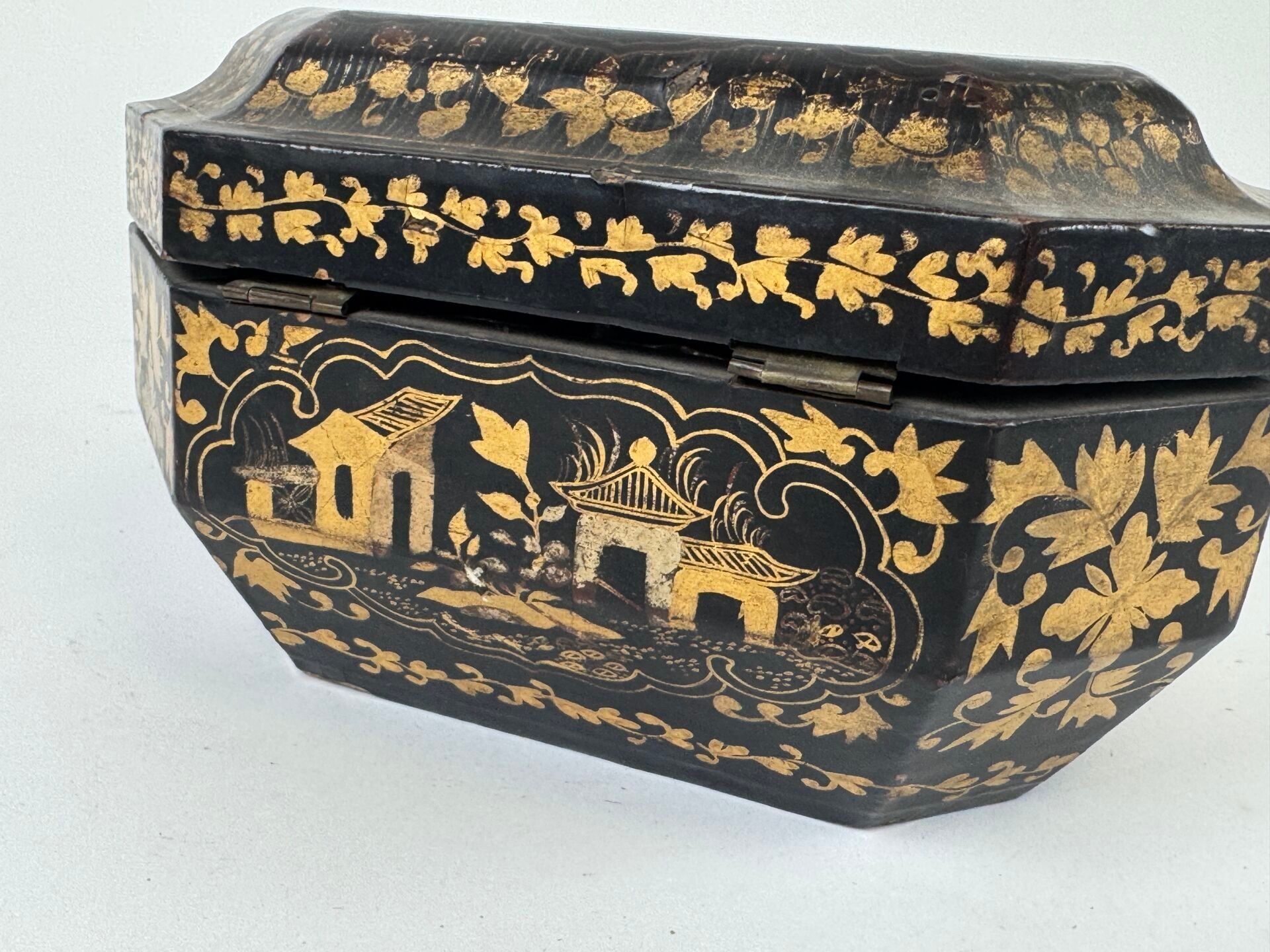 Lacquered wood tea caddy with gold decoration of Asian landscapes, metal compartments inside.