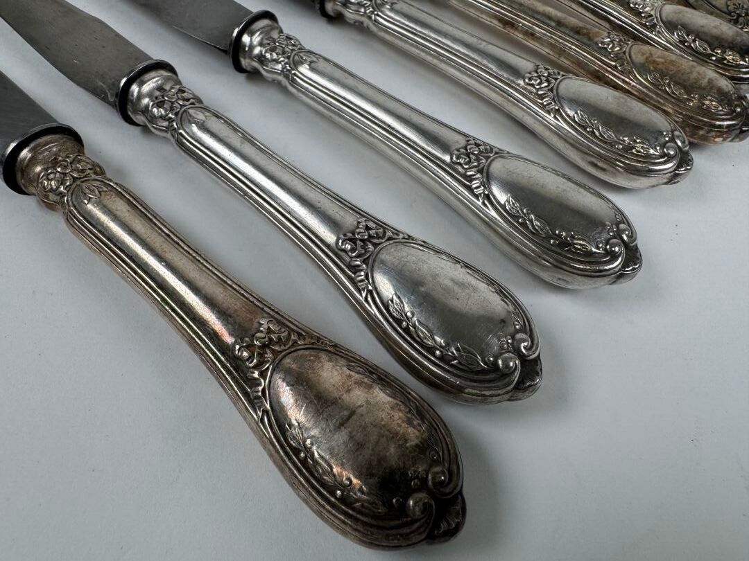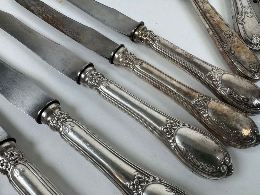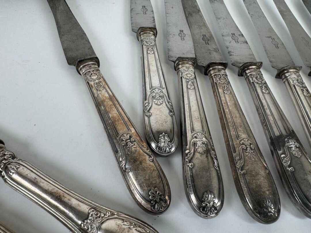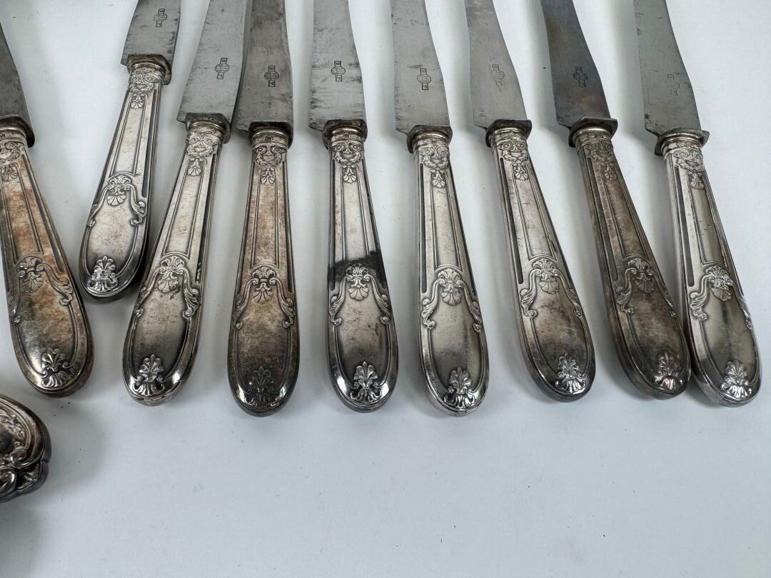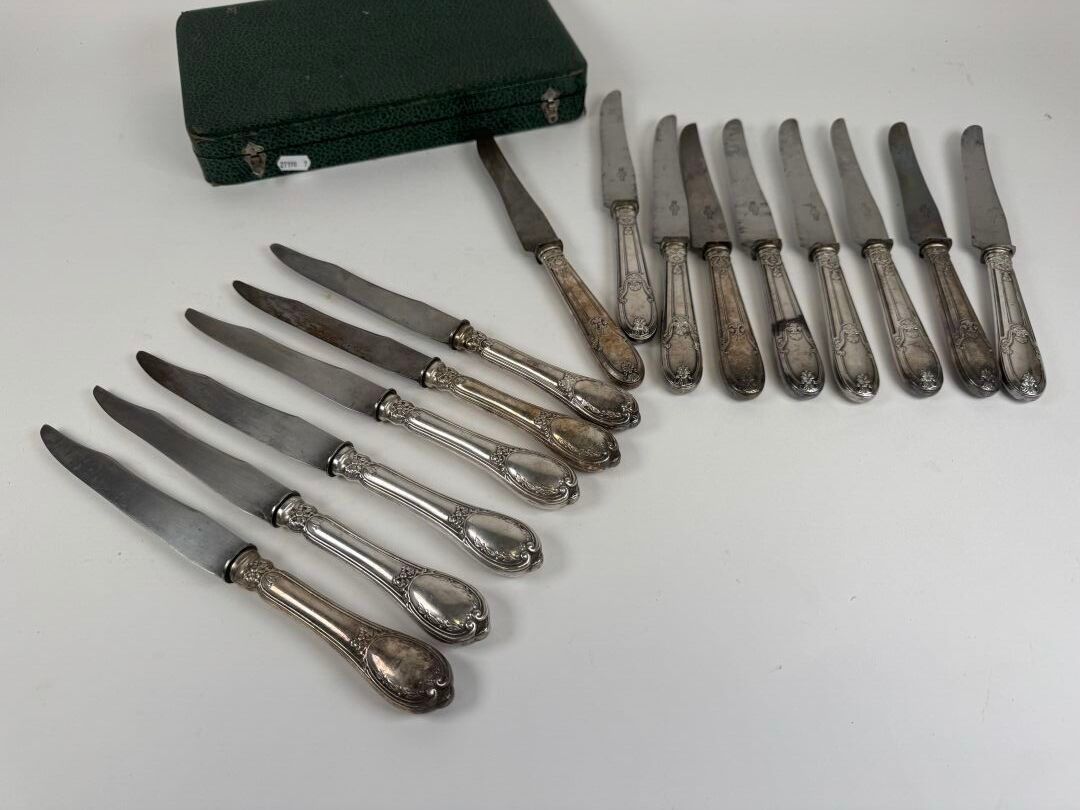 Set of 15 silver-plated knives with steel blades decorated with foliate cartouches.