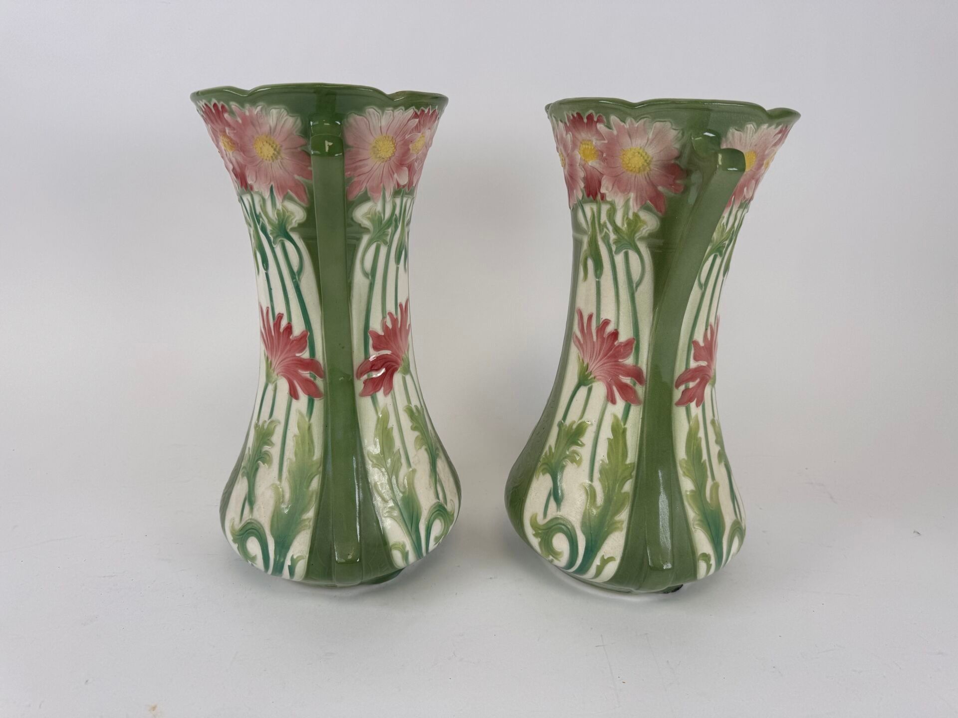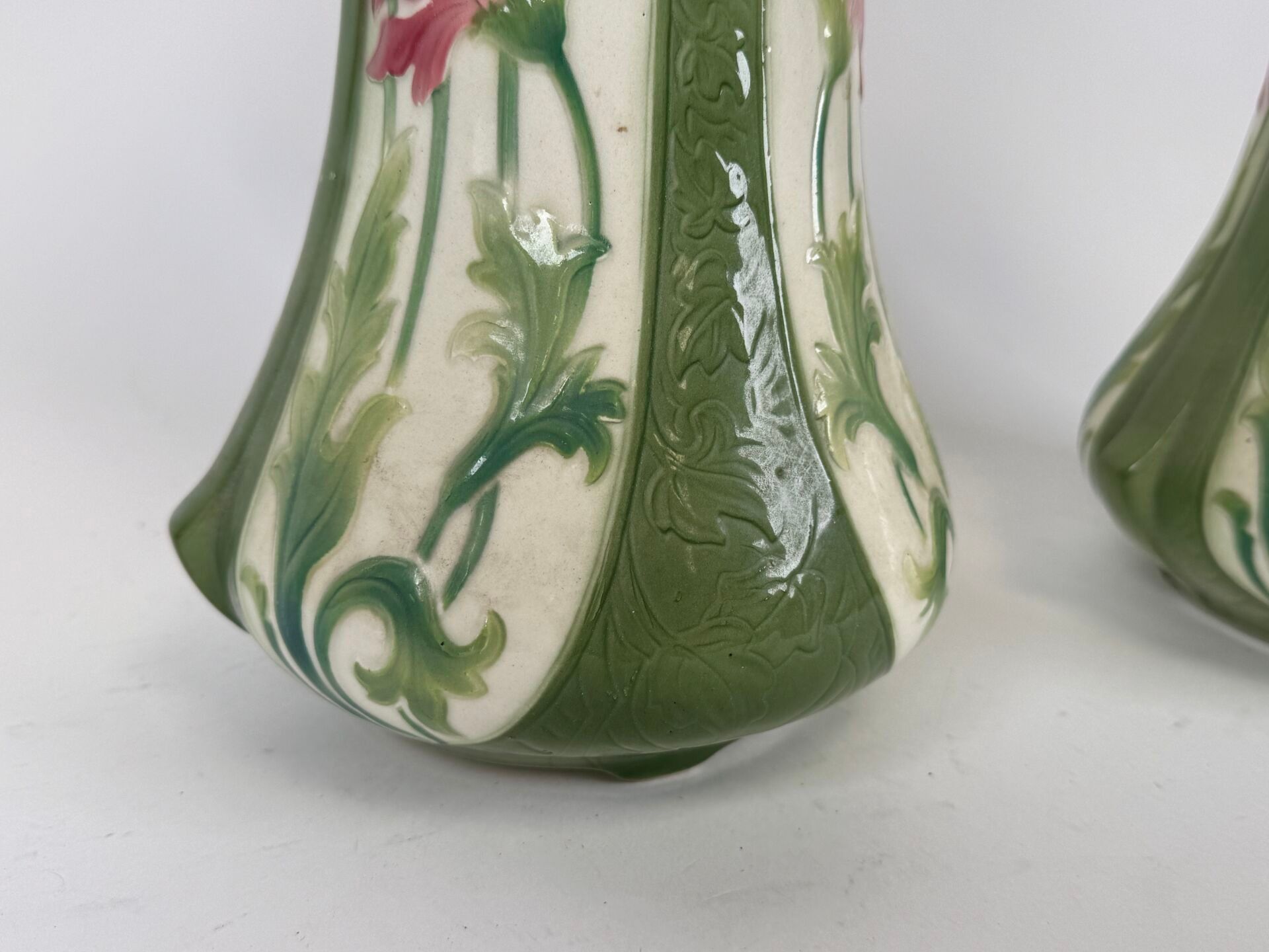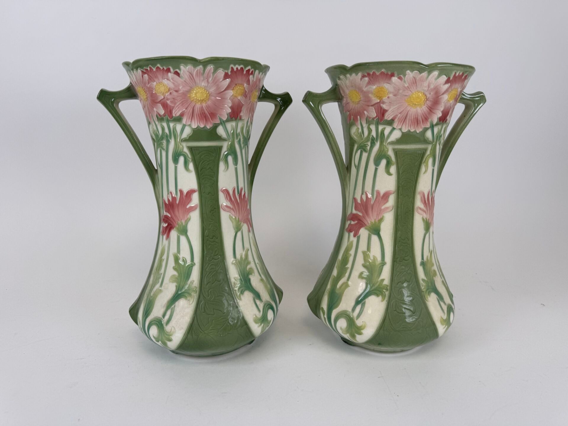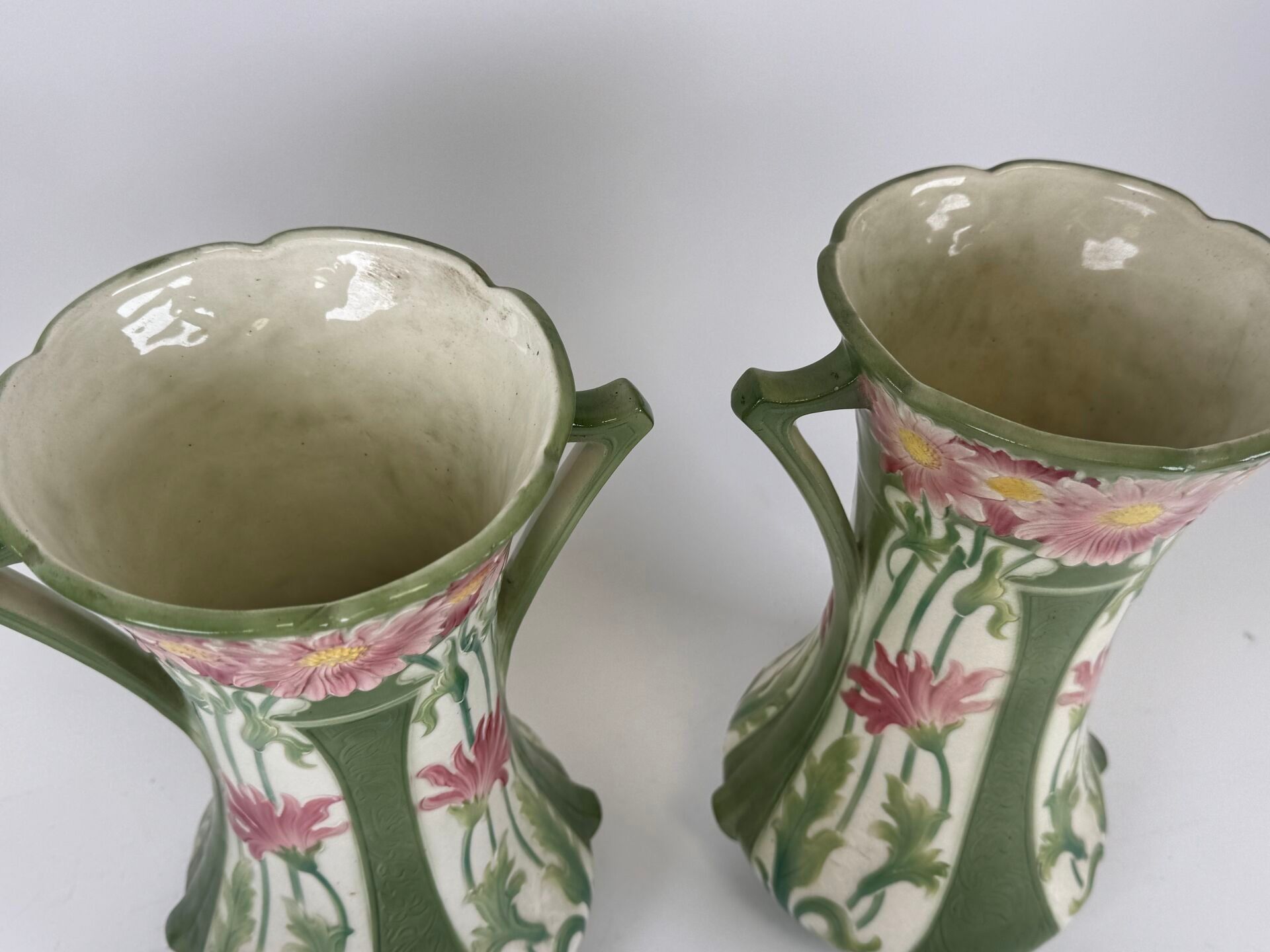 Pair of polychrome ceramic vases with two handles decorated with flowers.
