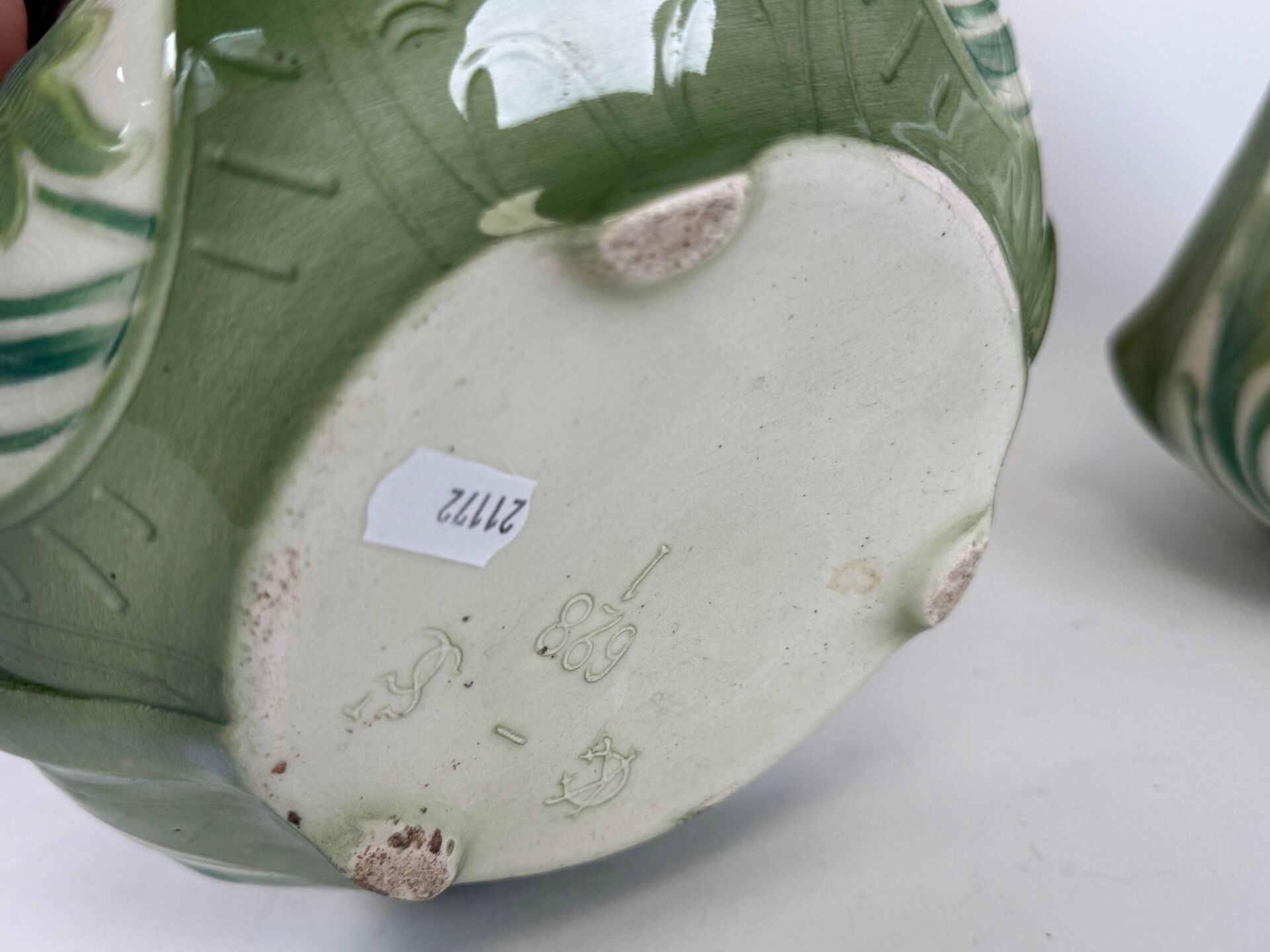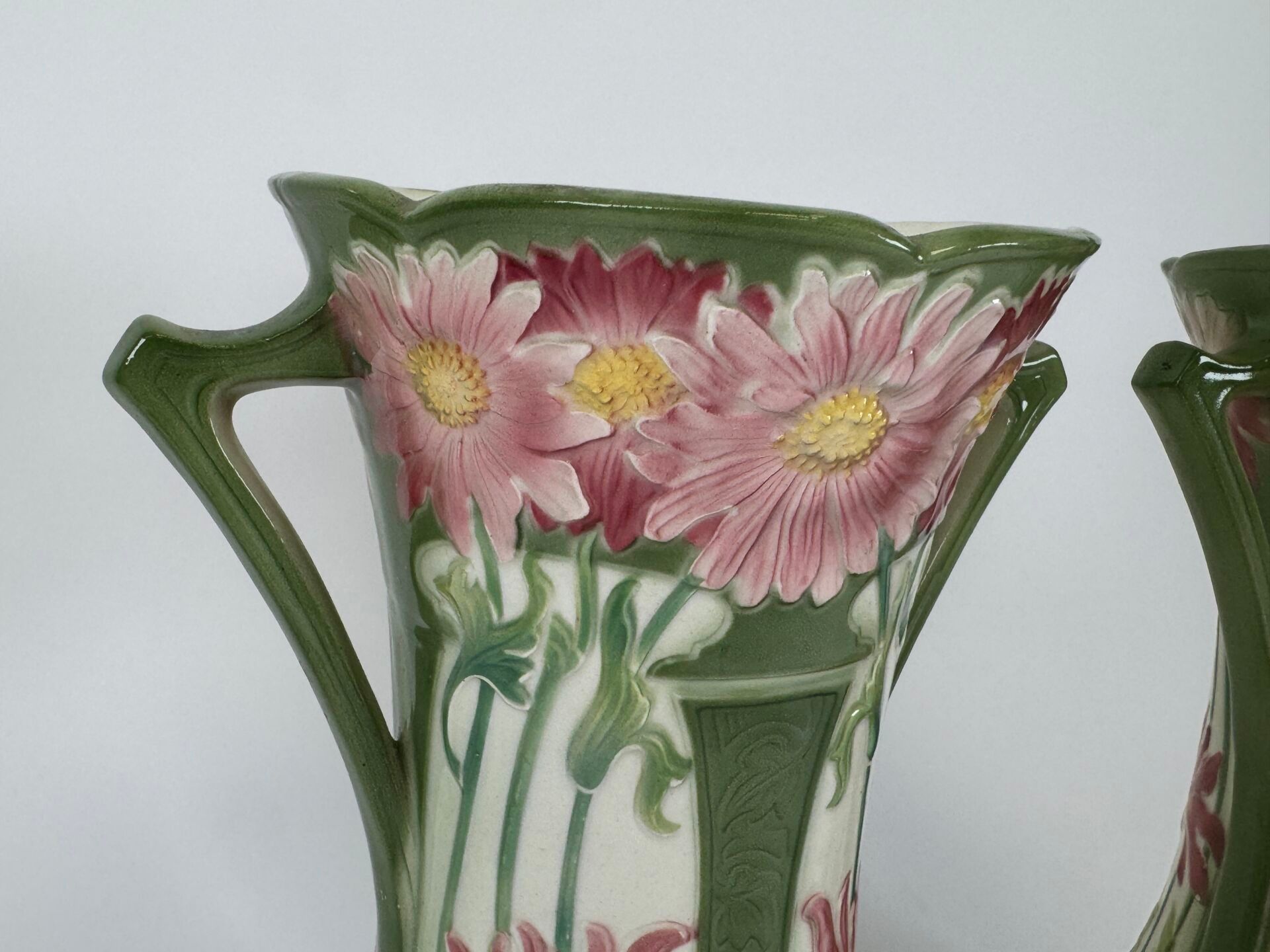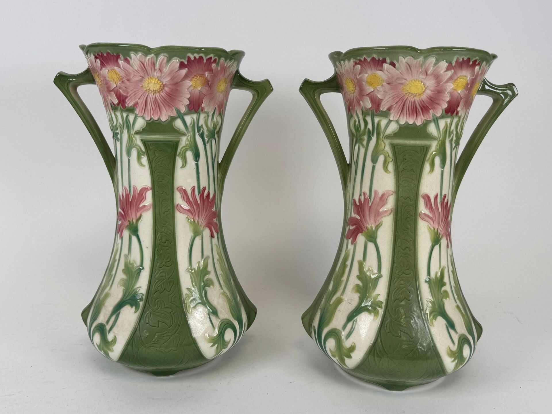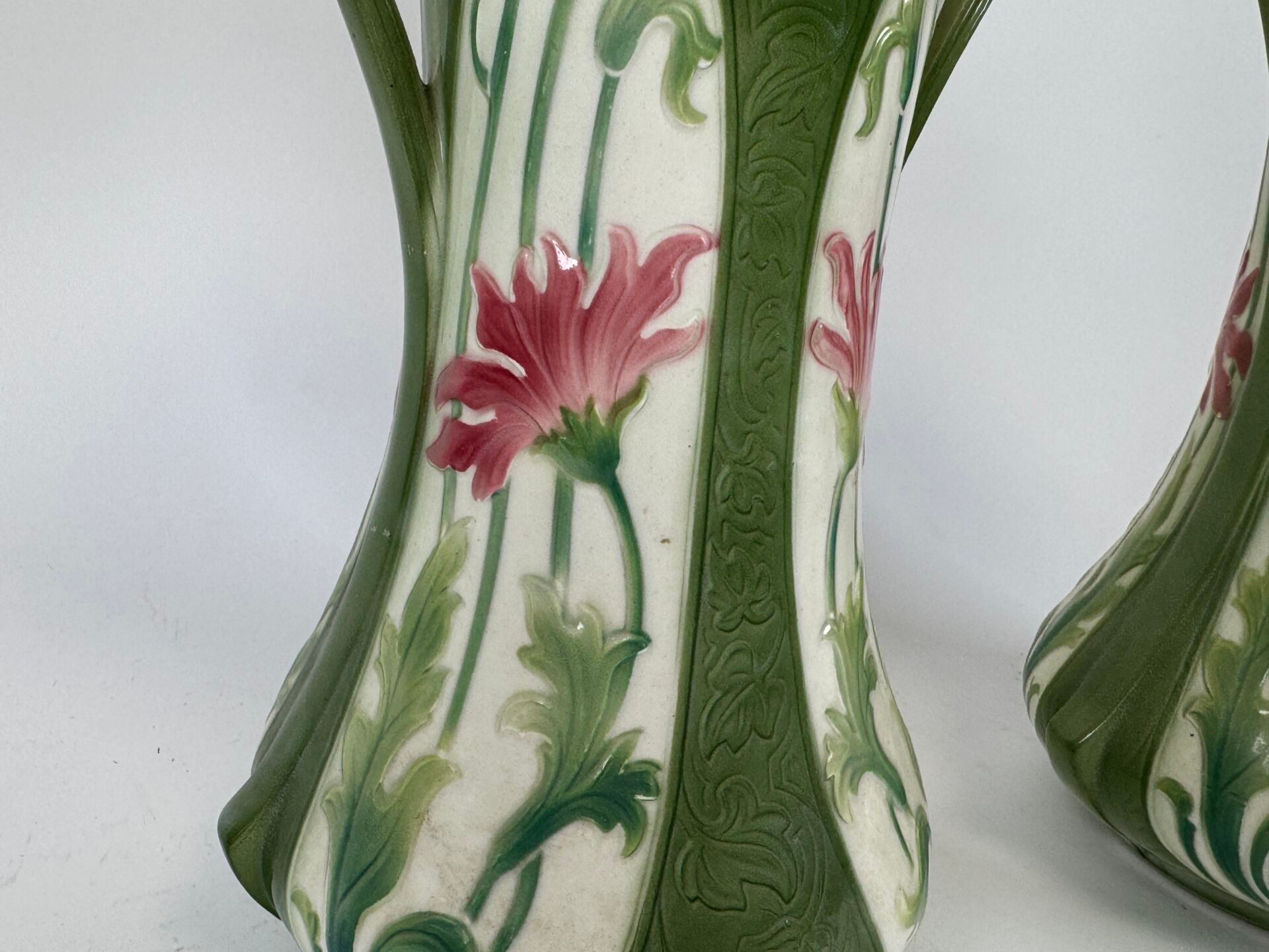 Pair of polychrome ceramic vases with two handles decorated with flowers.