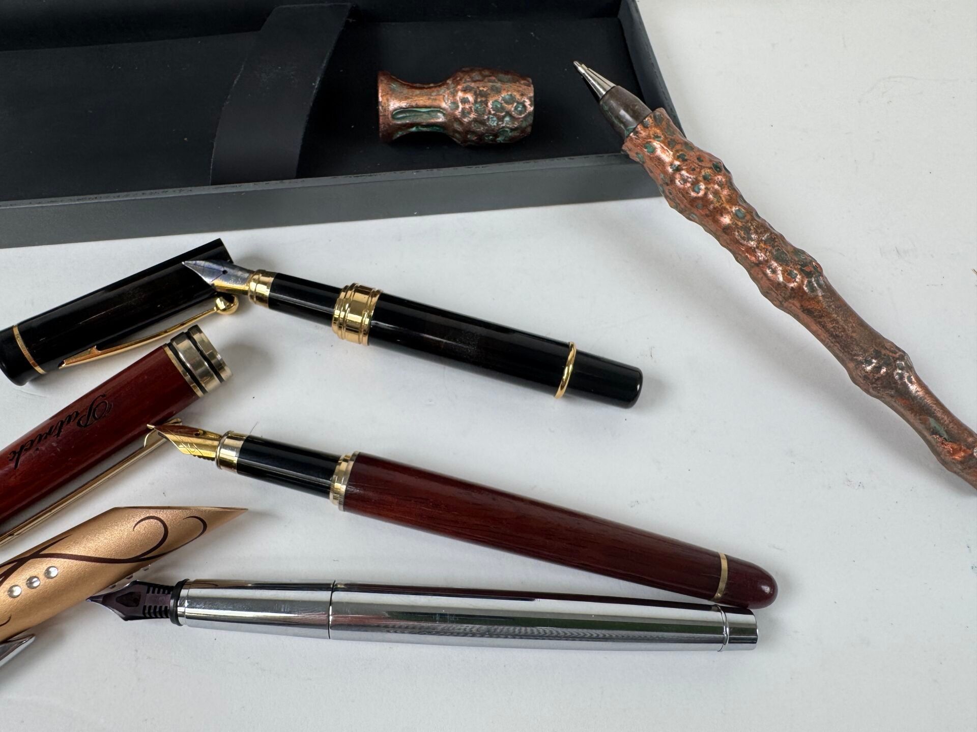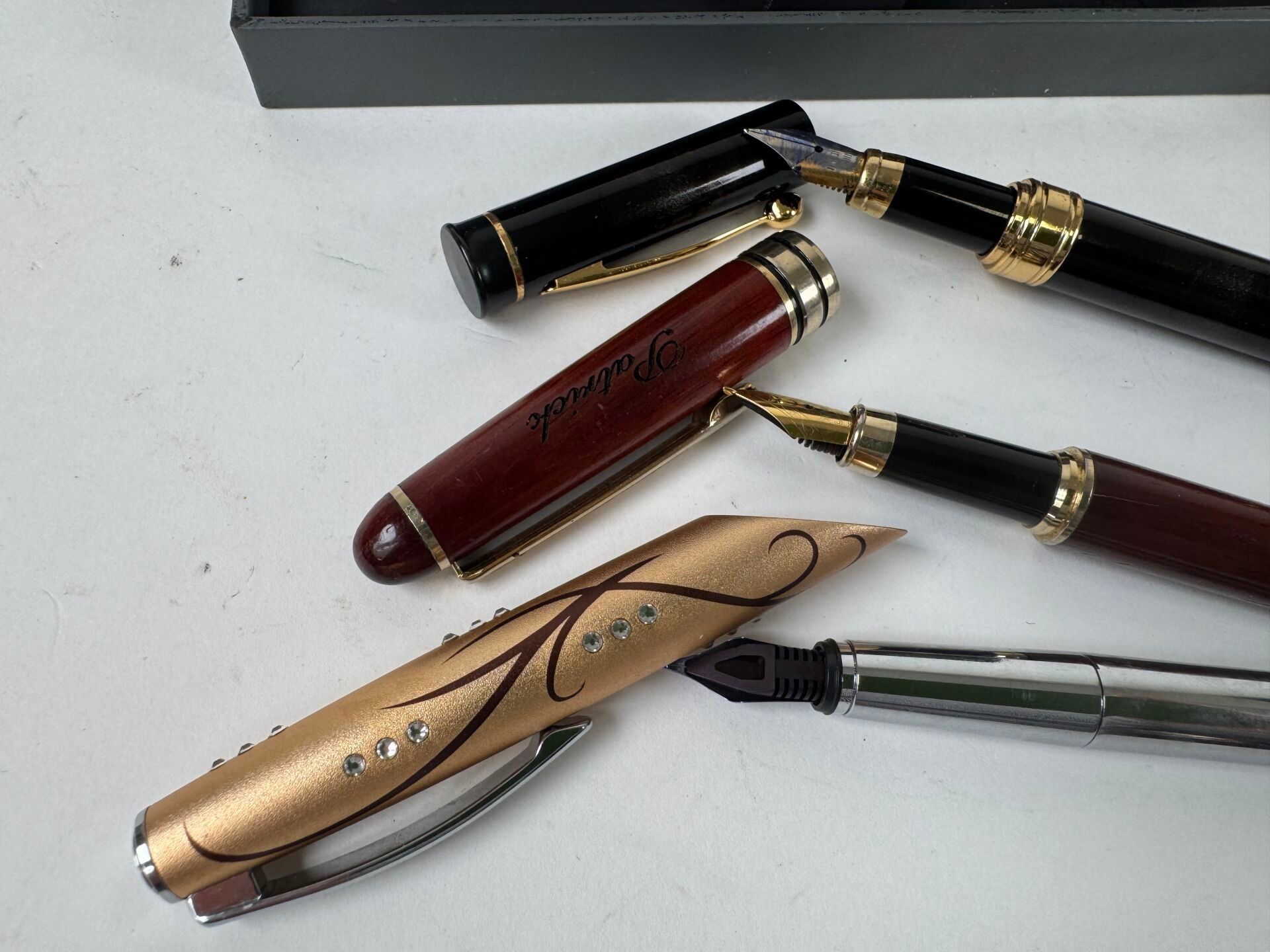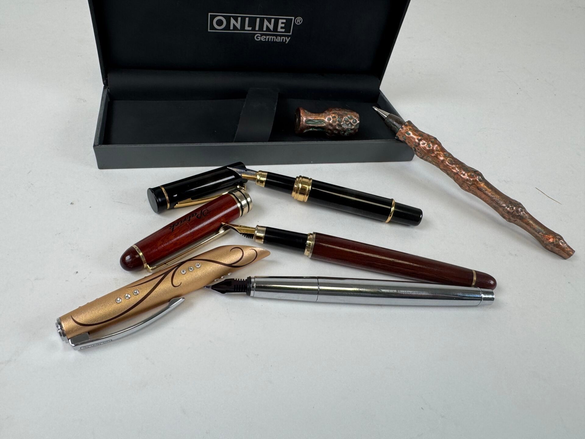 Set of 3 modern fountain pens including ONLINE (in original case), MARKSMAN, GENIUS (Patrick engraved wooden barrel).