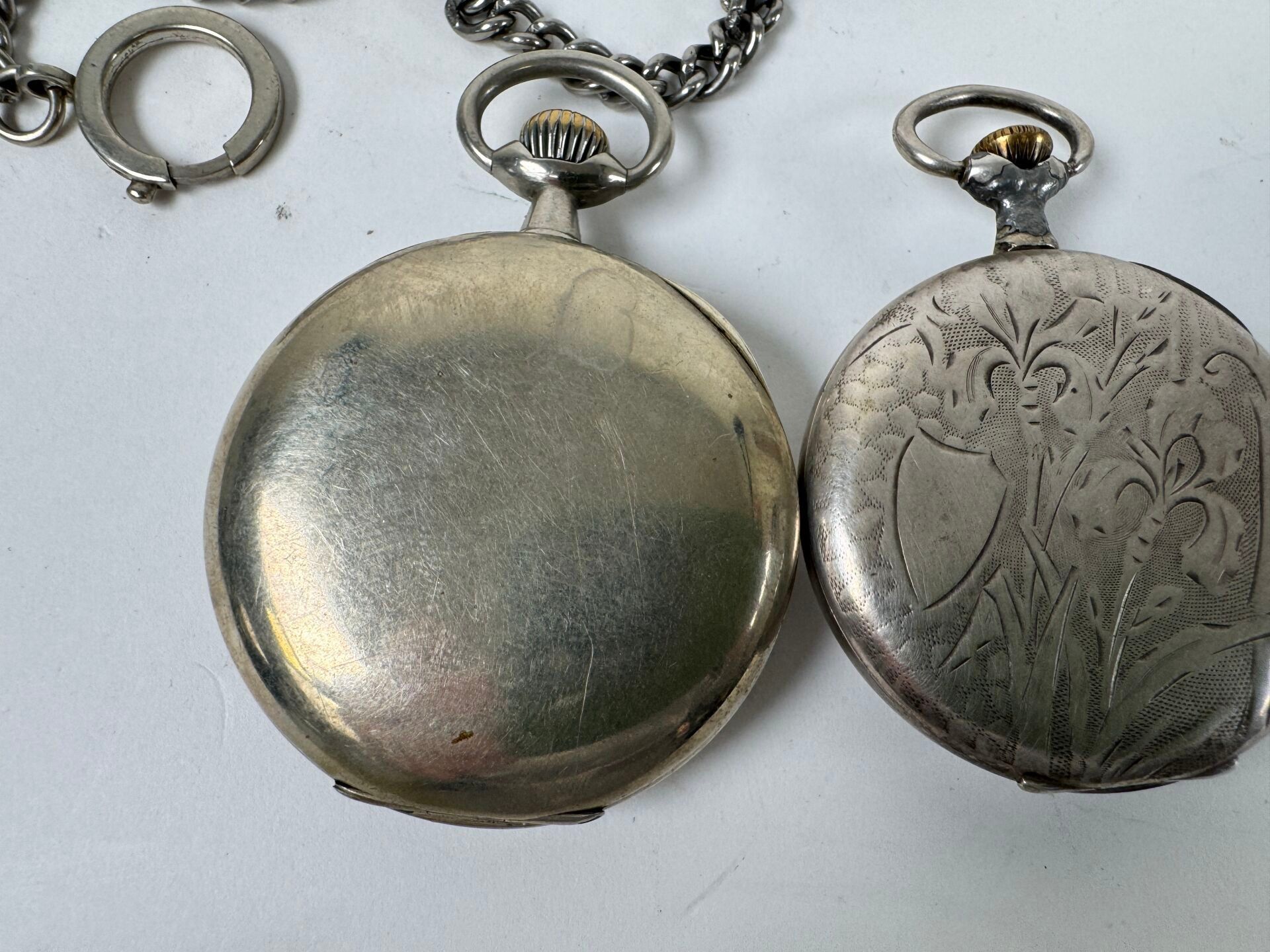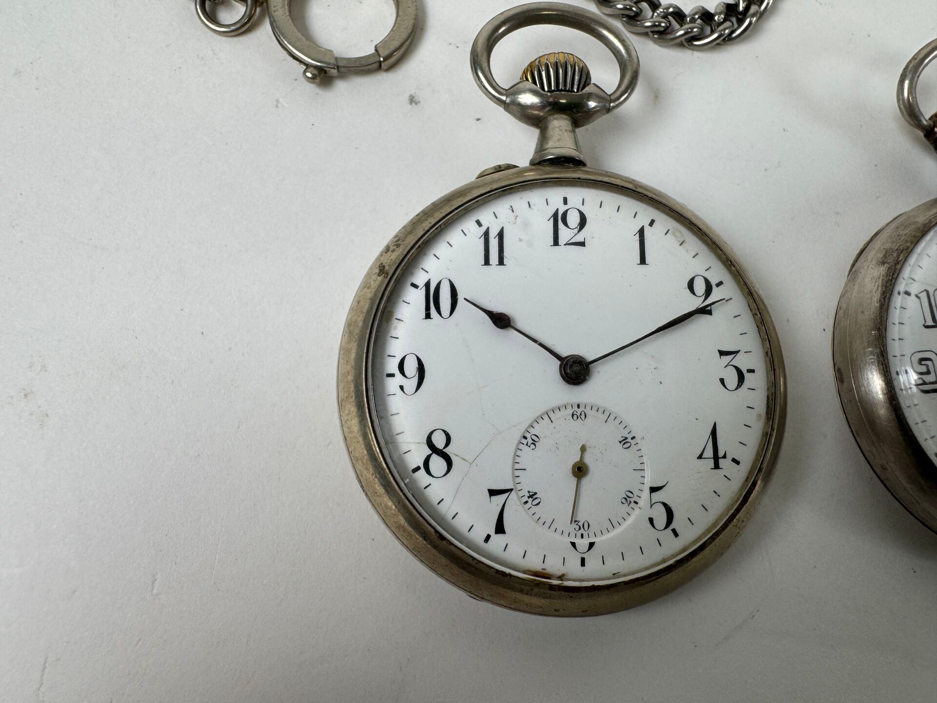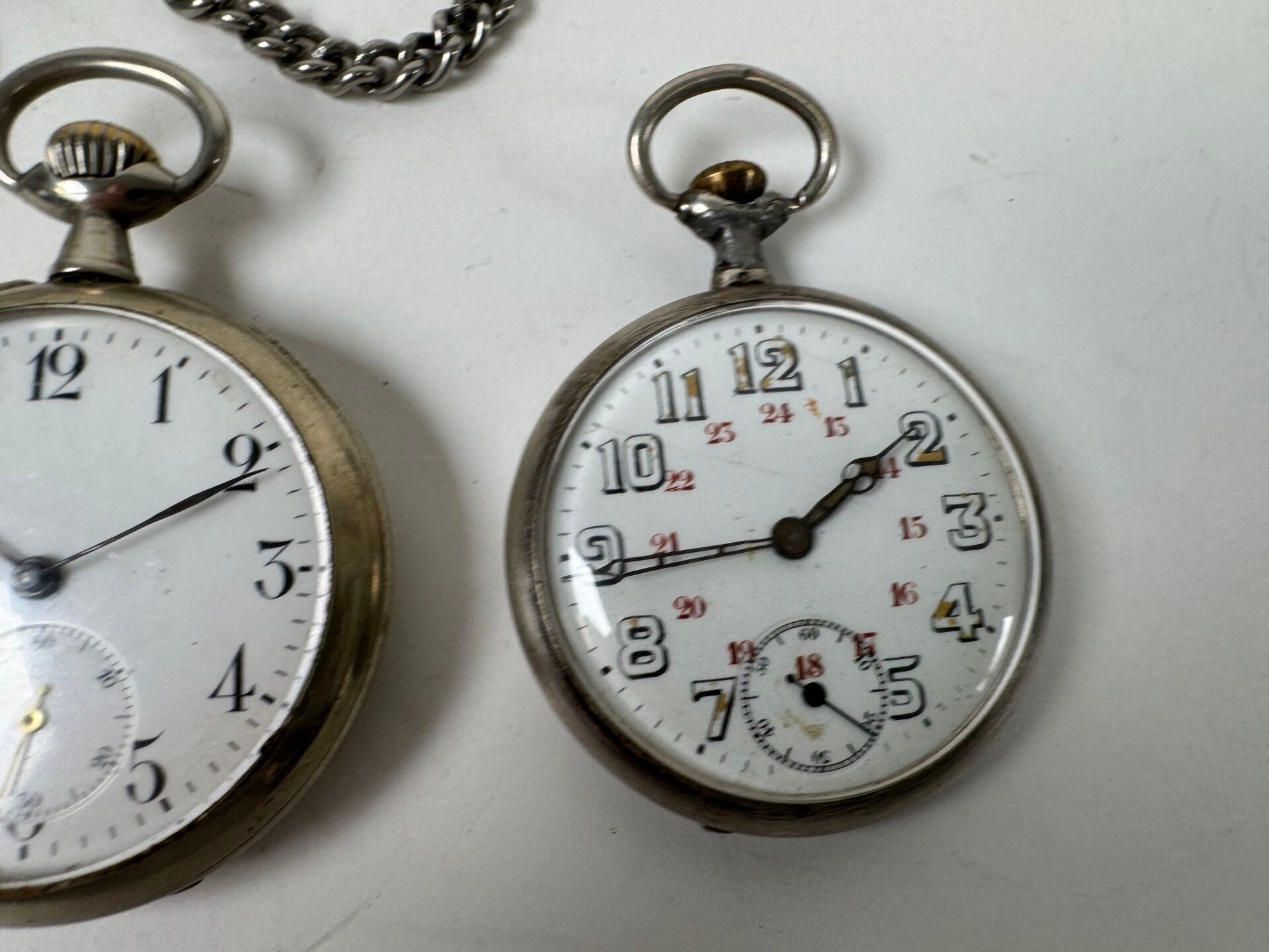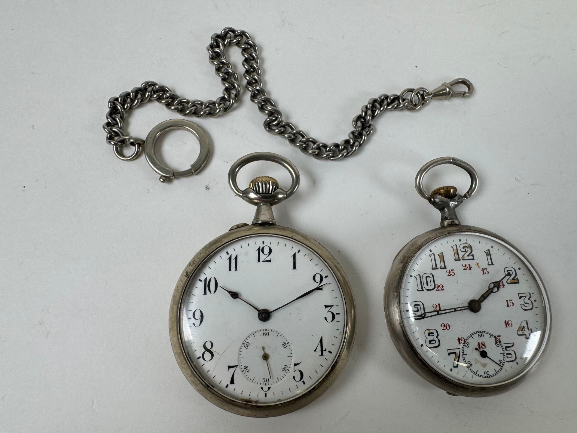 Attached is a metal pocket watch, mechanical movement with manual winding, white enamelled dial with hours in Arabic numerals, seconds totalizer at 6 o'clock, smooth case back.
