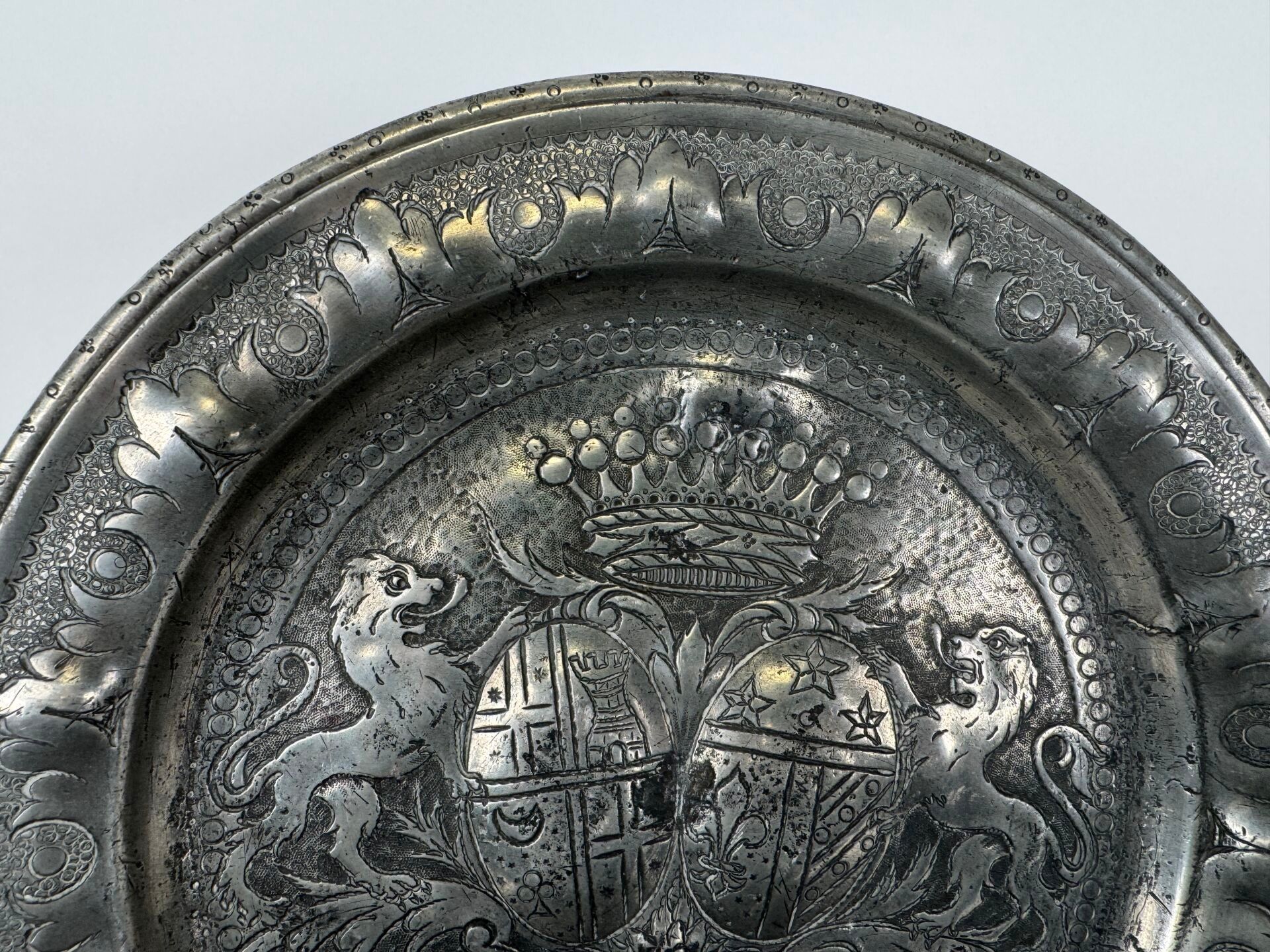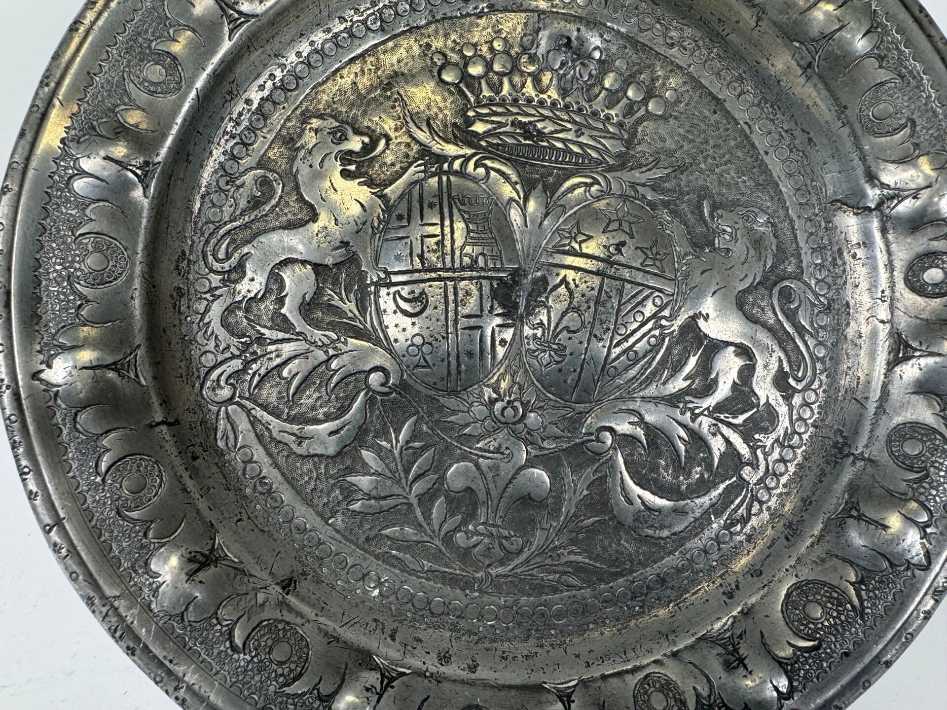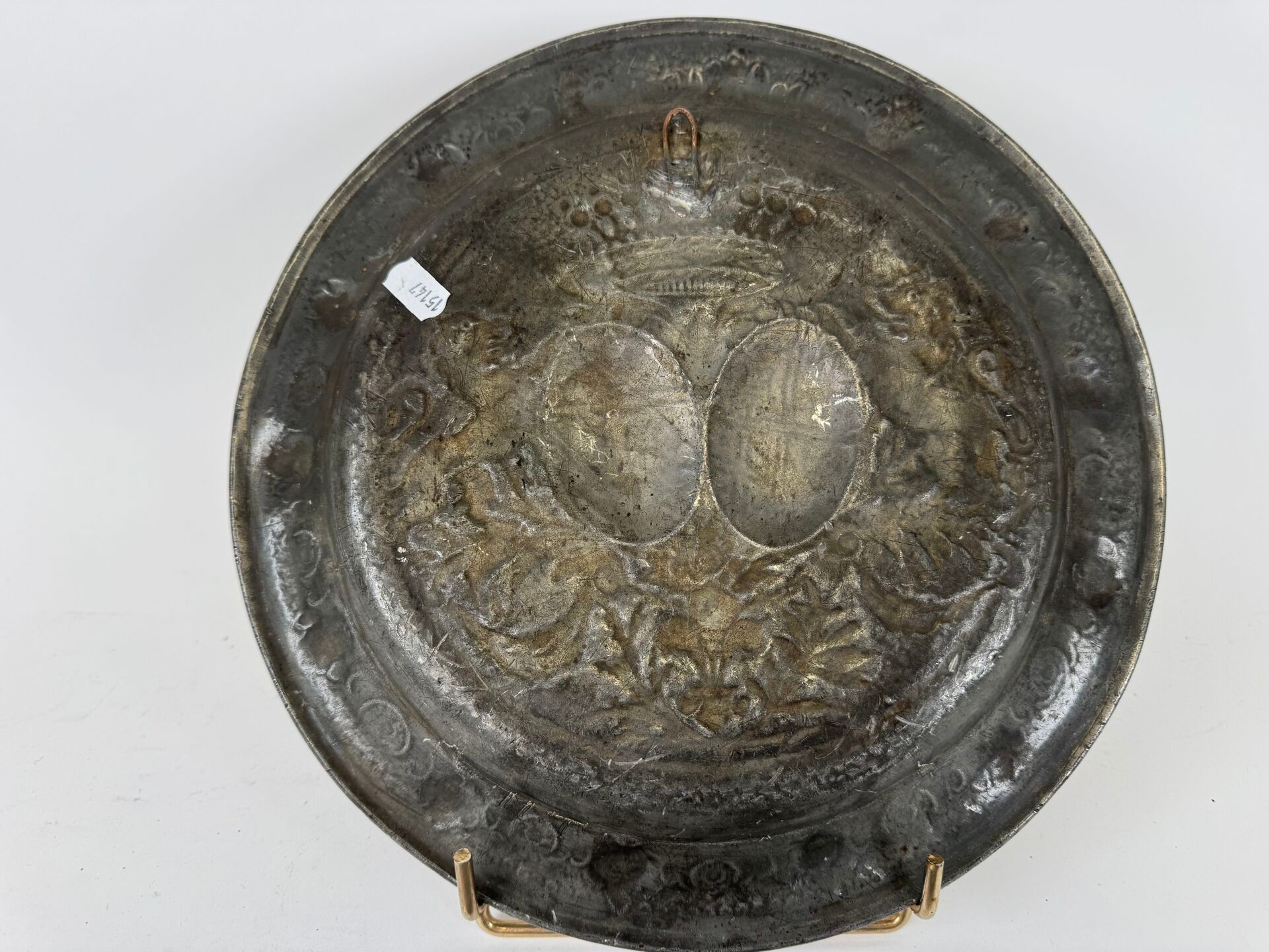 Circular pewter dish and plates, one of which is embossed with coats of arms and lions with a count's crown.