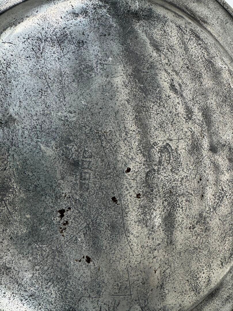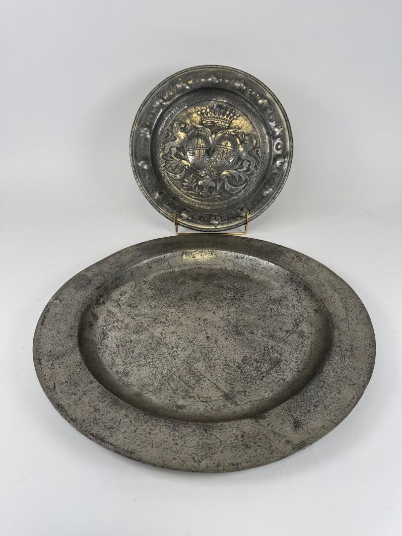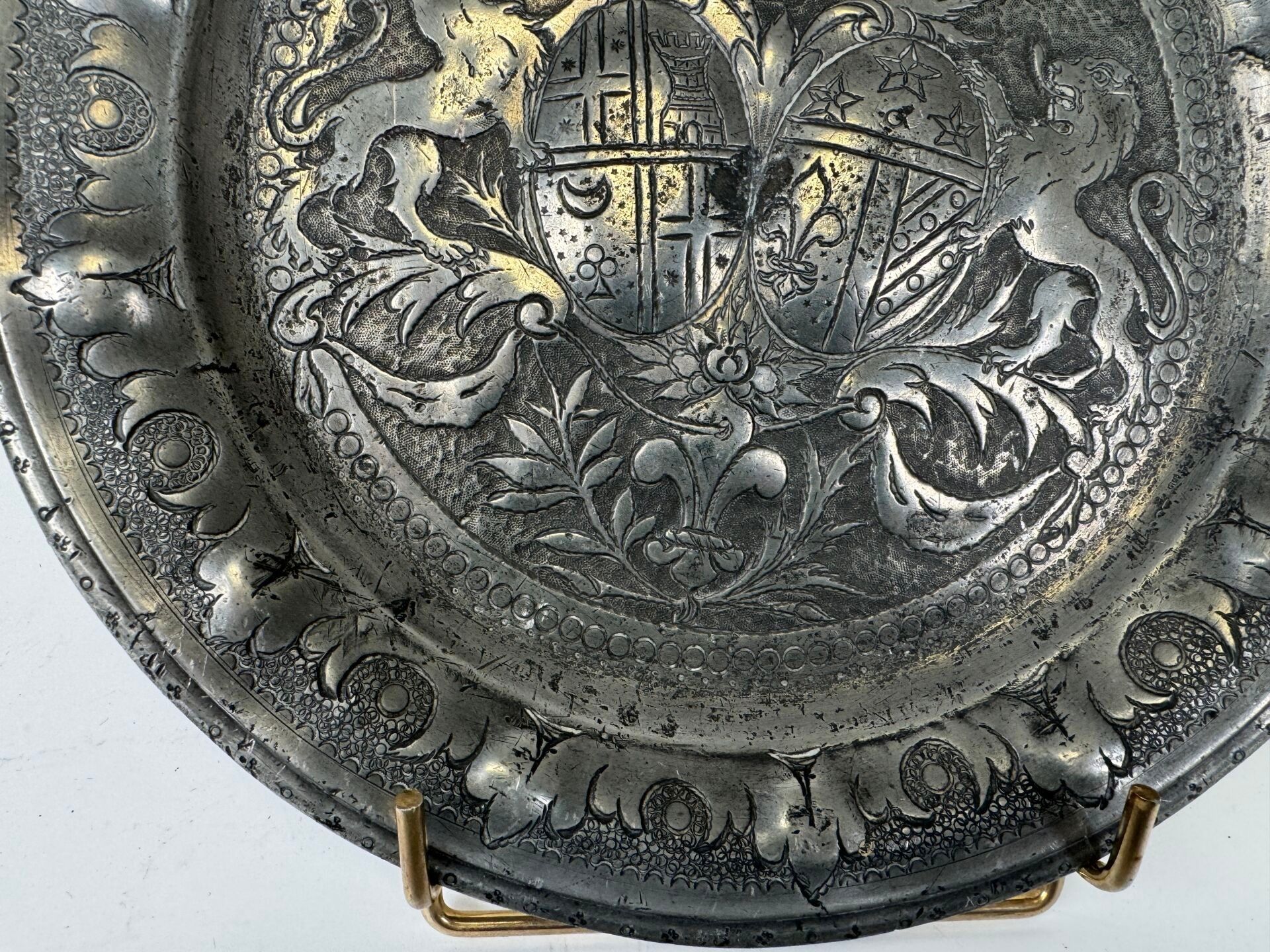 Circular pewter dish and plates, one of which is embossed with coats of arms and lions with a count's crown.