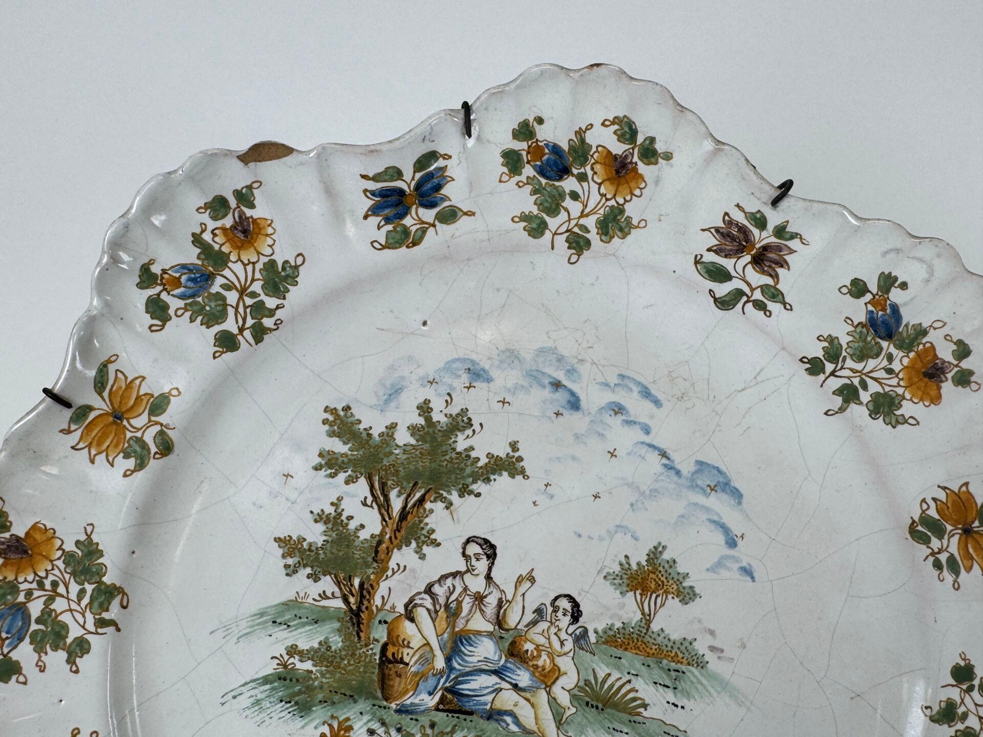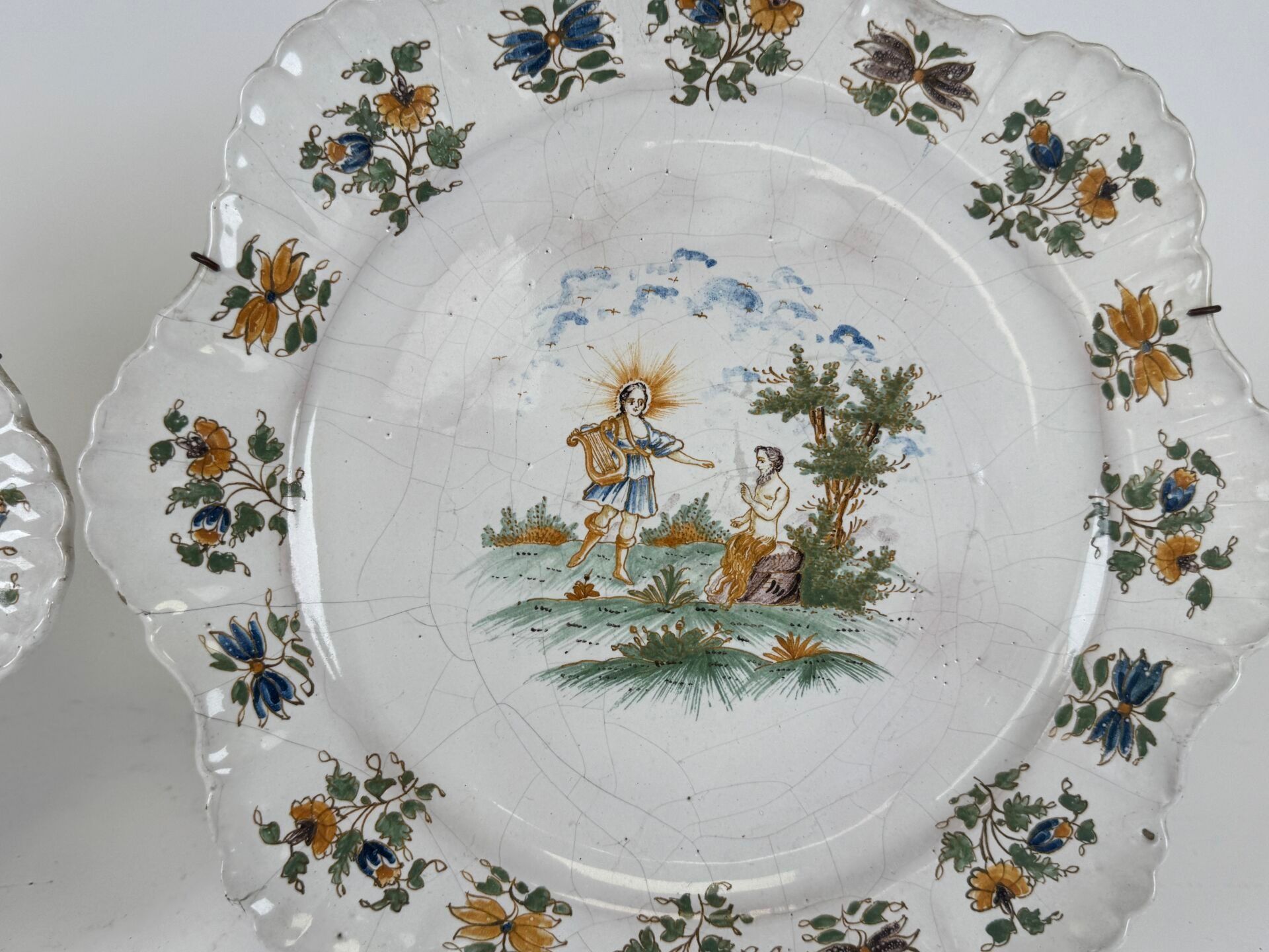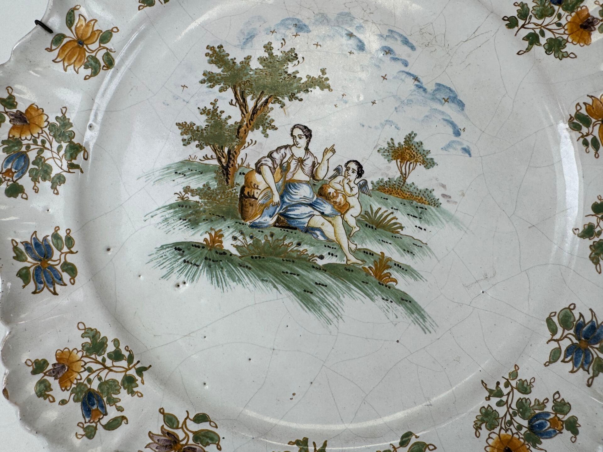 Two polychrome earthenware plates with religious figures and flowers.