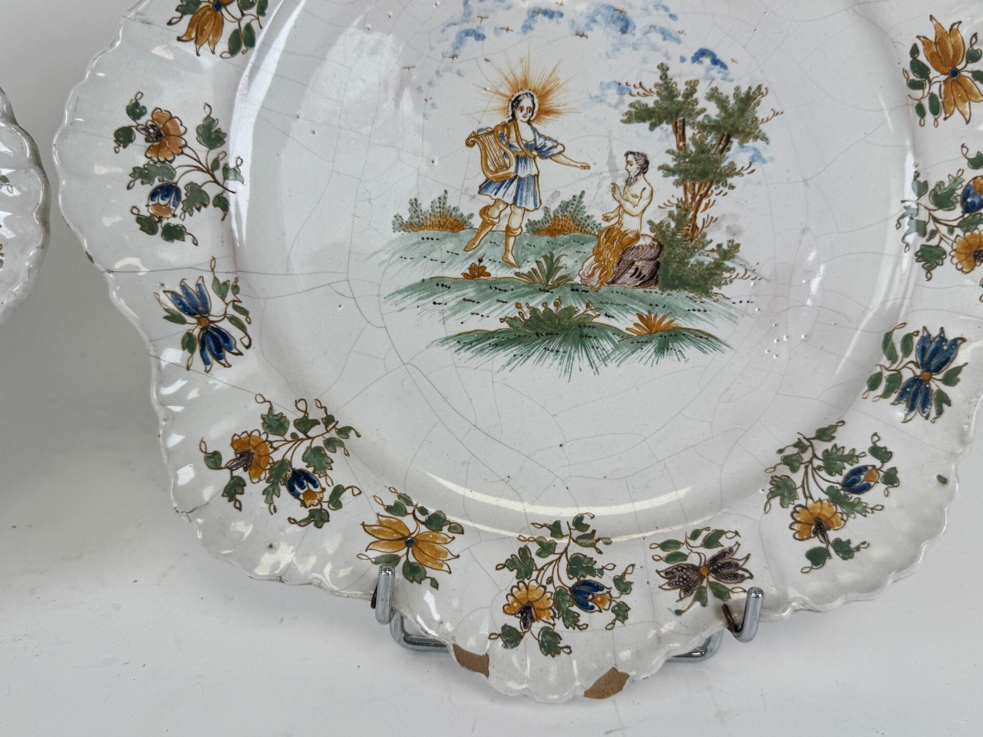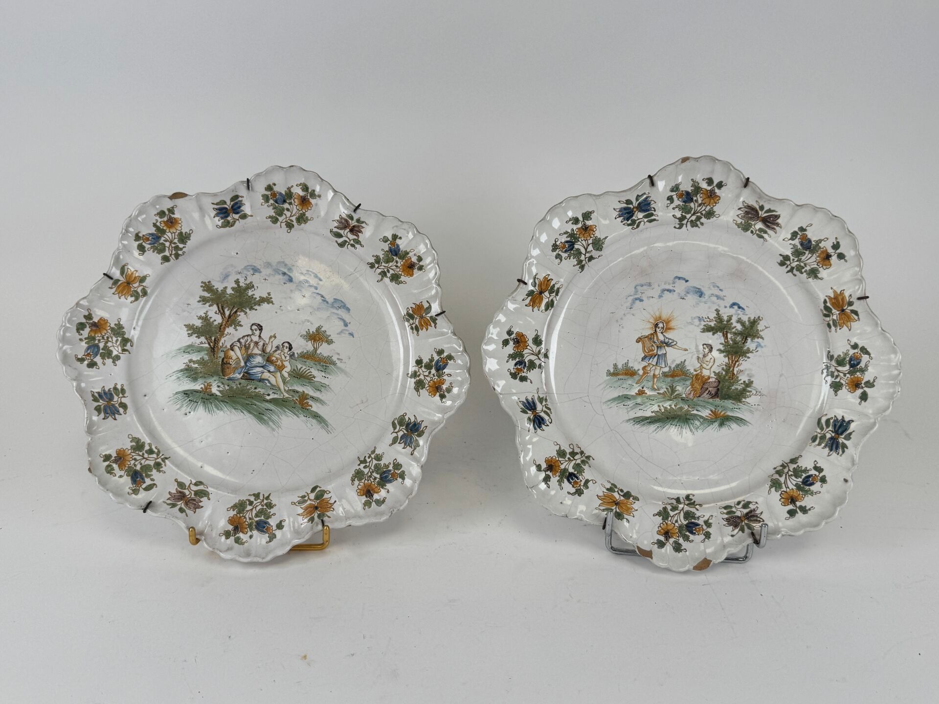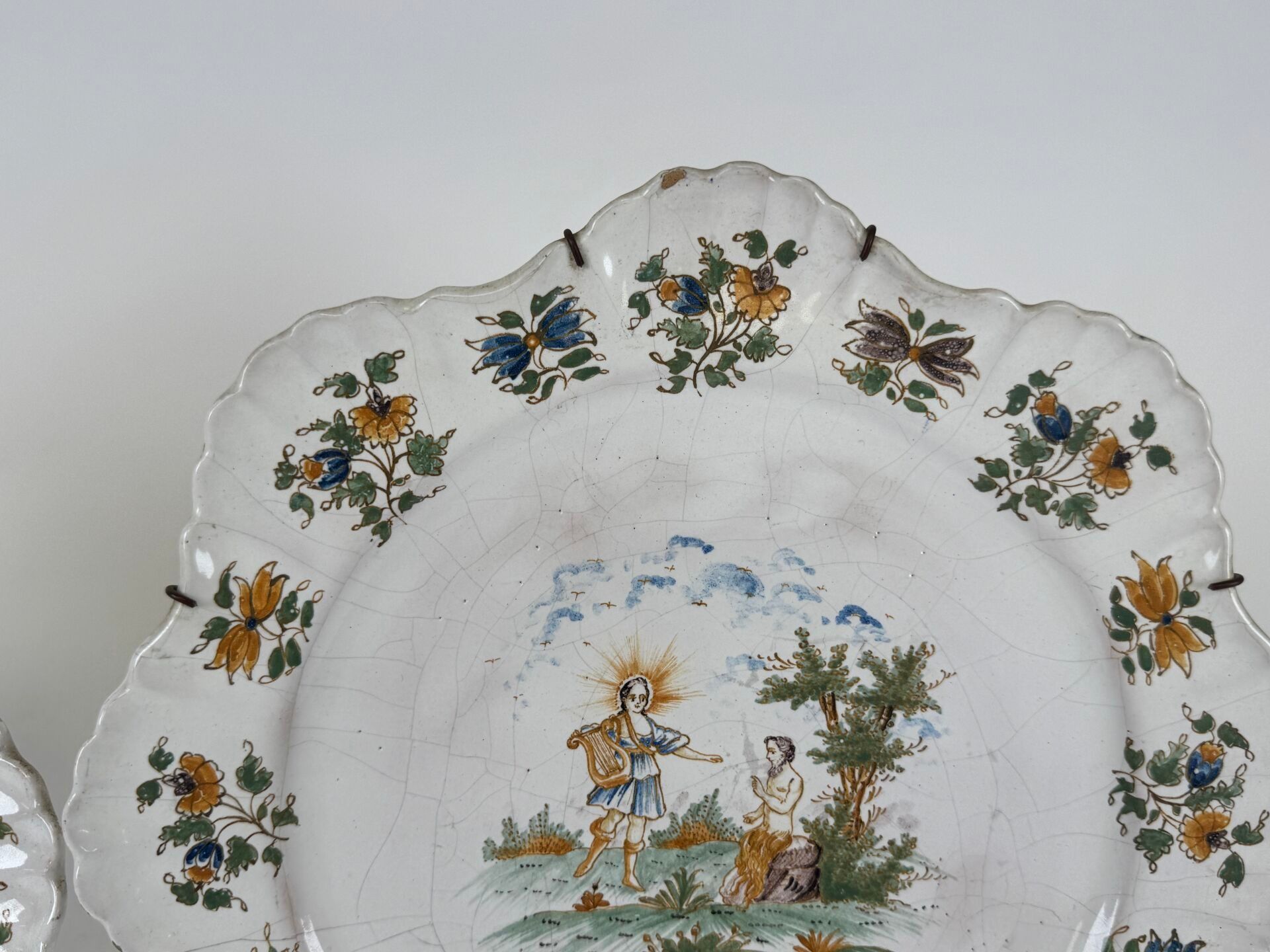 Two polychrome earthenware plates with religious figures and flowers.