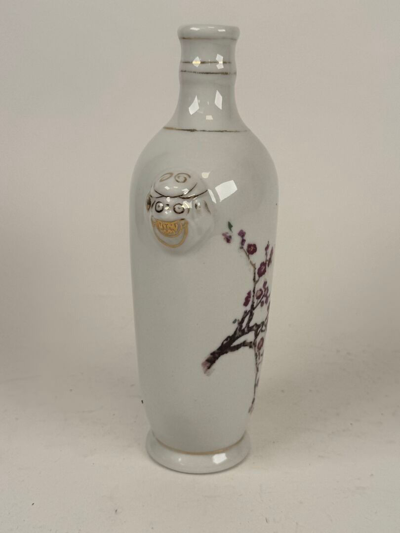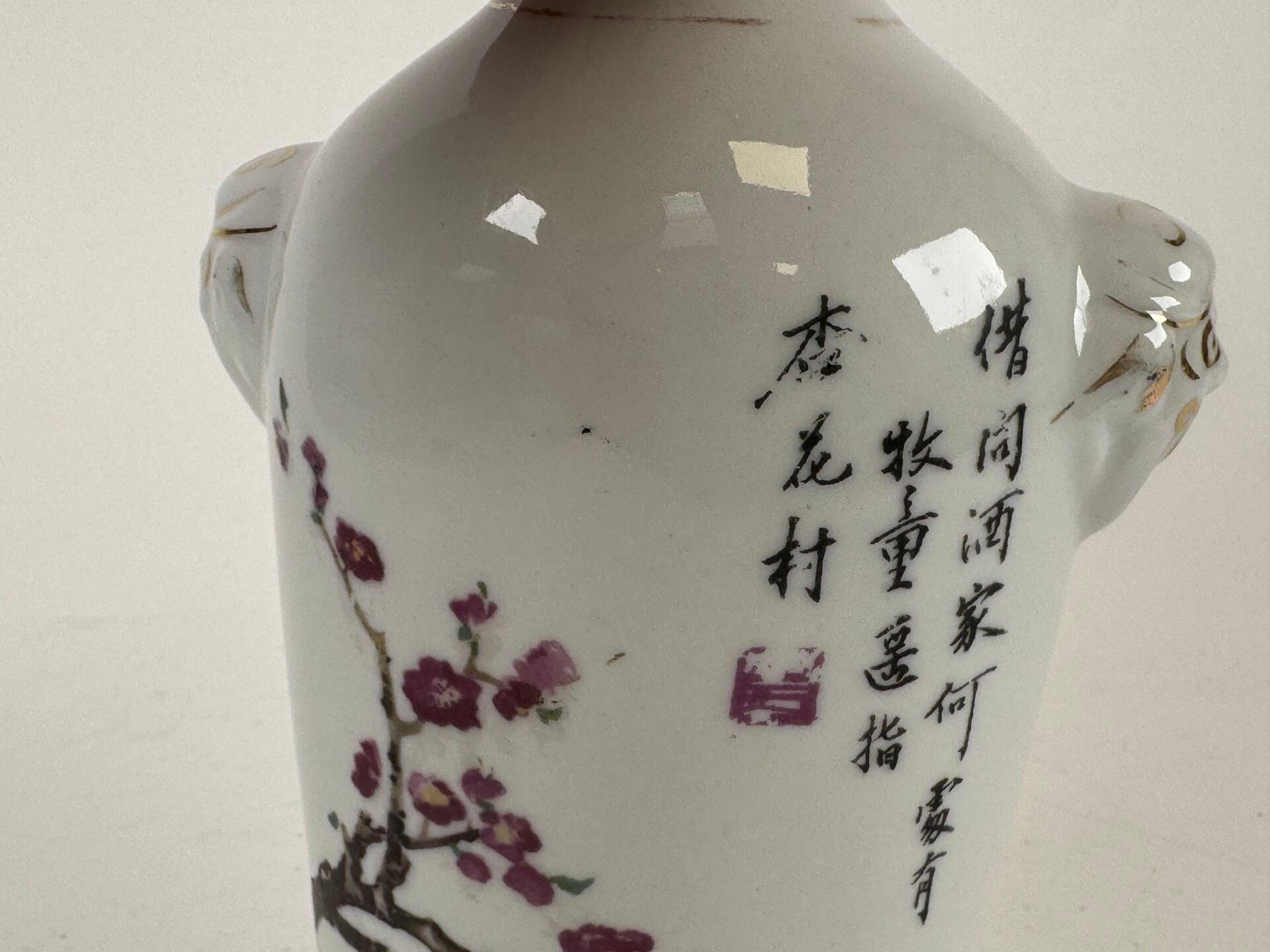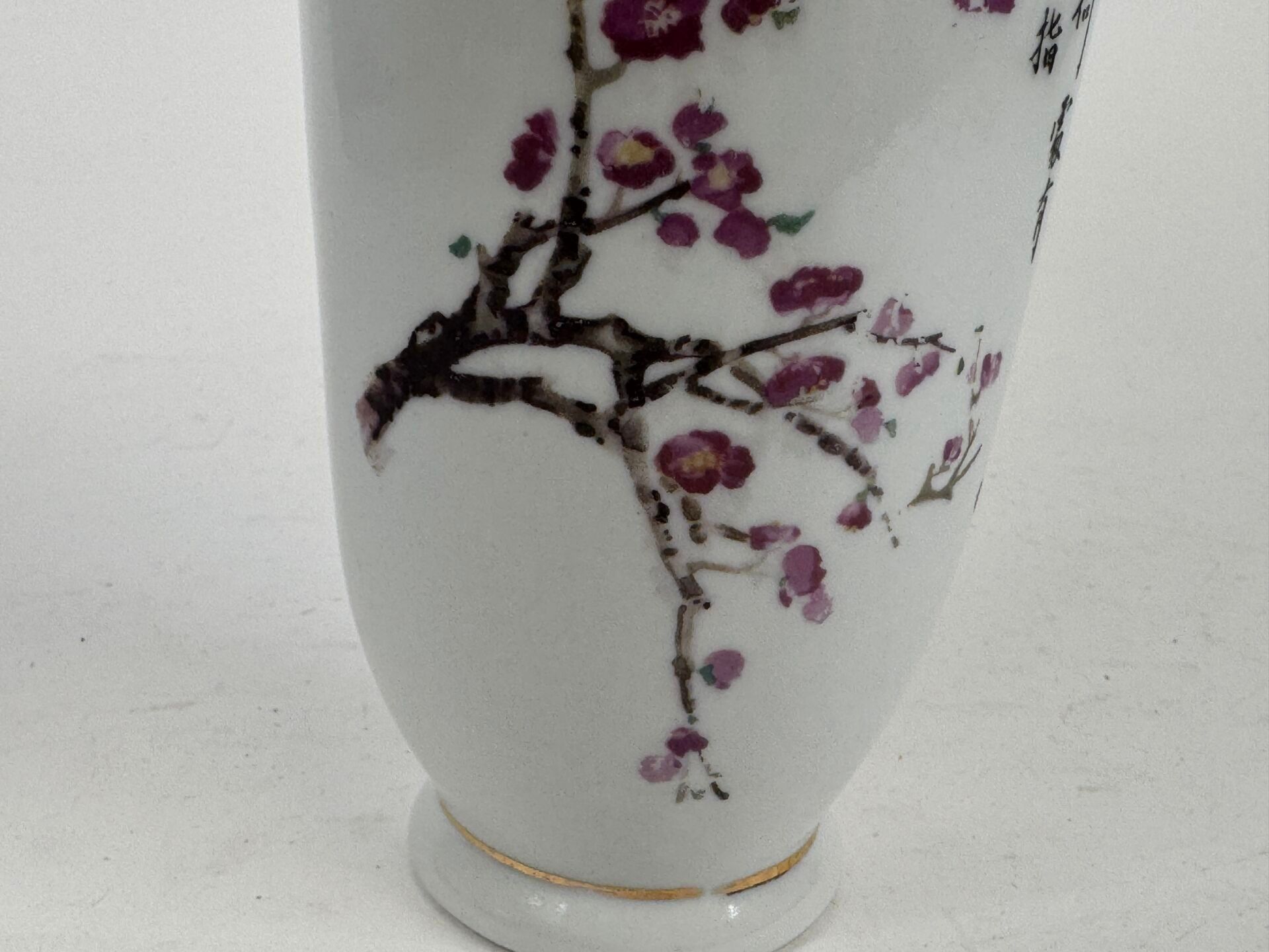 A polychrome and gold porcelain vase decorated with flowering branches and character inscriptions.