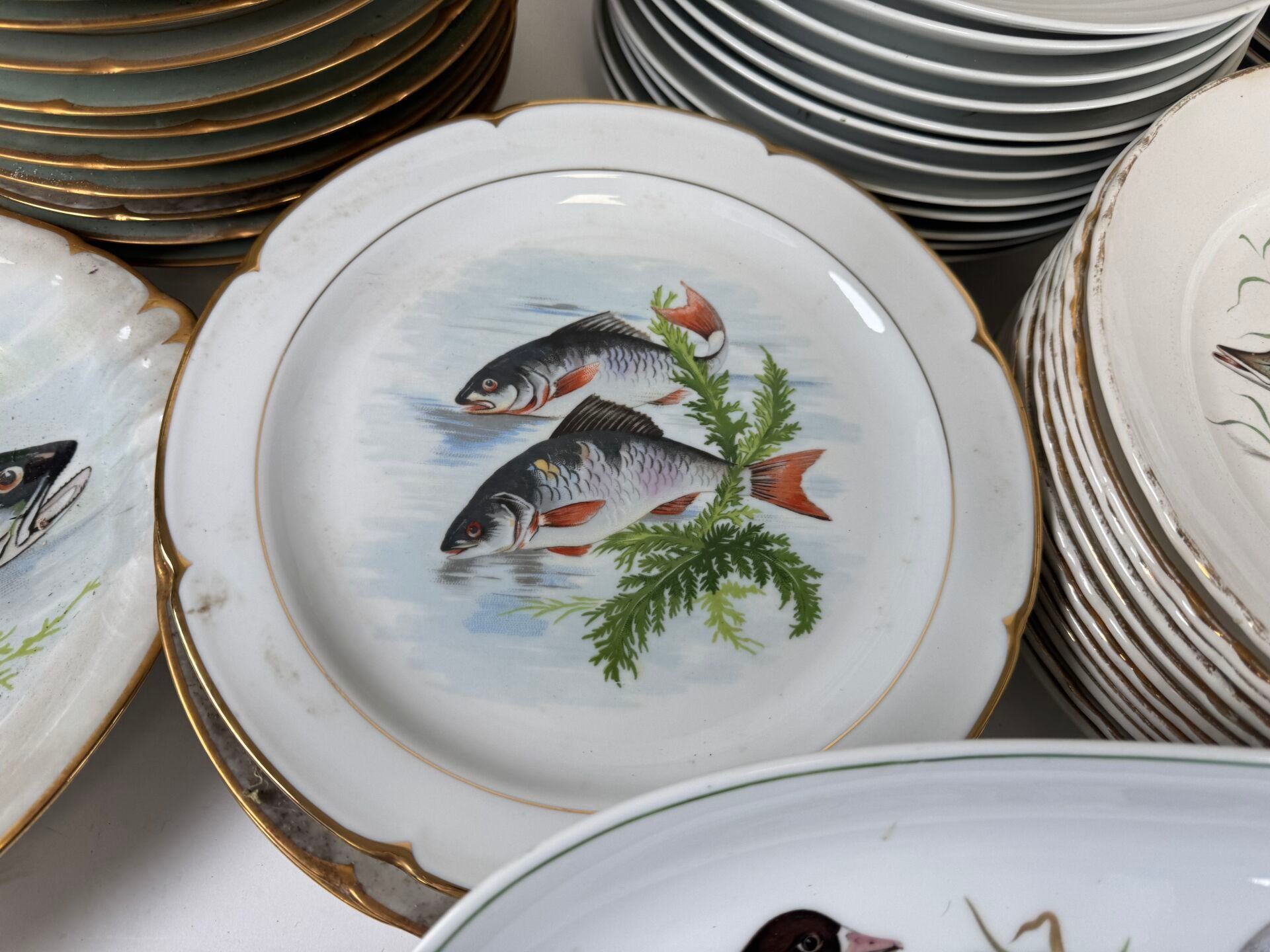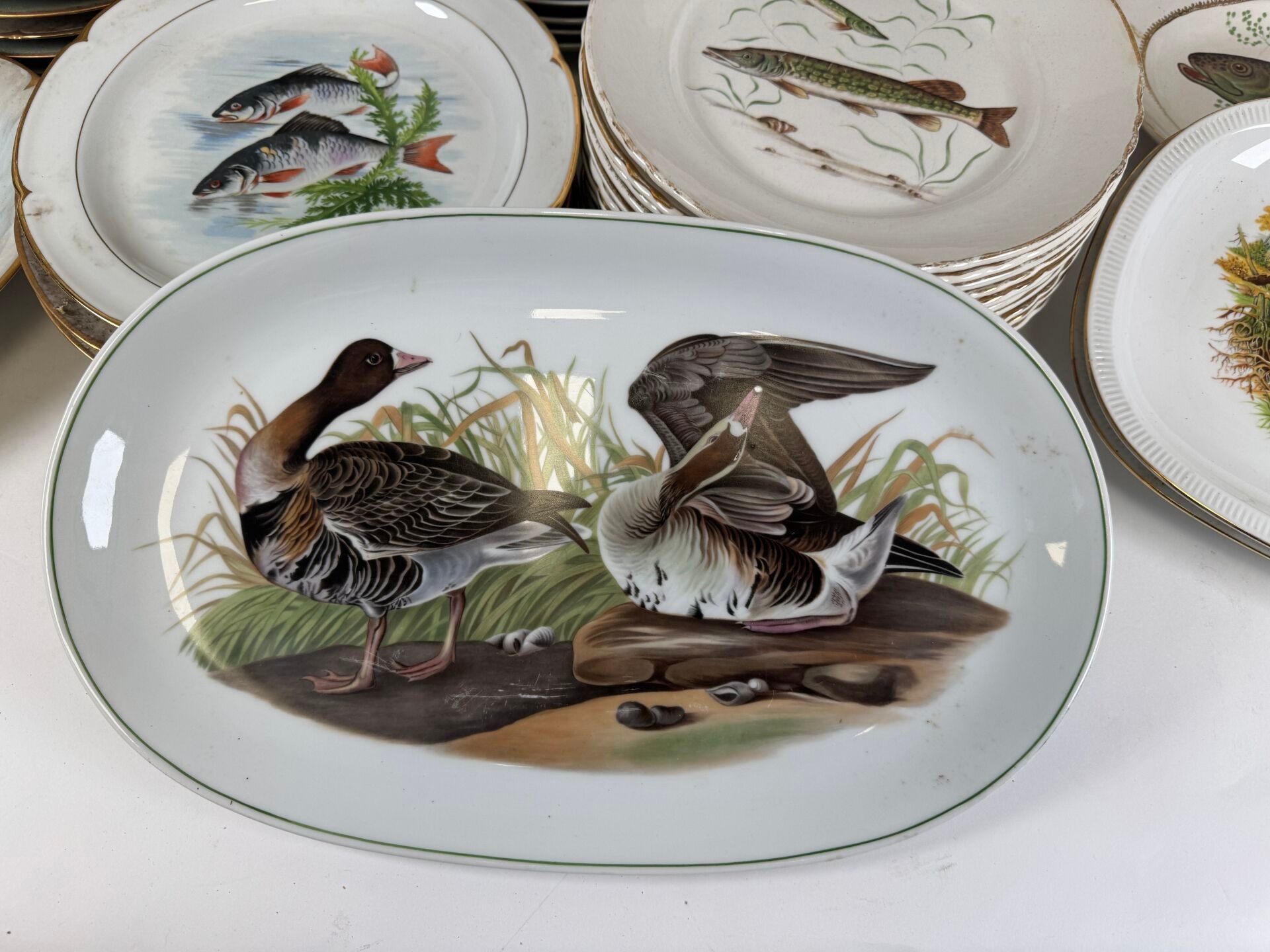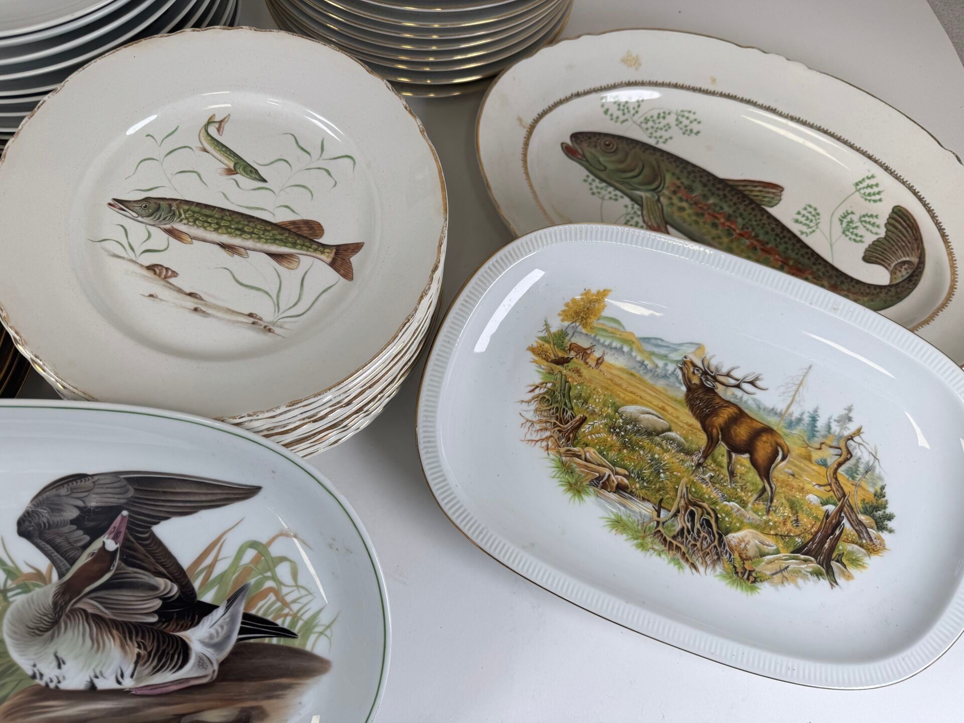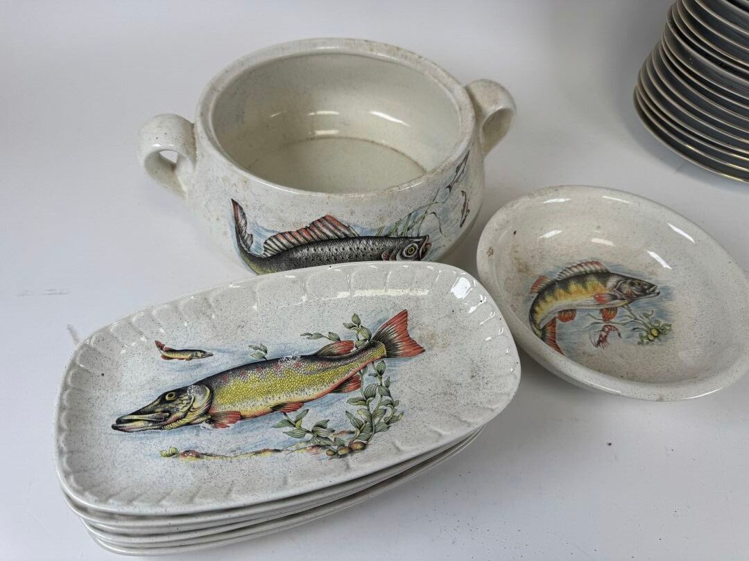 Set of polychrome porcelain and ceramics decorated with fish and on the theme of hunting comprising :