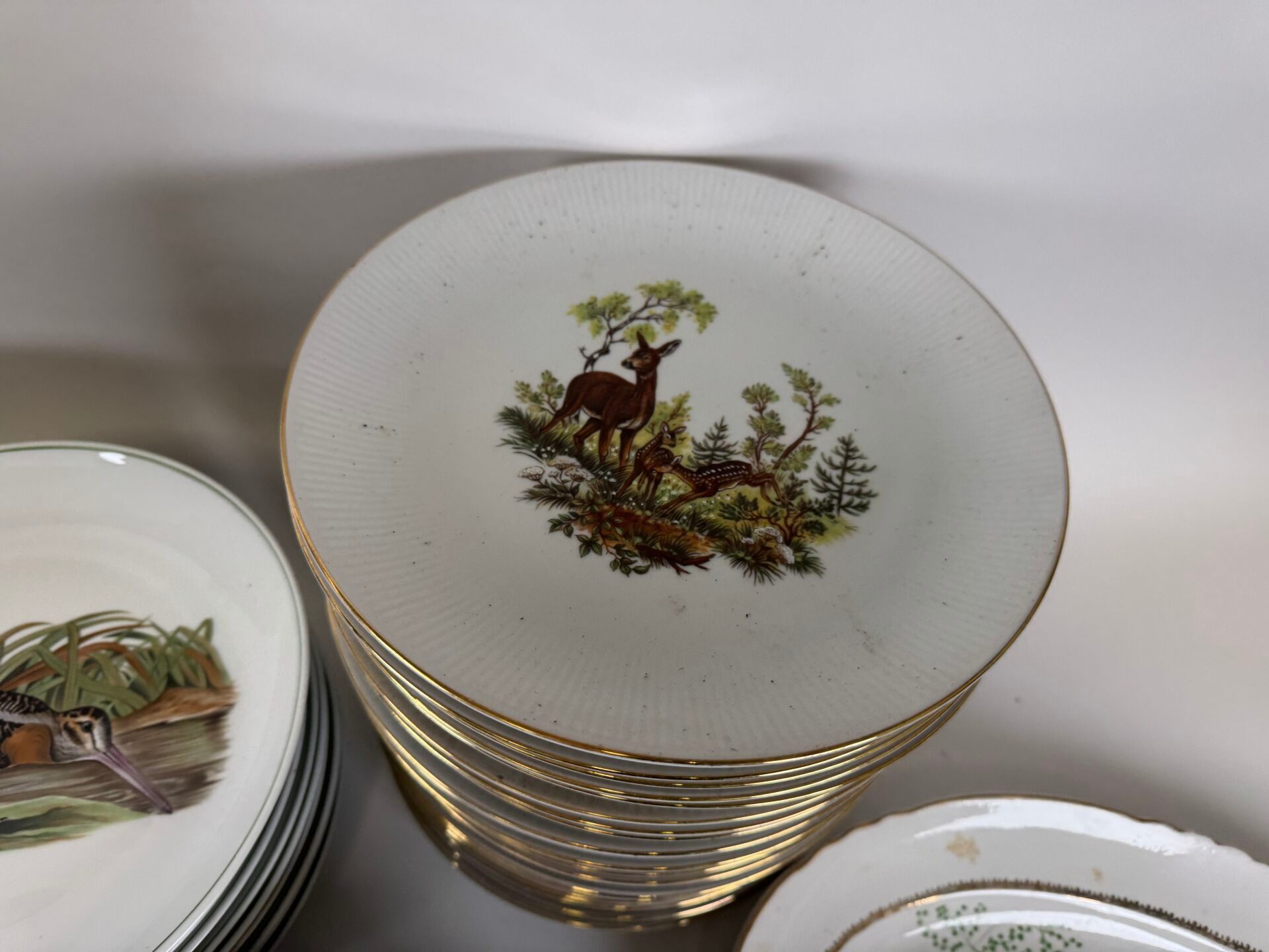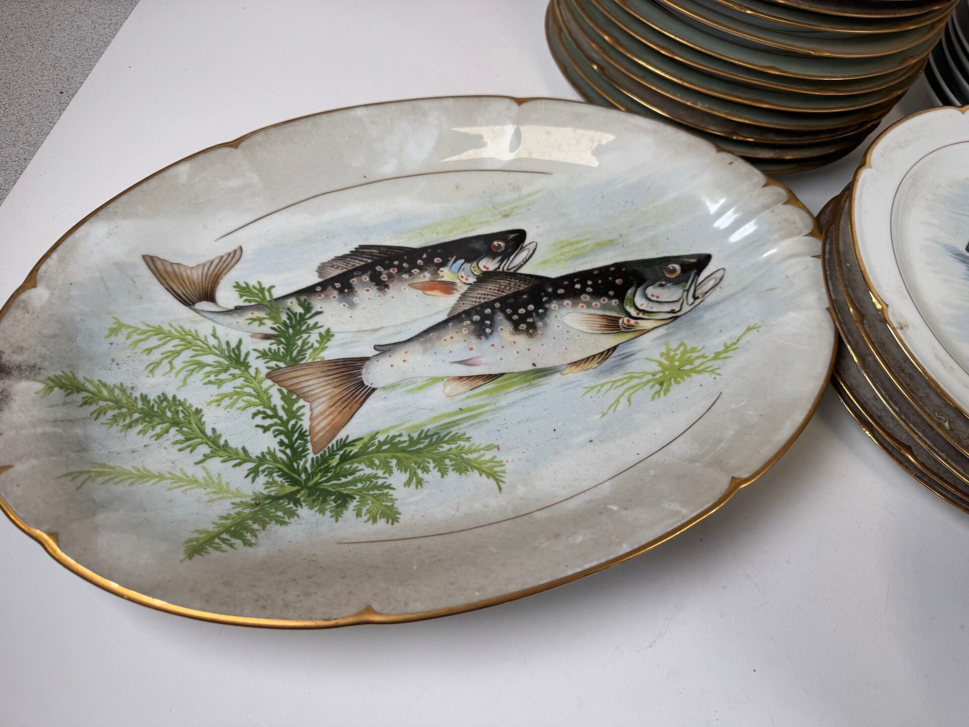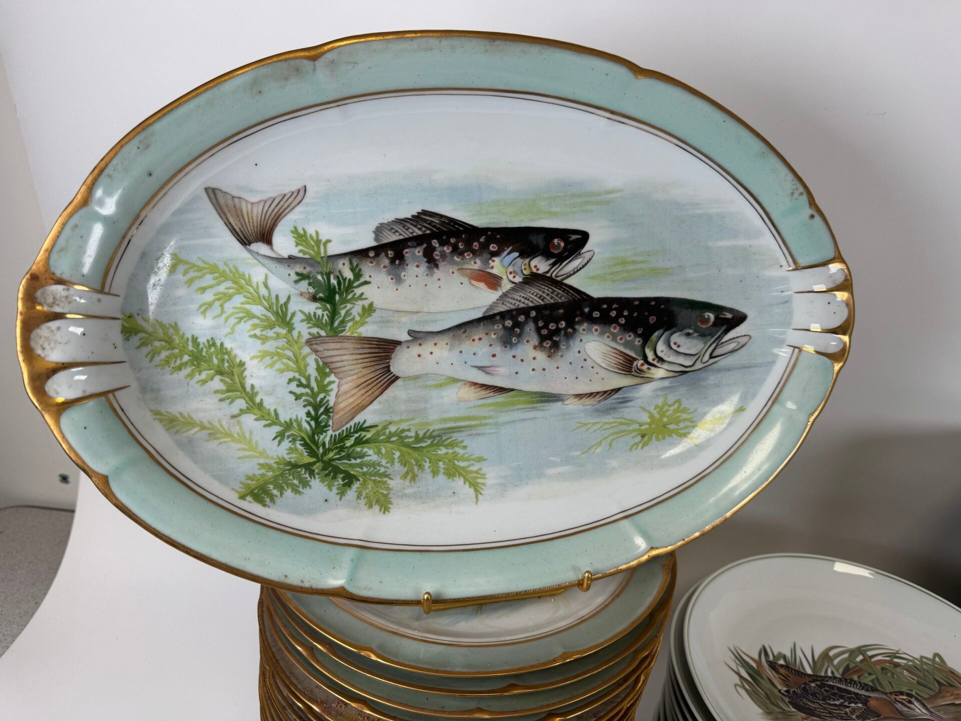 Set of polychrome porcelain and ceramics decorated with fish and on the theme of hunting comprising :