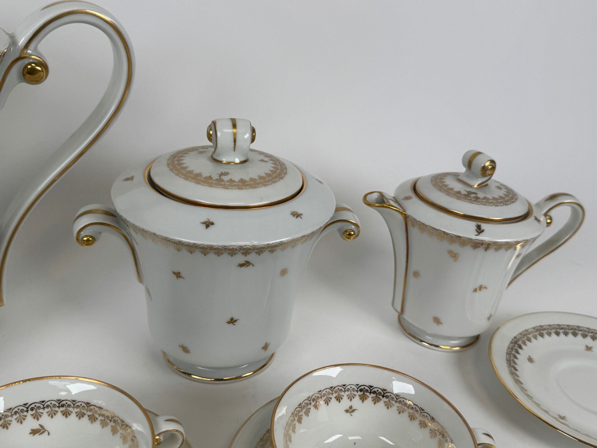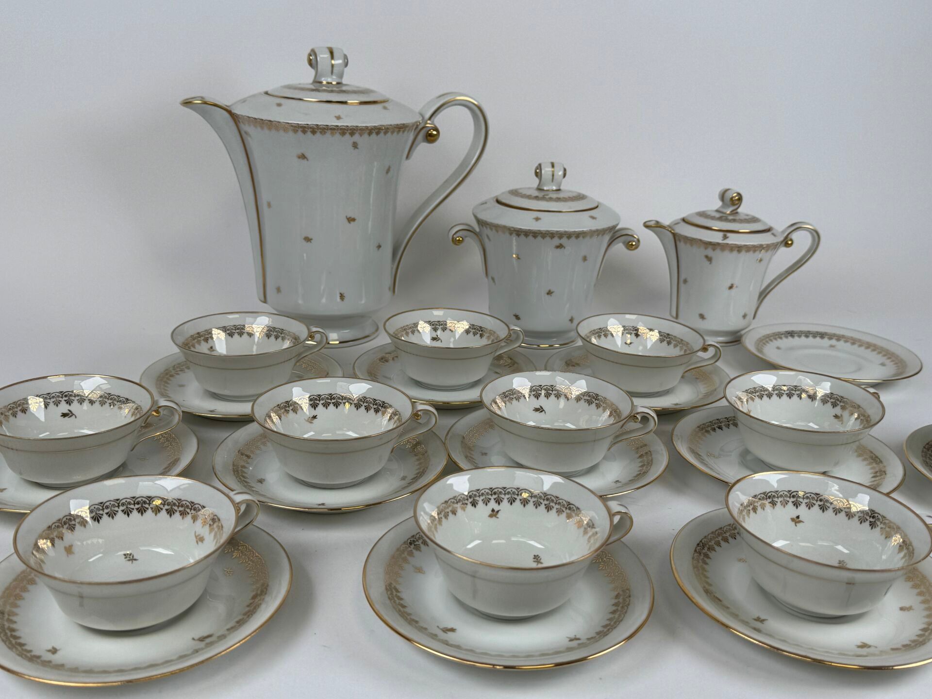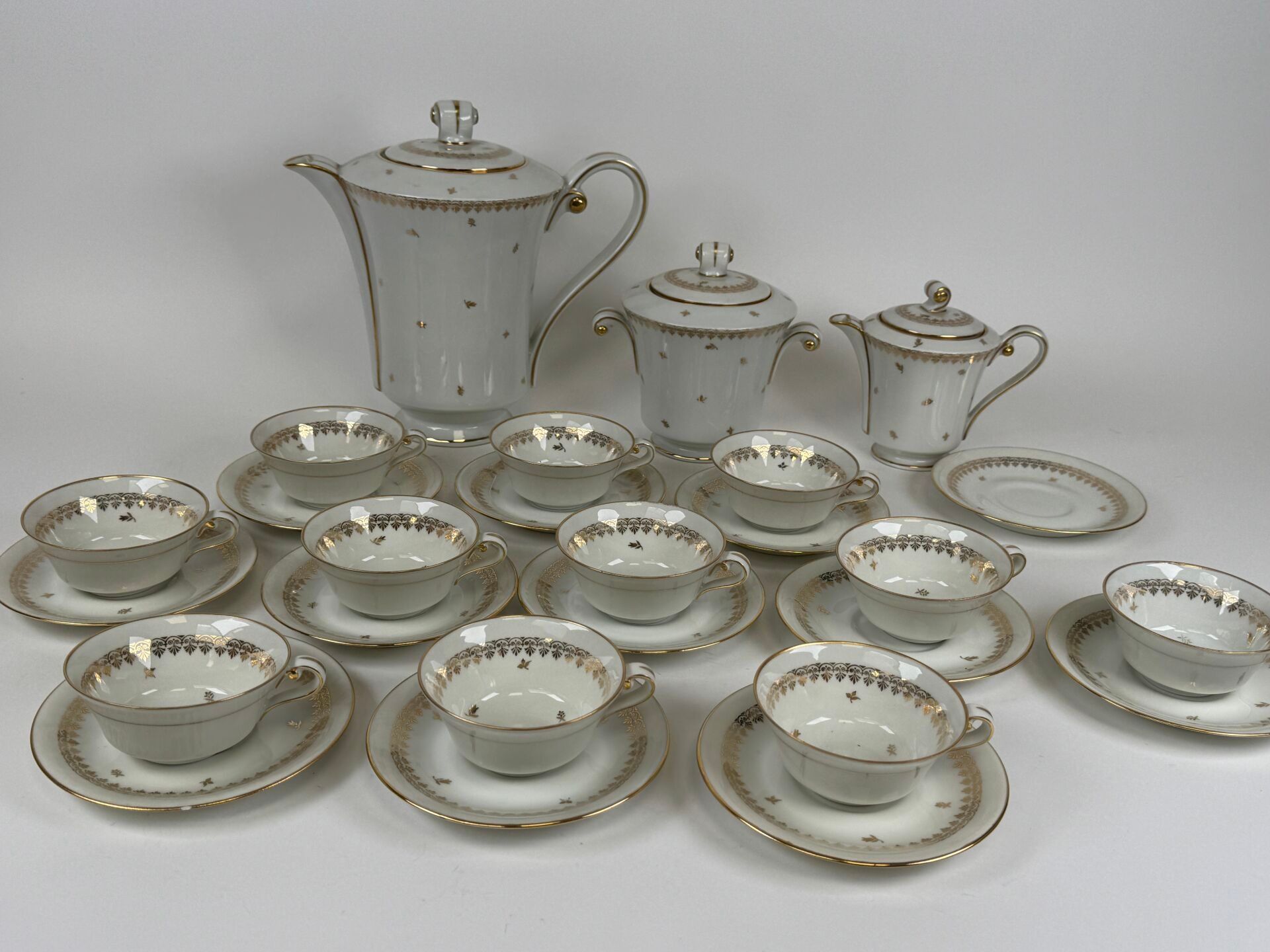 Part of a coffee service in white porcelain with gold highlights comprising :