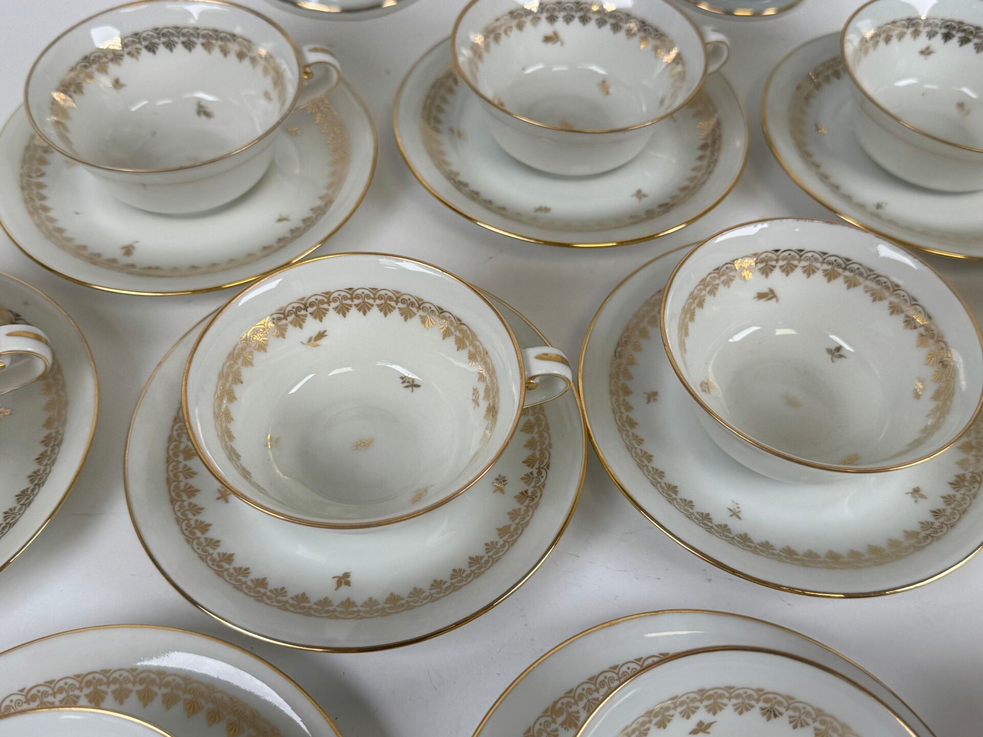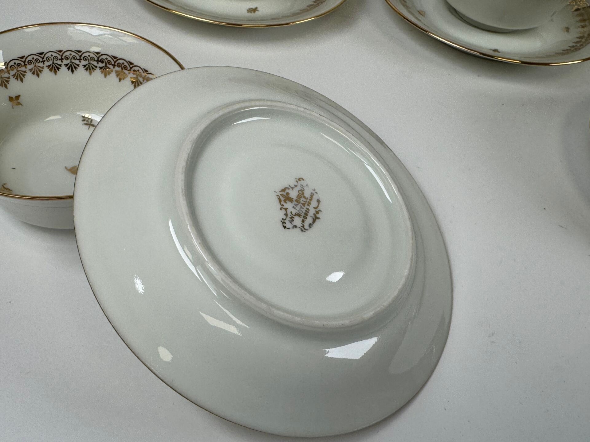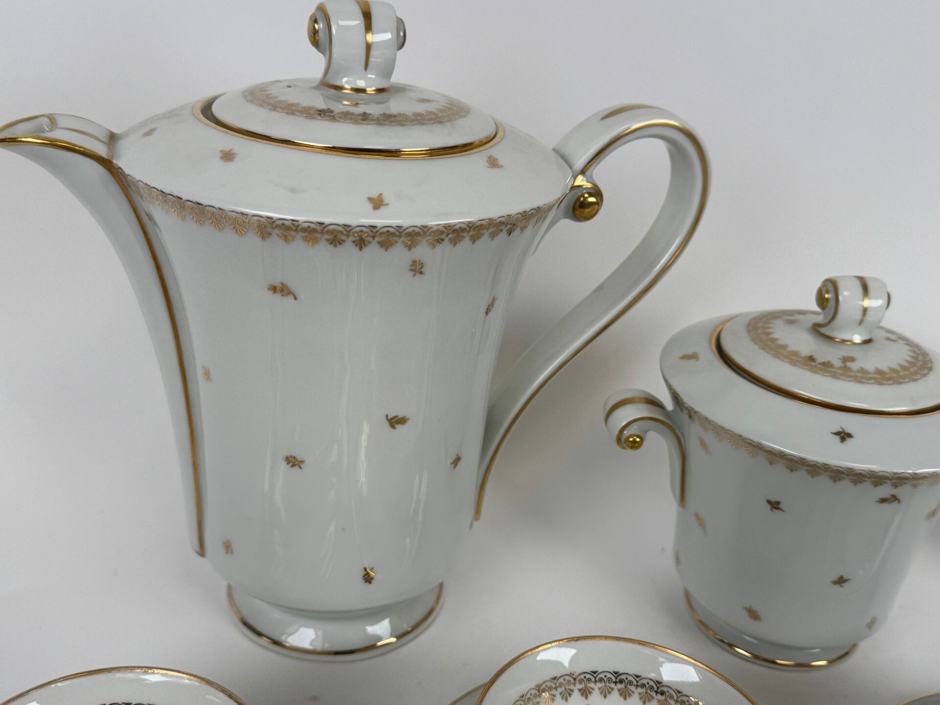 Part of a coffee service in white porcelain with gold highlights comprising :