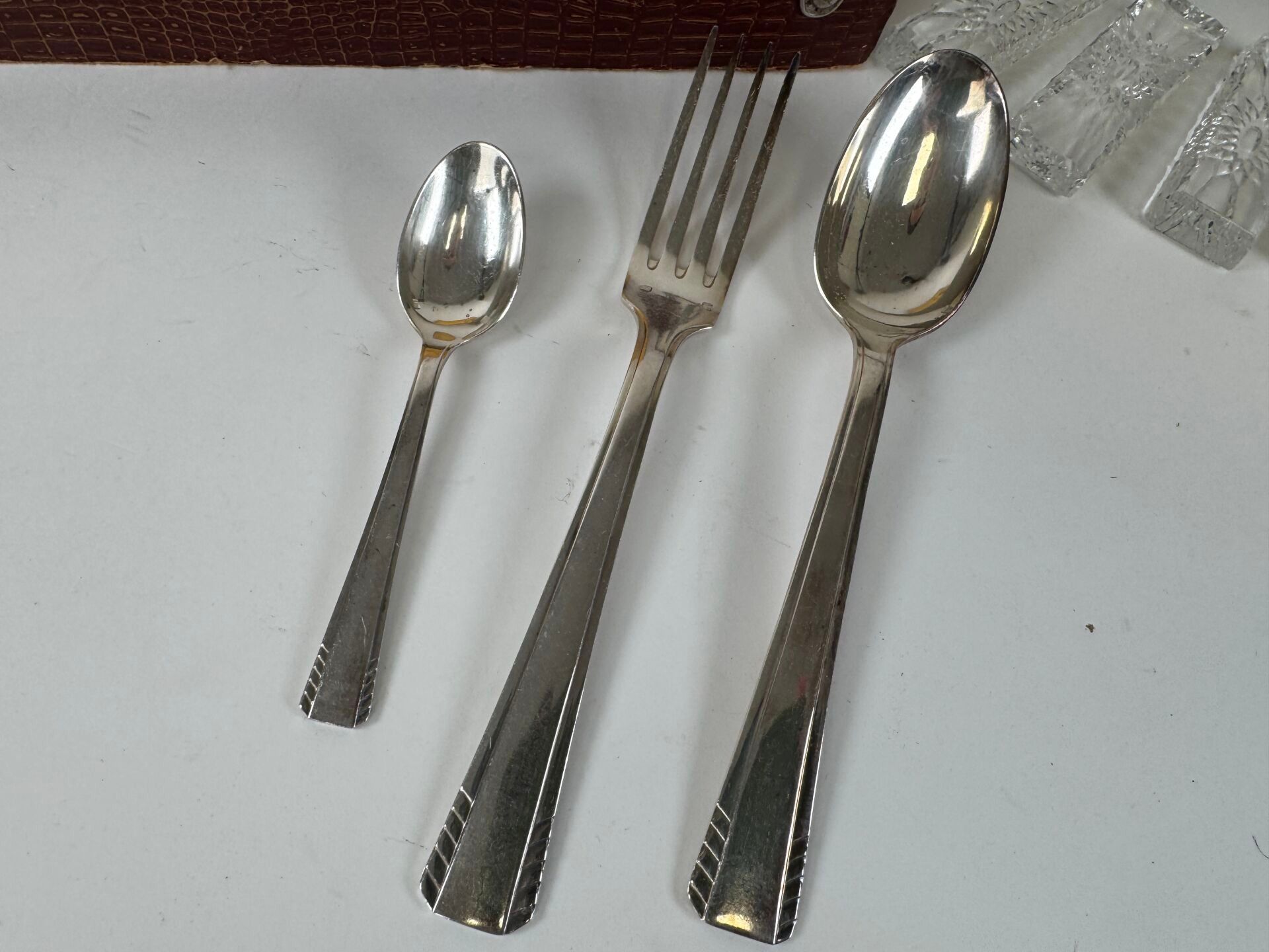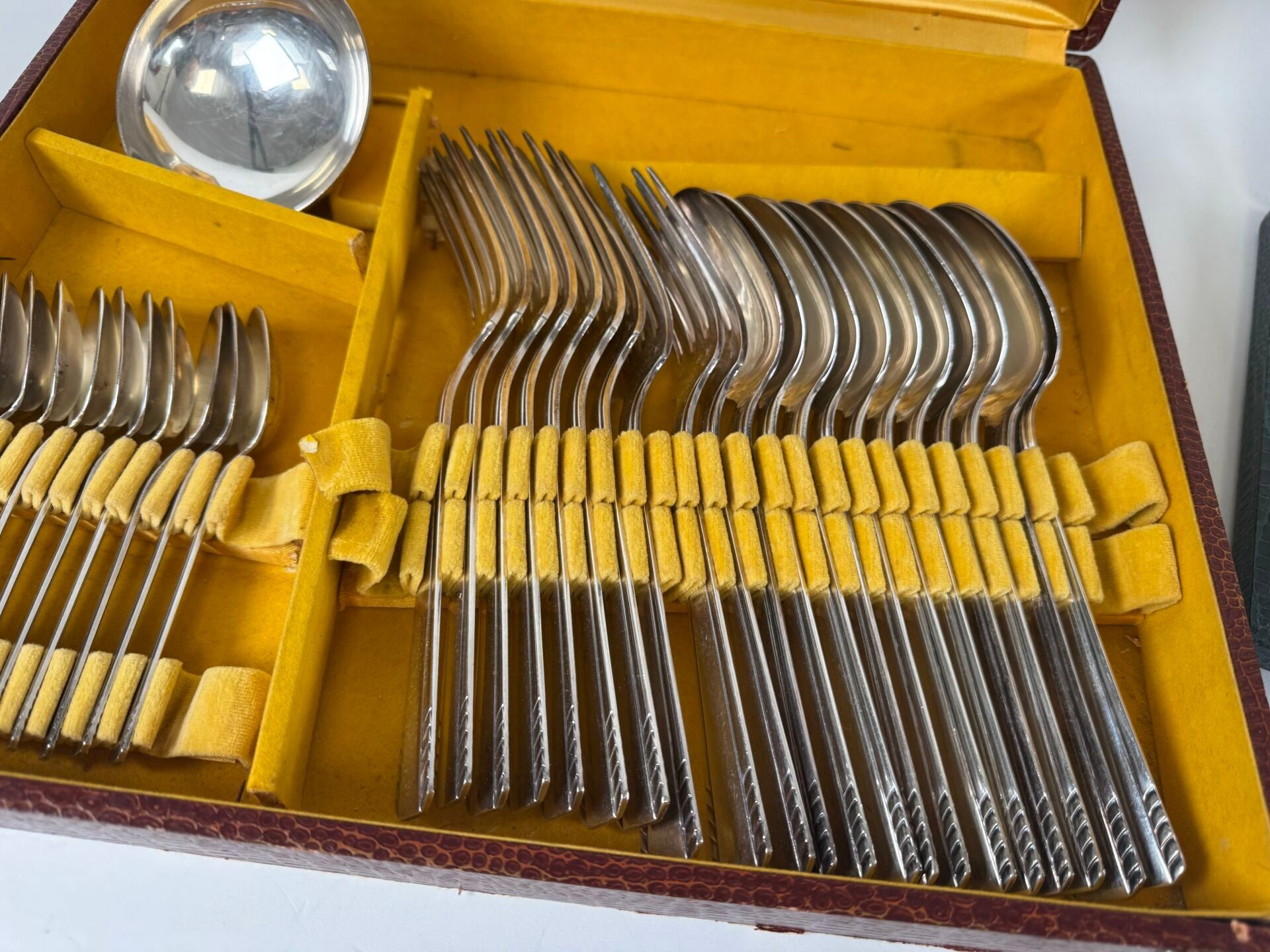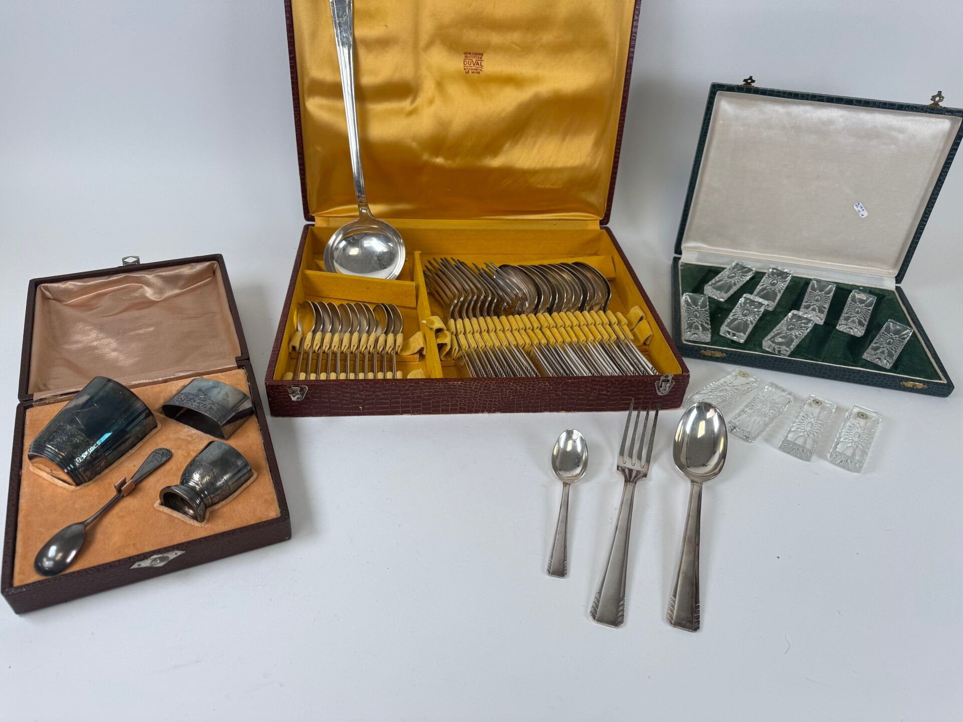 - a set of silver-plated tableware including 12 table spoons, 11 table forks, 12 teaspoons and 1 ladle.