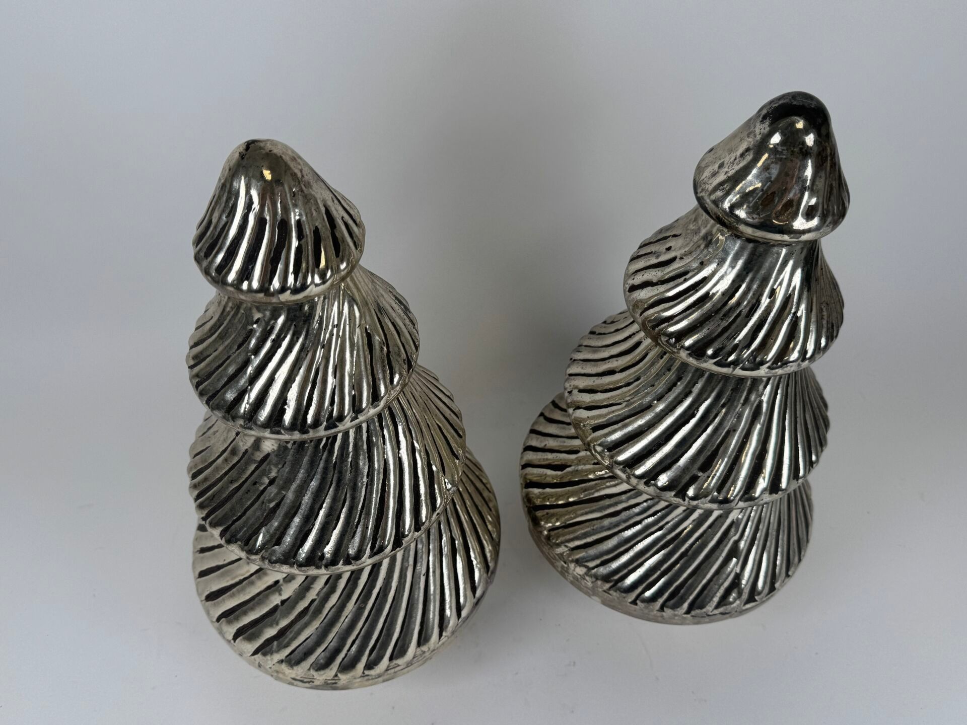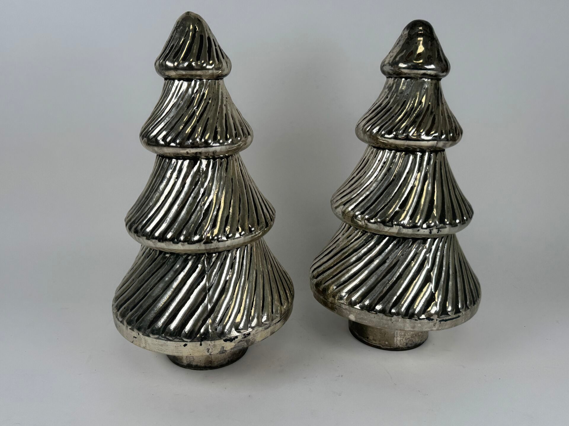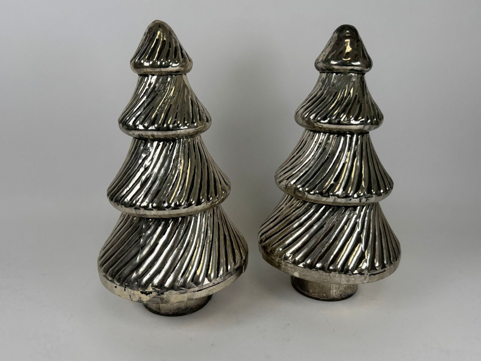 Pair of large silvered glass subjects decorated with Christmas trees.