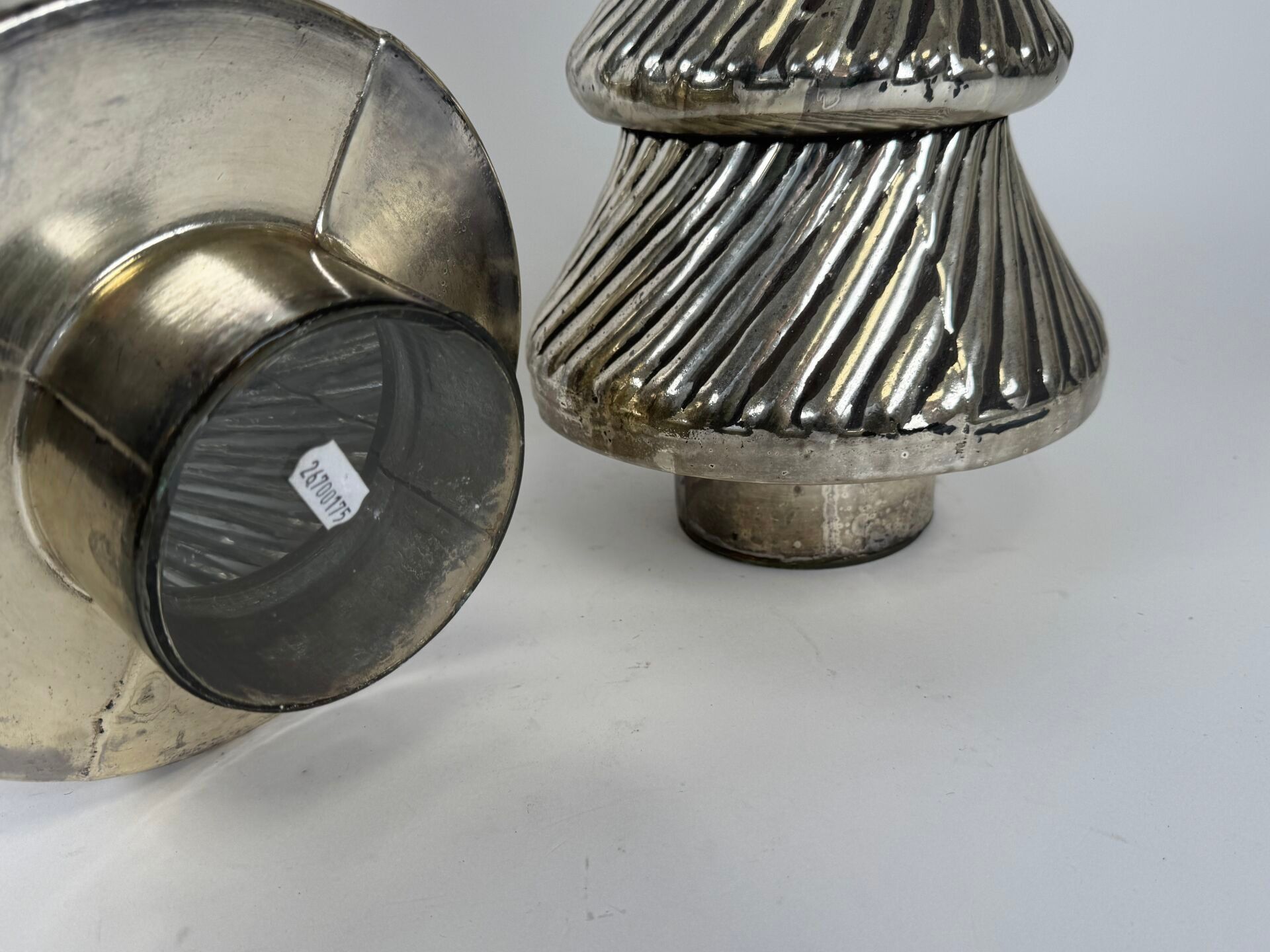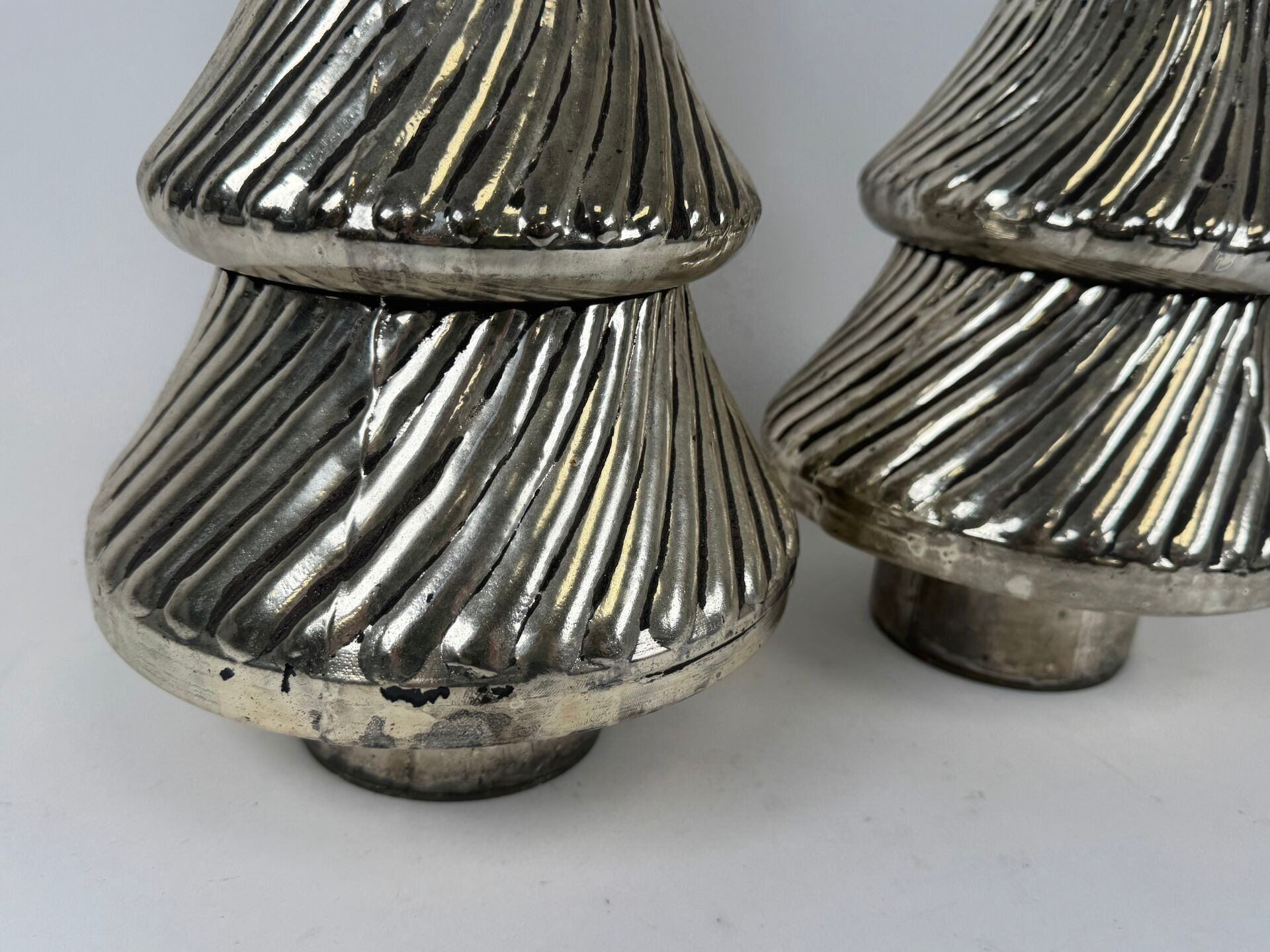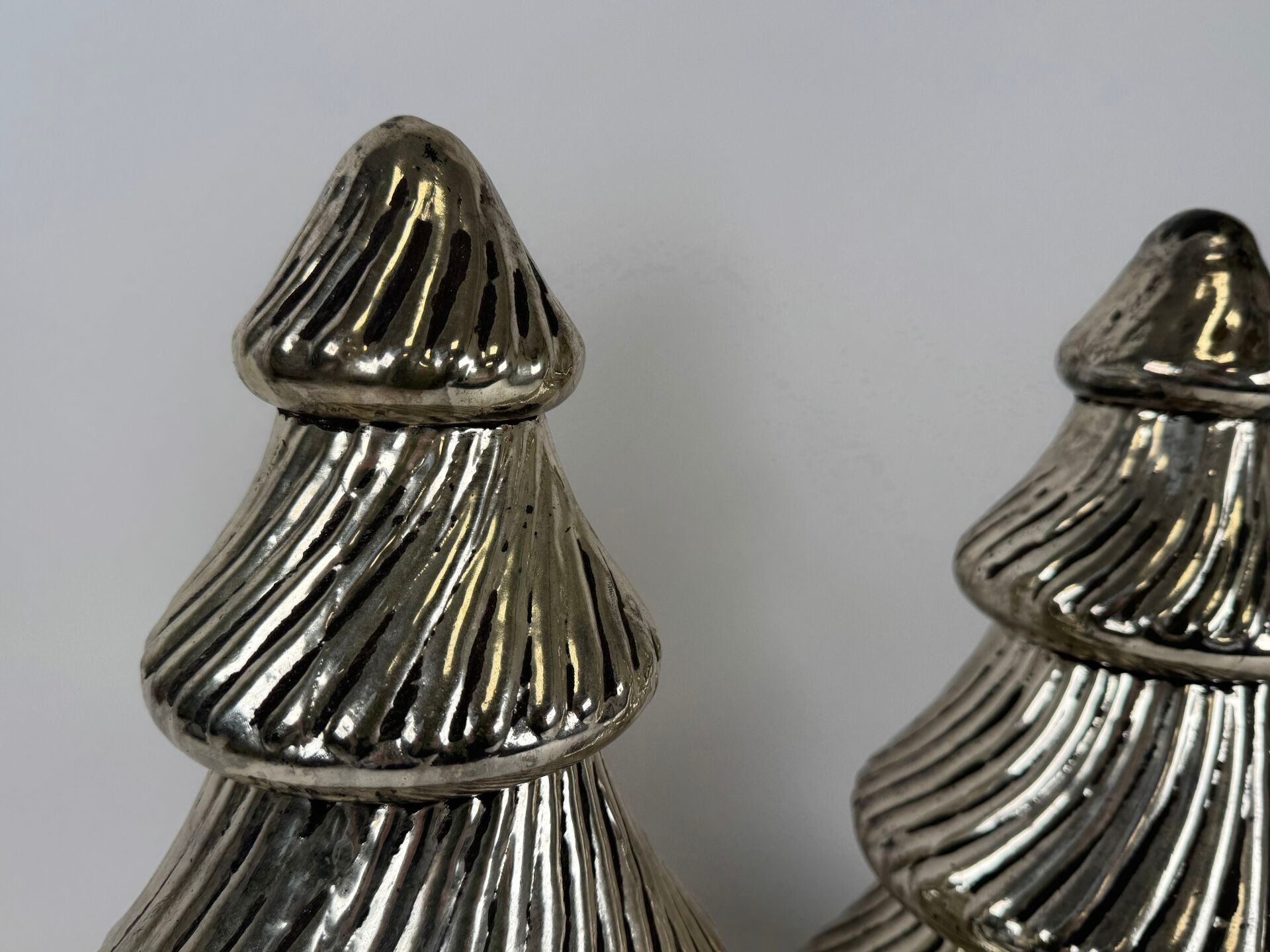 Pair of large silvered glass subjects decorated with Christmas trees.