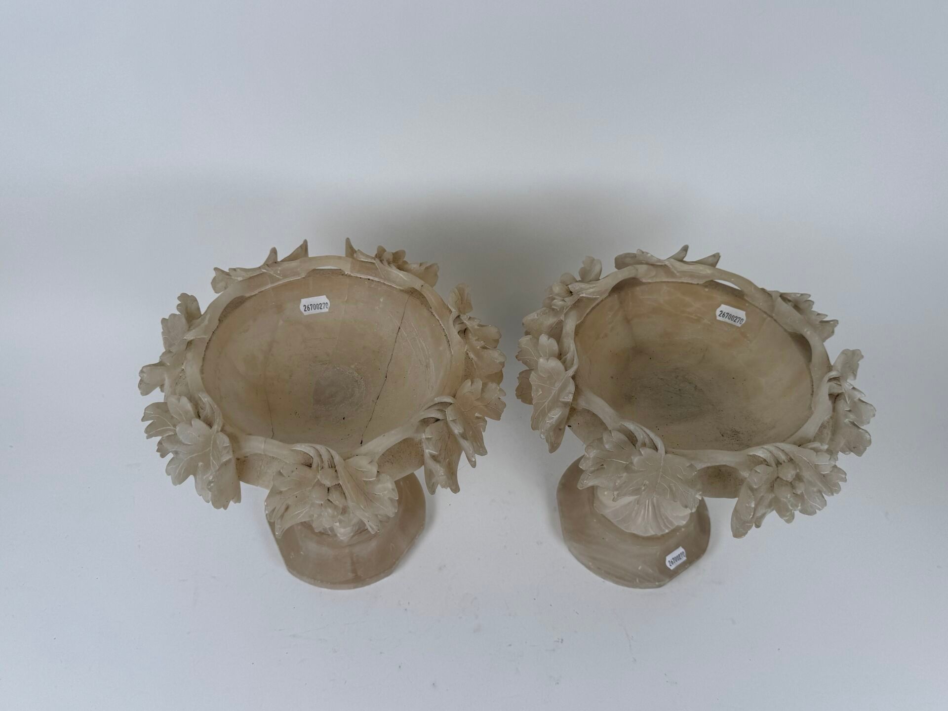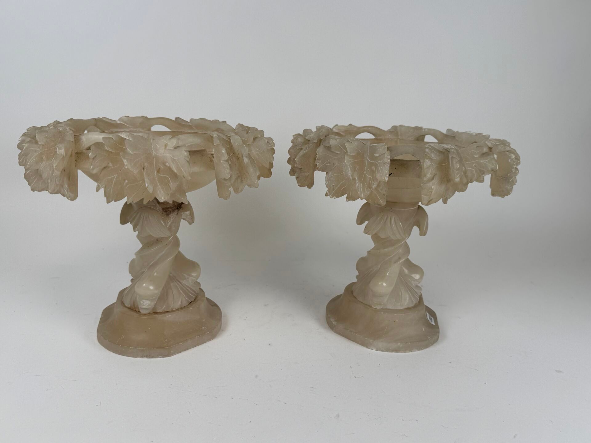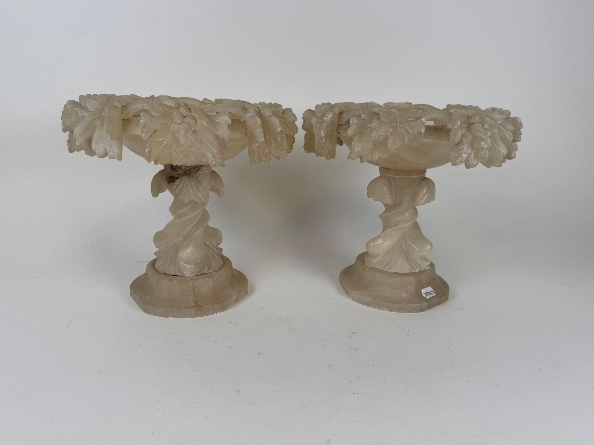 A pair of carved alabaster bowls with foliage decoration, the scrolled base.