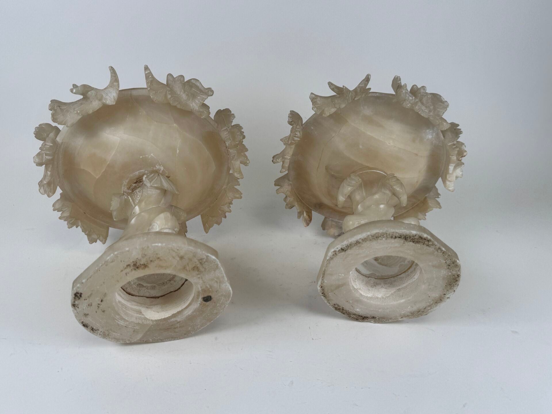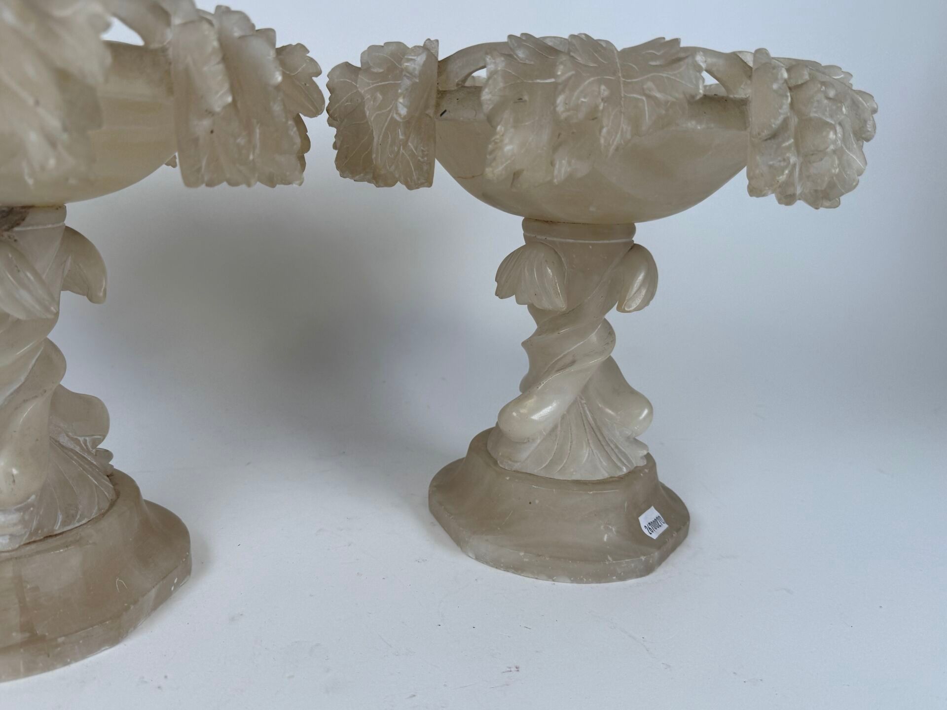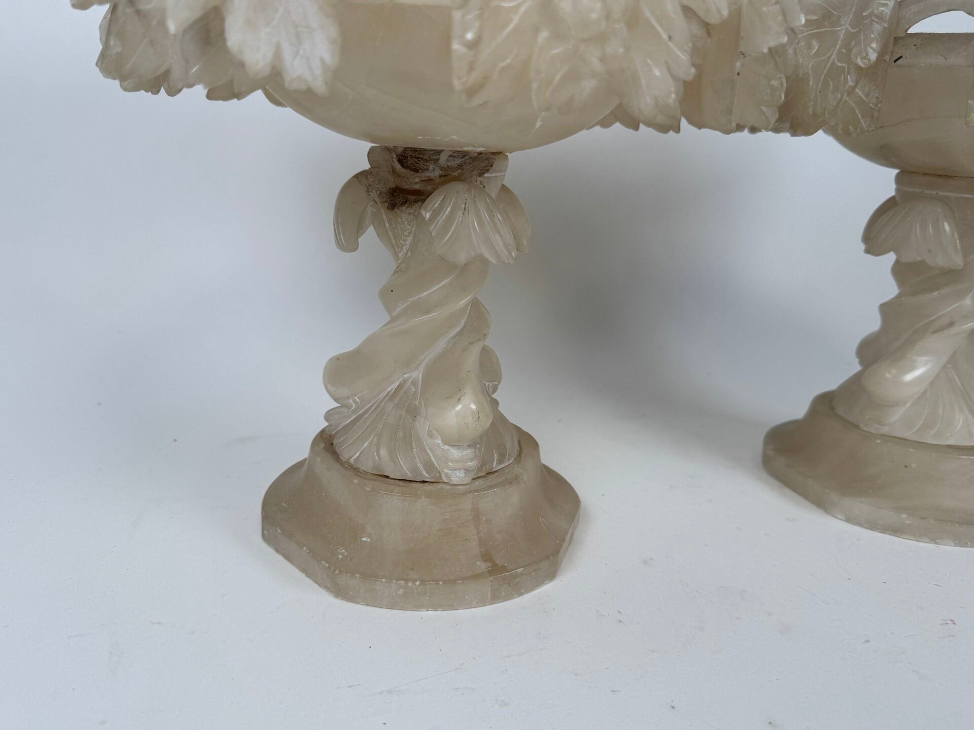 A pair of carved alabaster bowls with foliage decoration, the scrolled base.