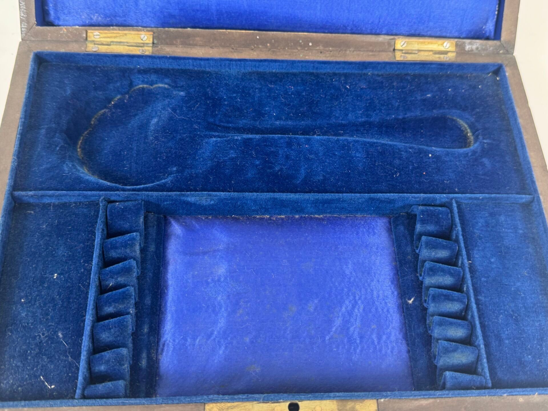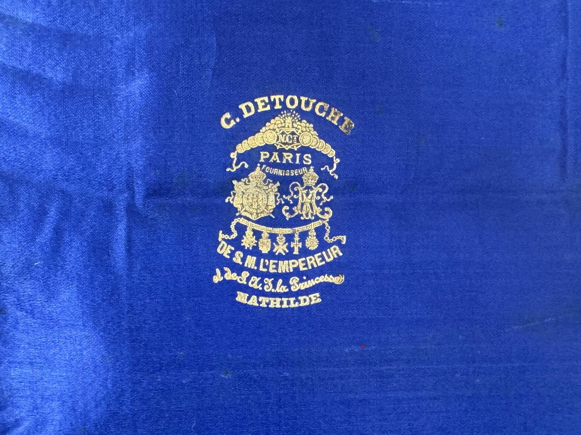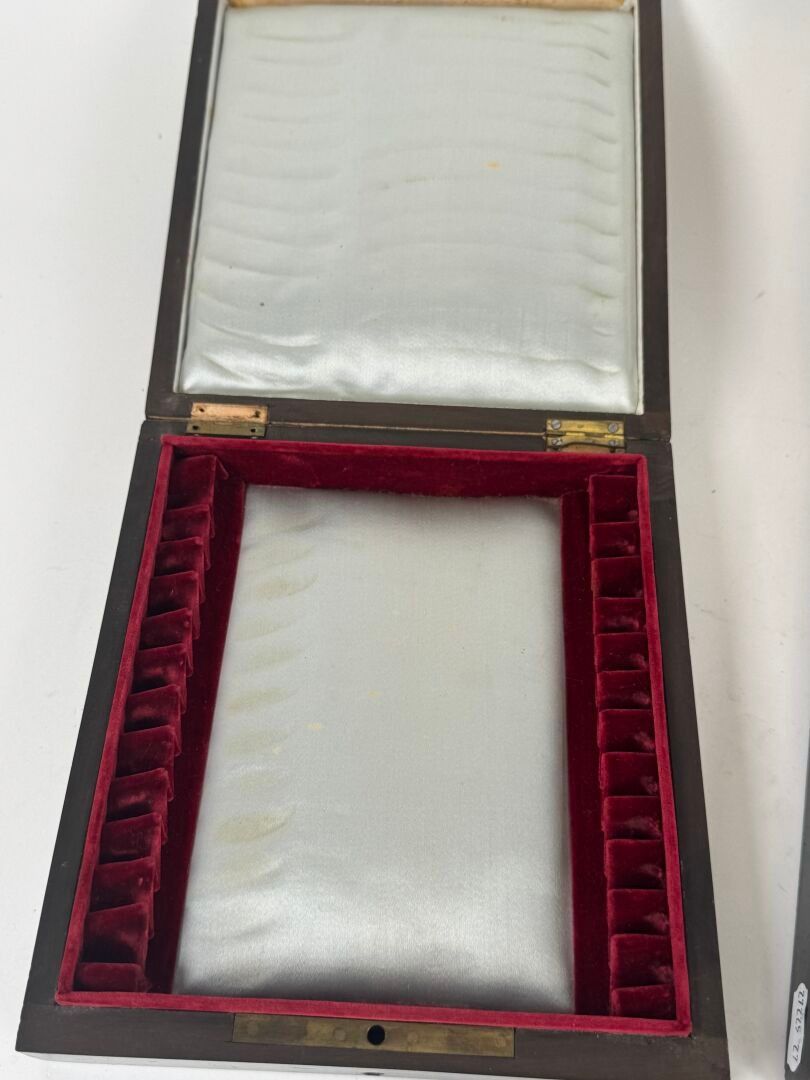 A stained wood box with green silk interior signed C.Detouche, supplier to S.M. L'Empereur.