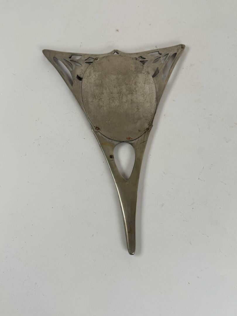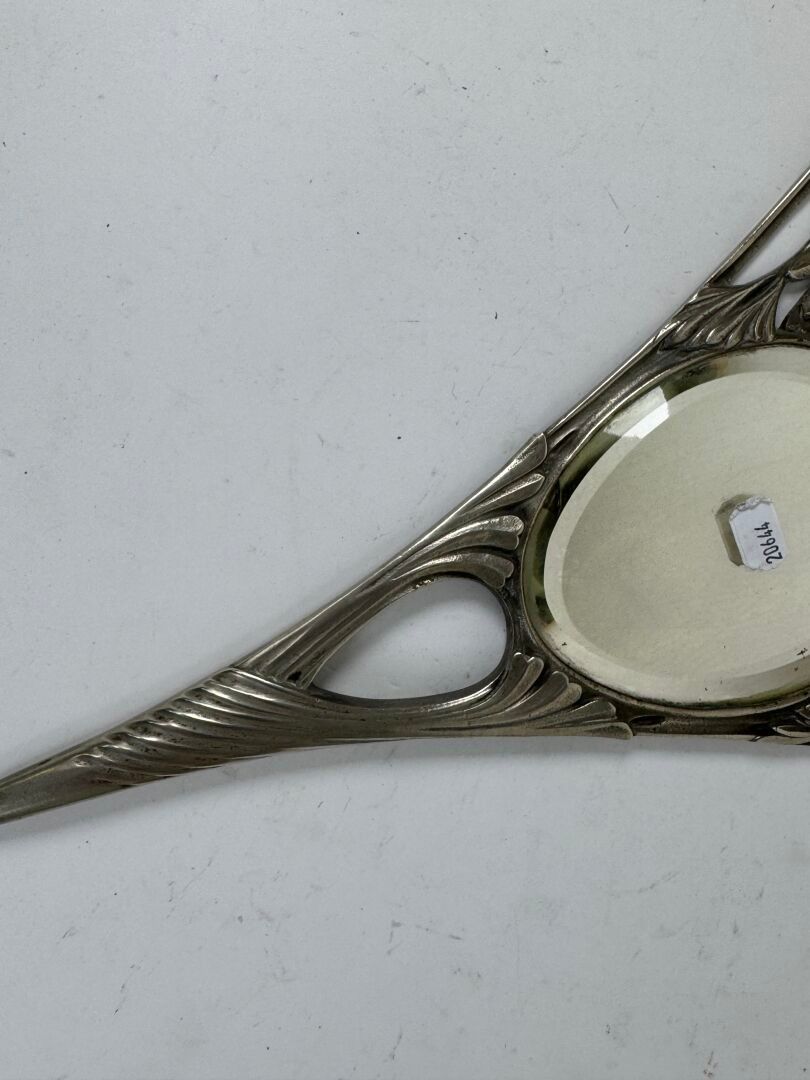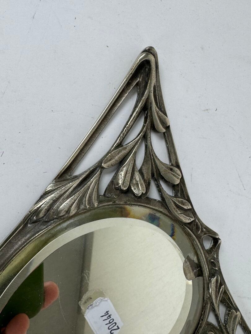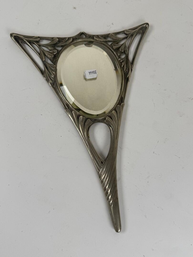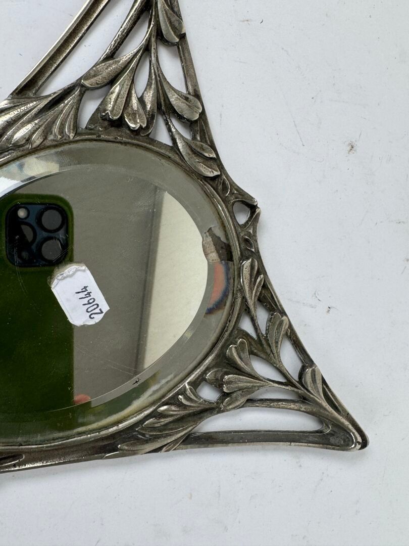Small openwork metal mirror with foliage decoration and bevelled glass.