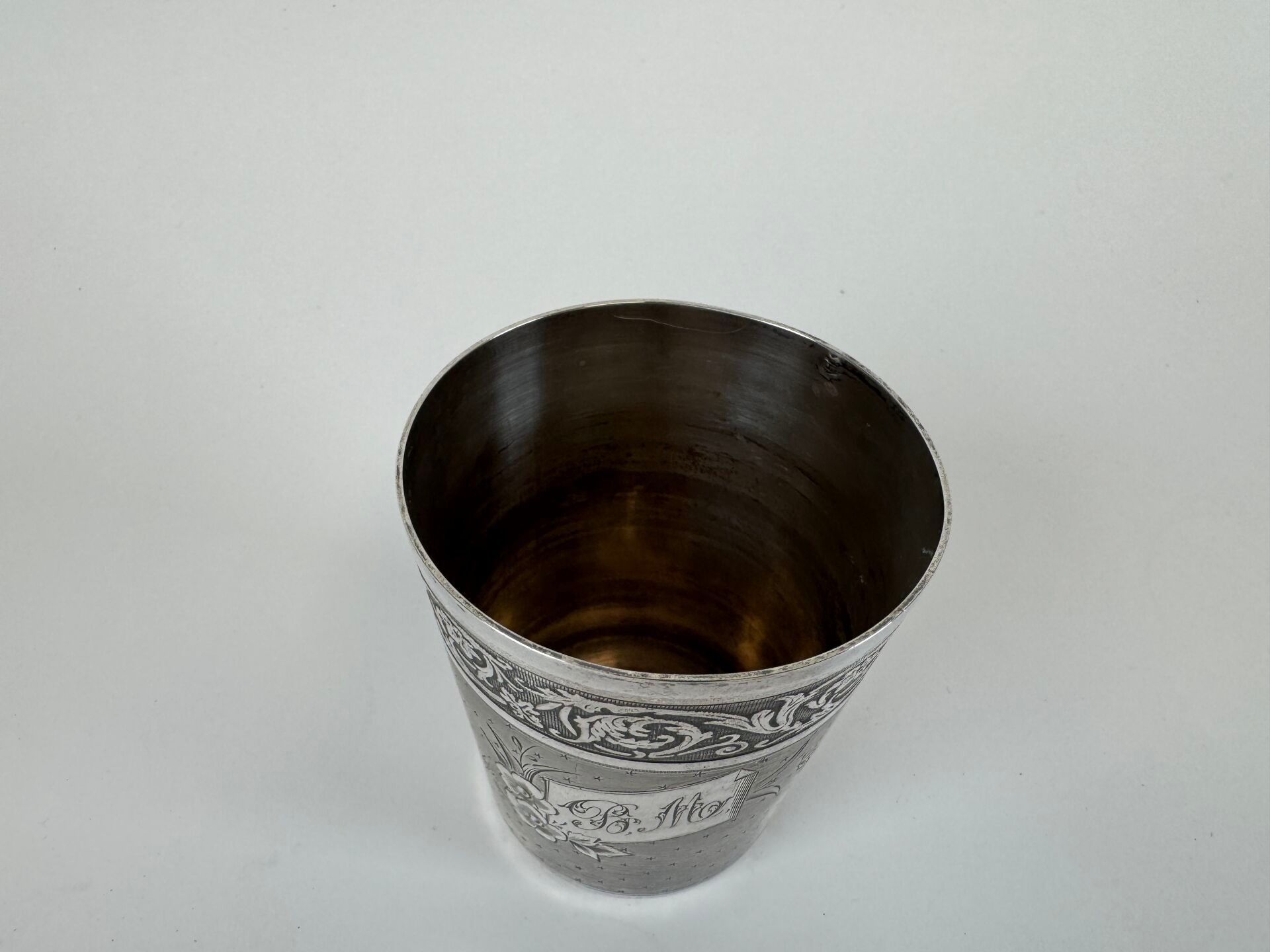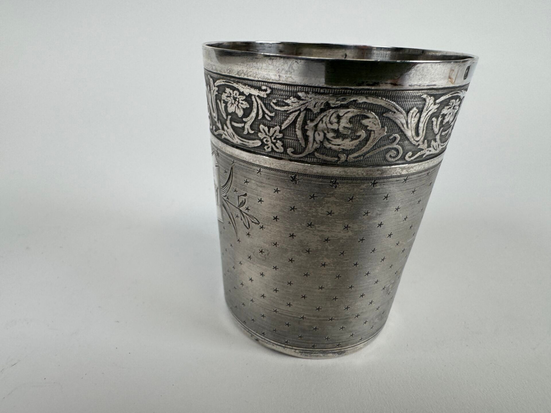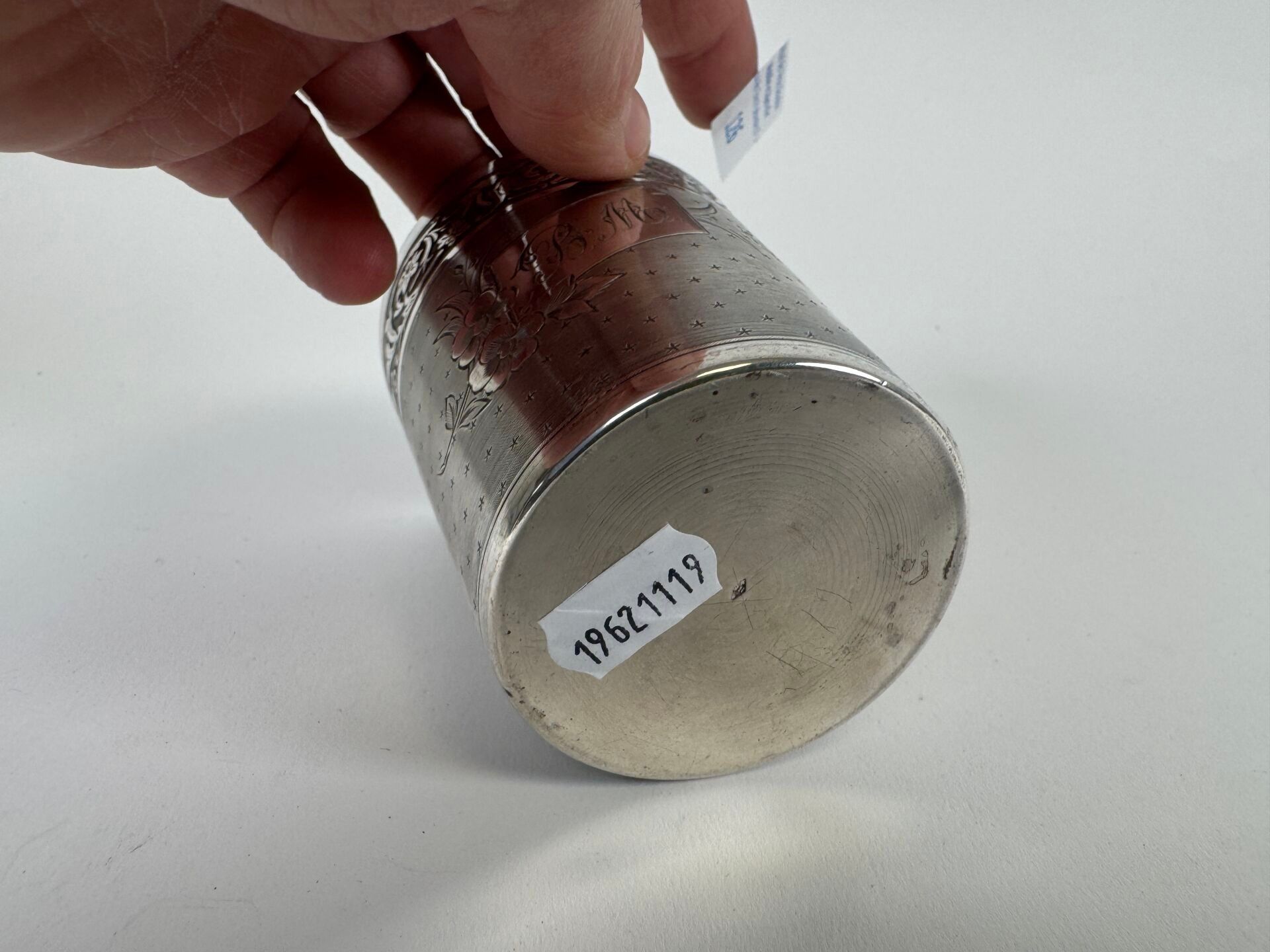 A 950/1000 silver tumbler with guilloché and chased foliate decoration centred on a figured cartouche.