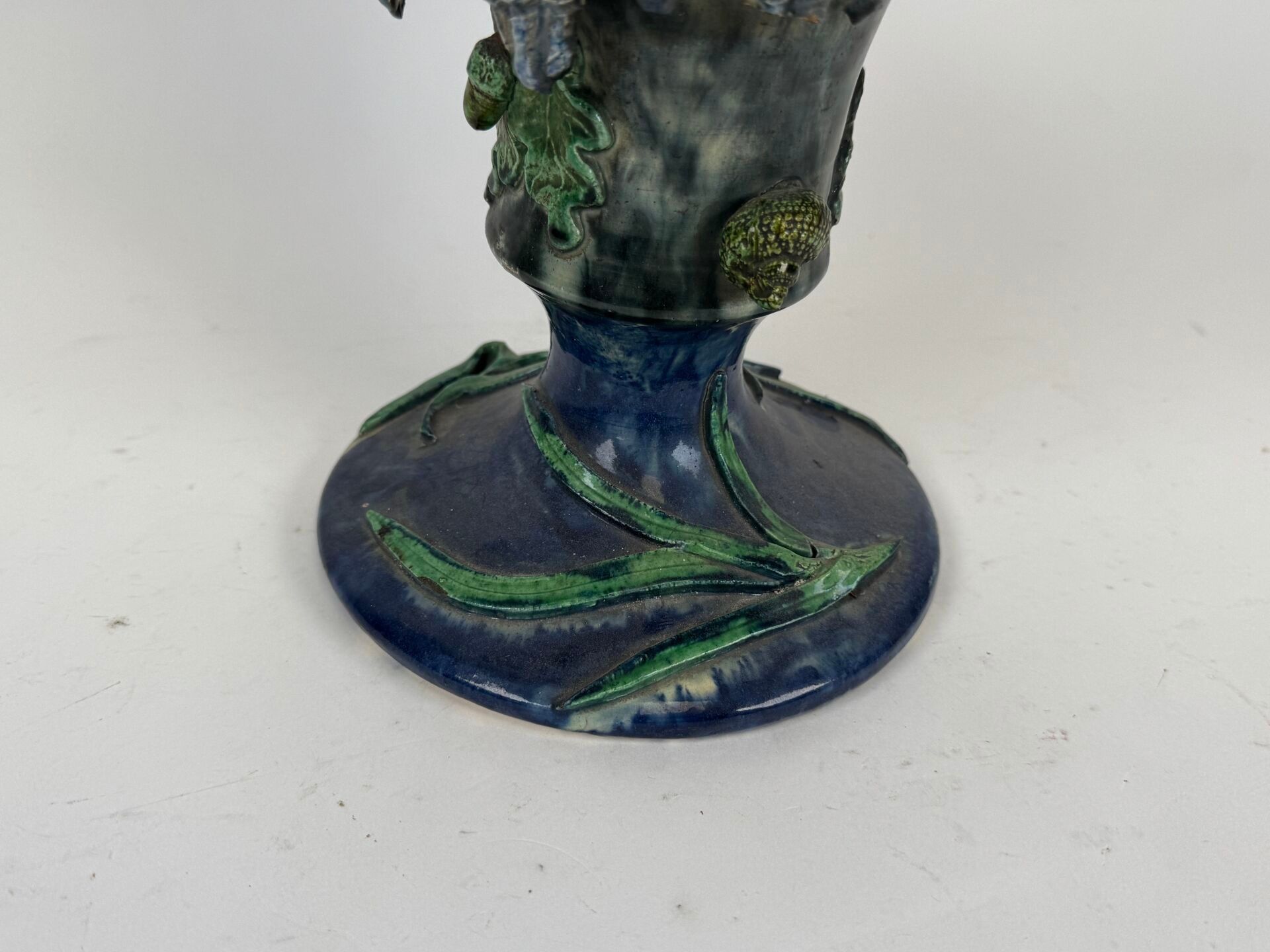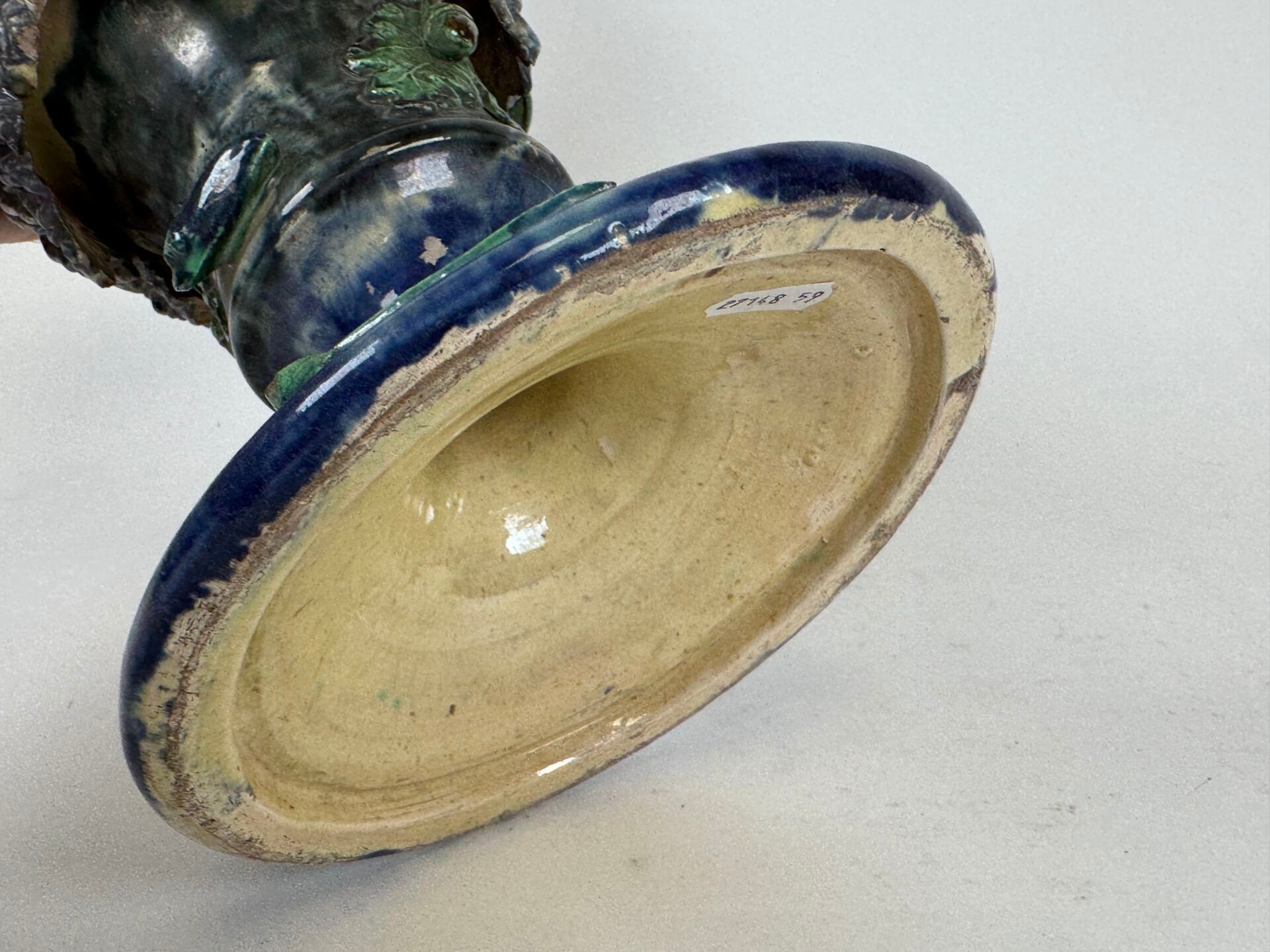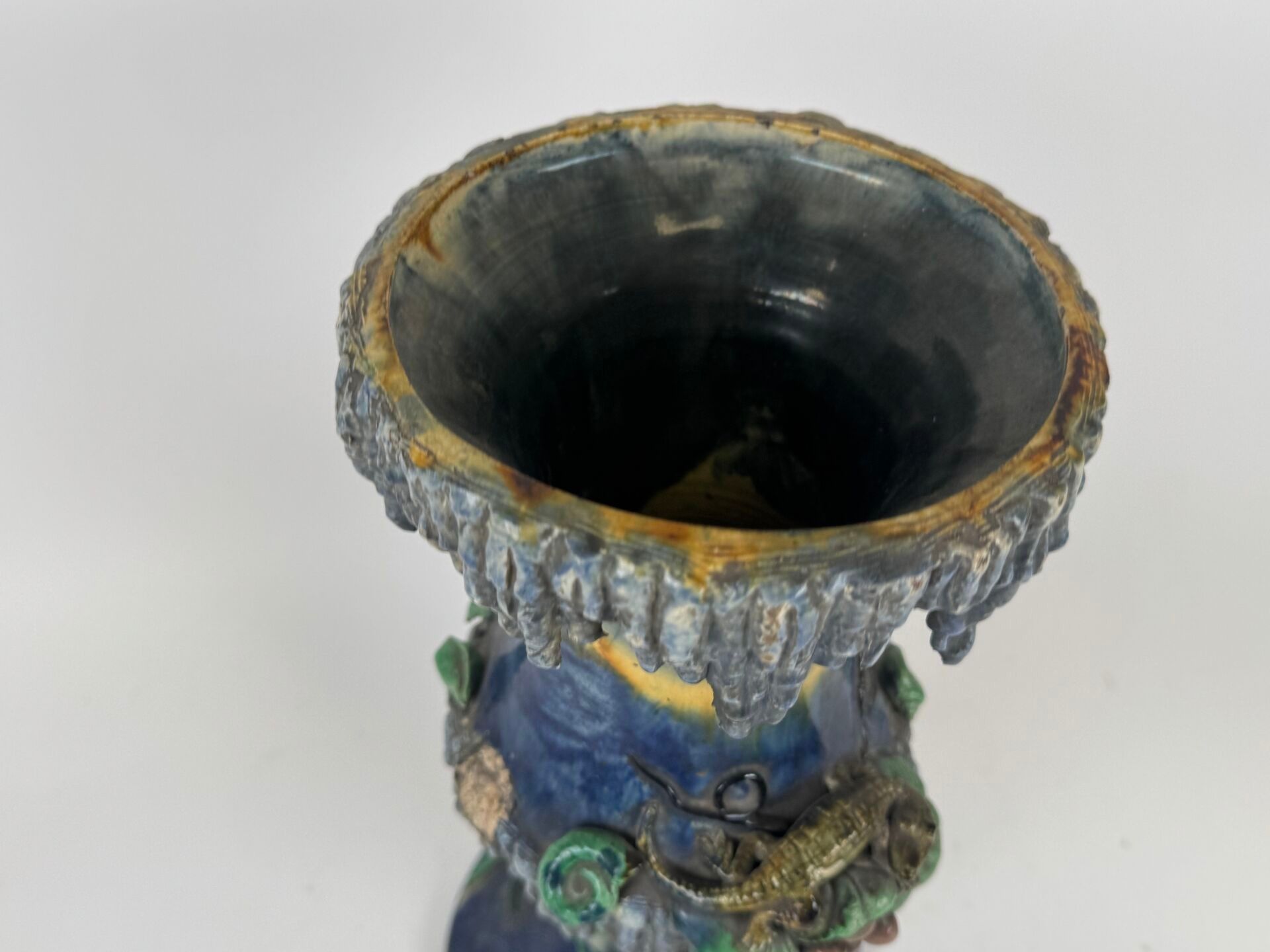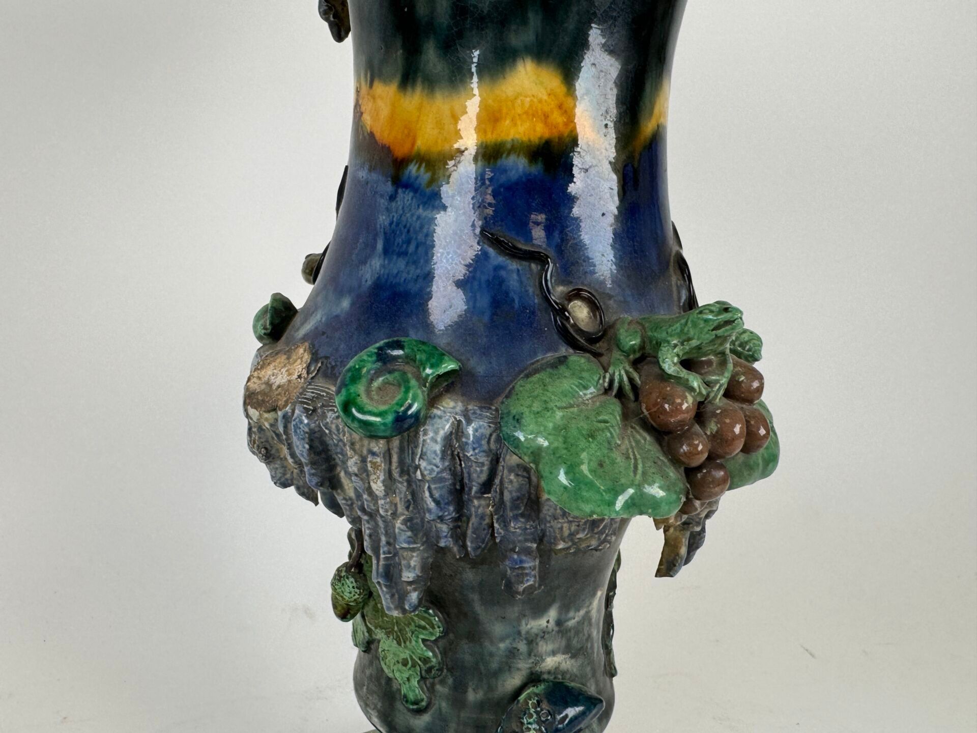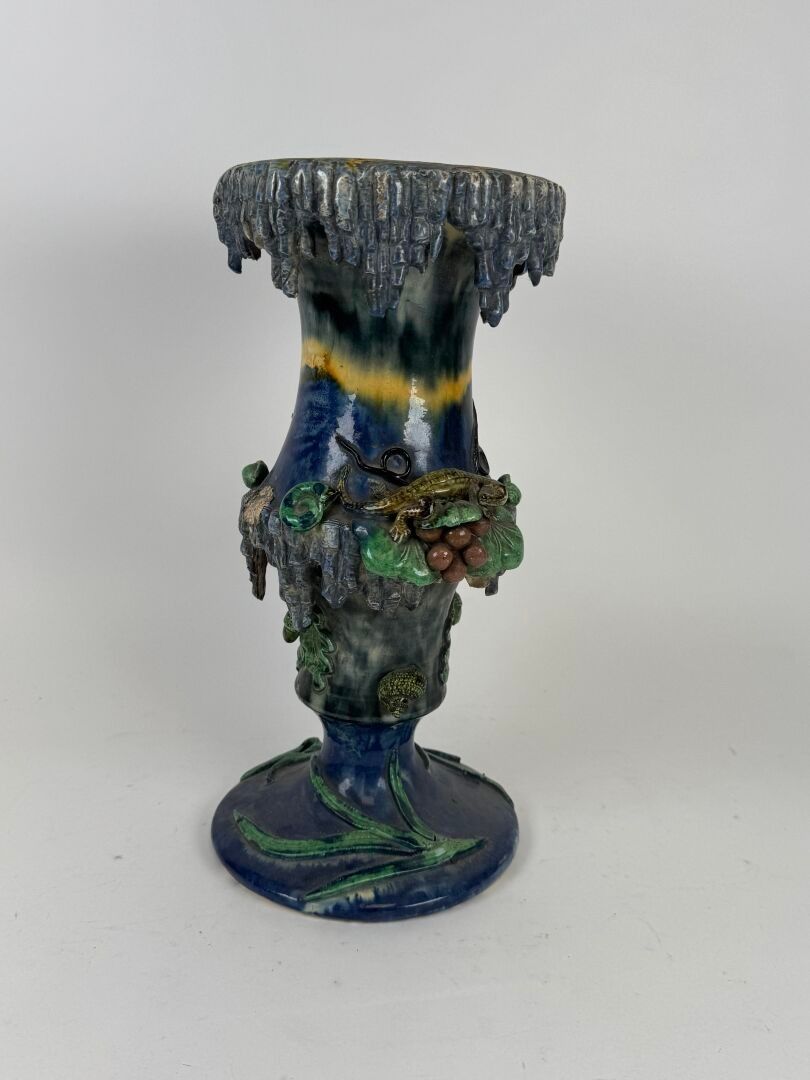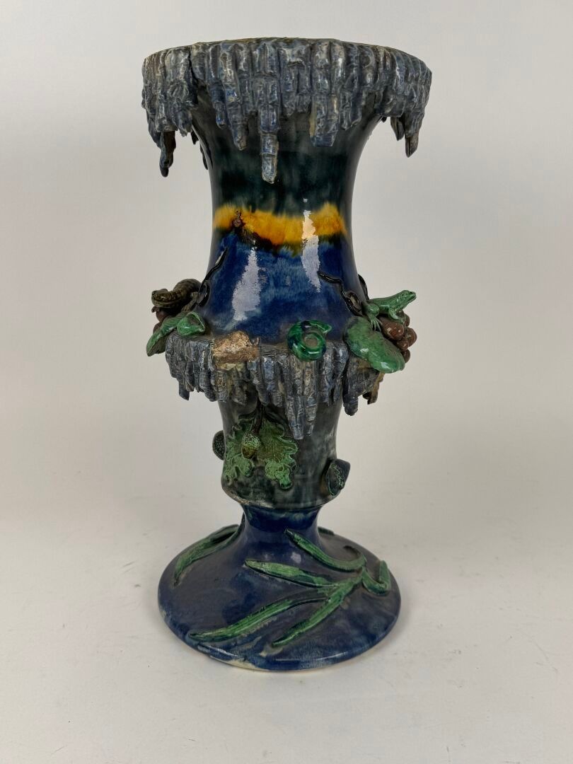 Polychrome slip vase with relief decoration of animals, fruit, shells and foliage.