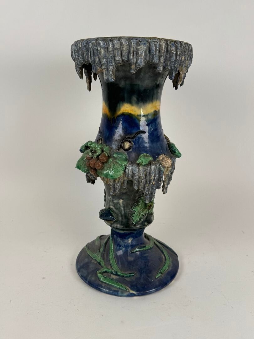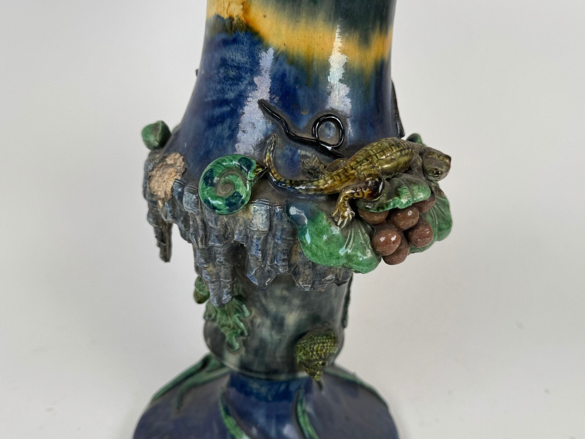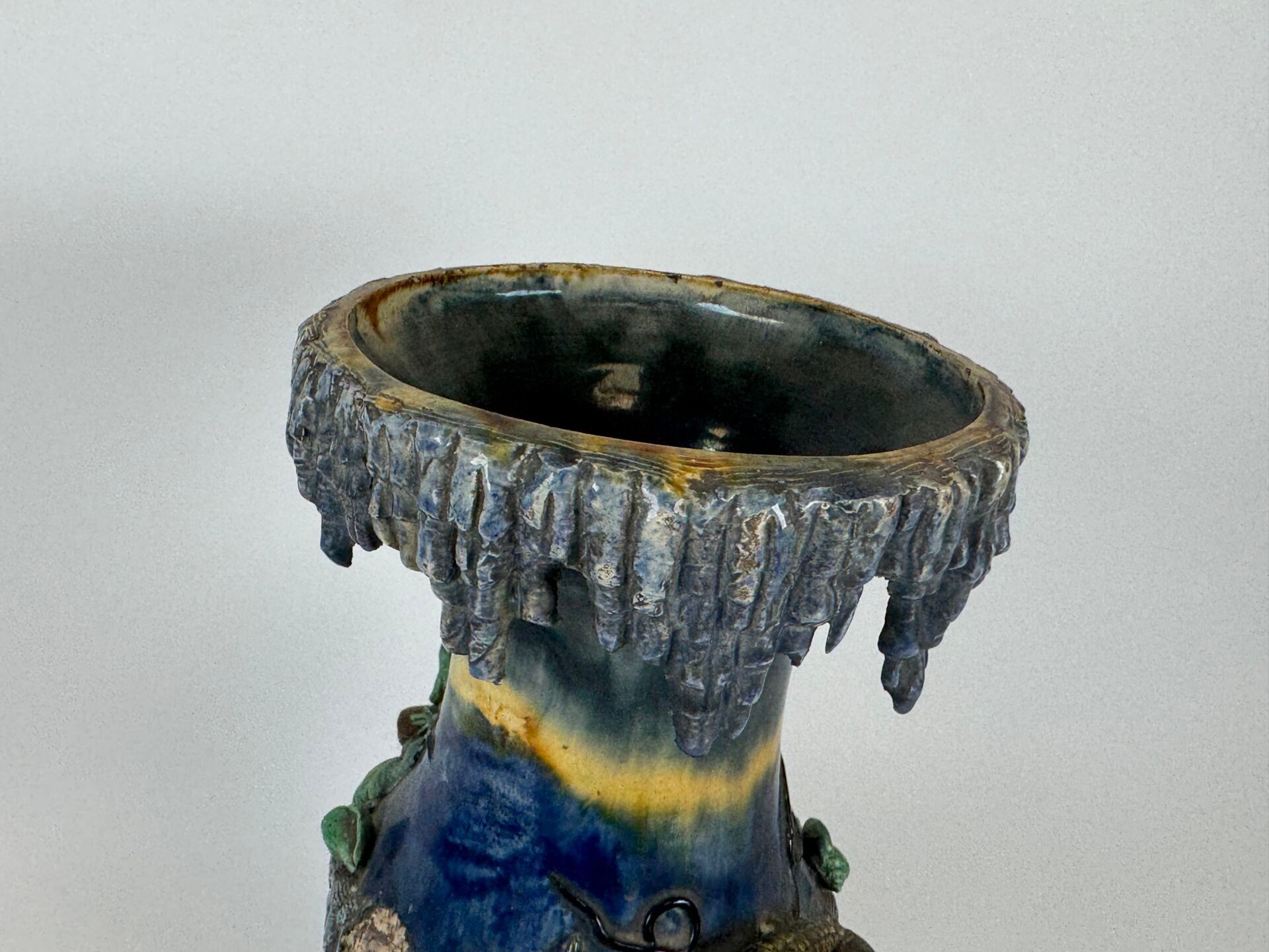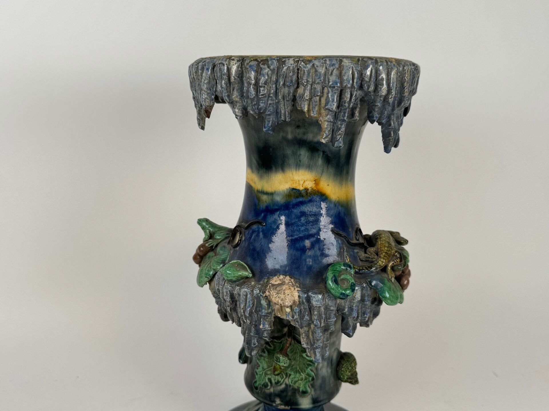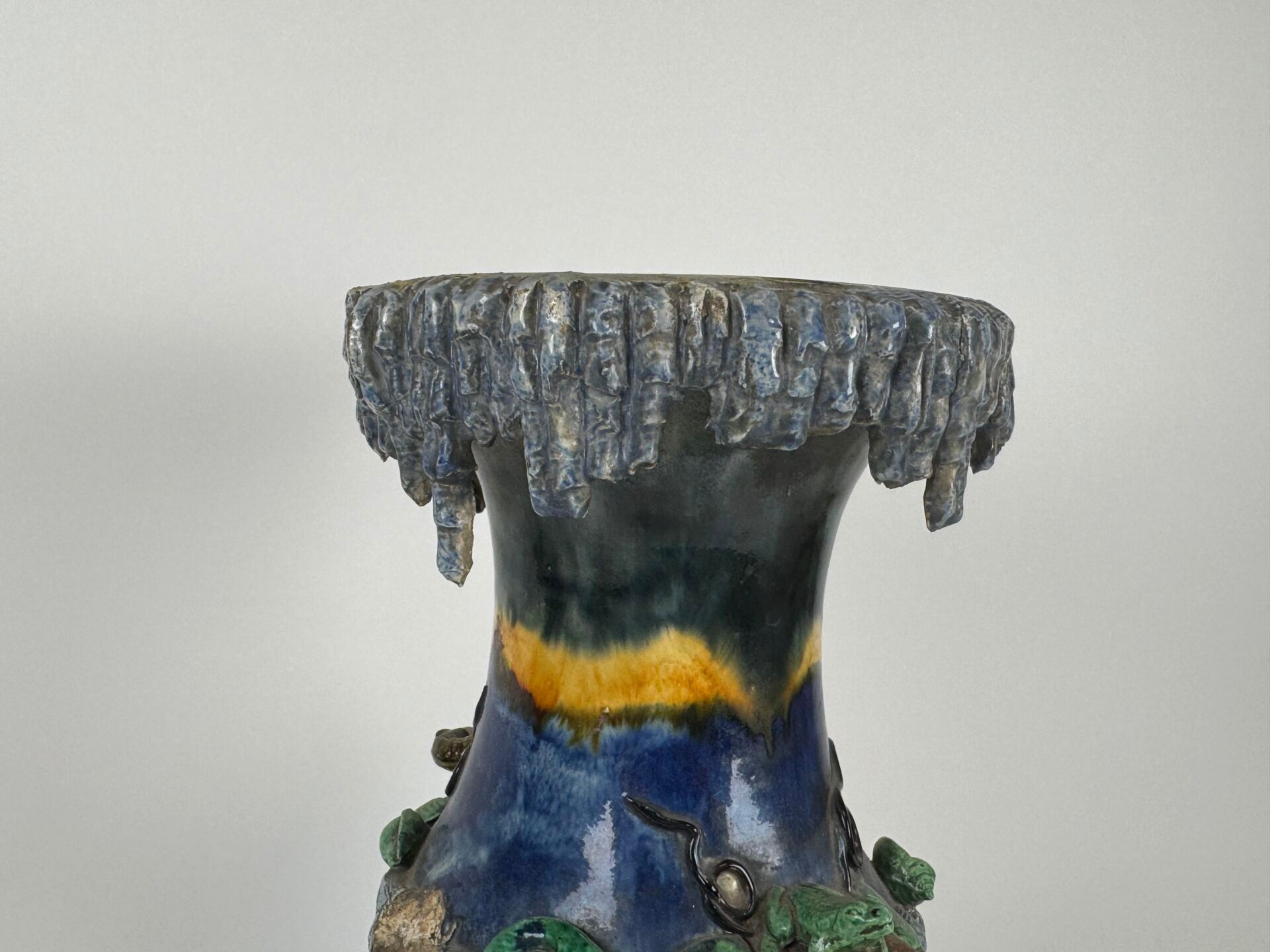 Polychrome slip vase with relief decoration of animals, fruit, shells and foliage.