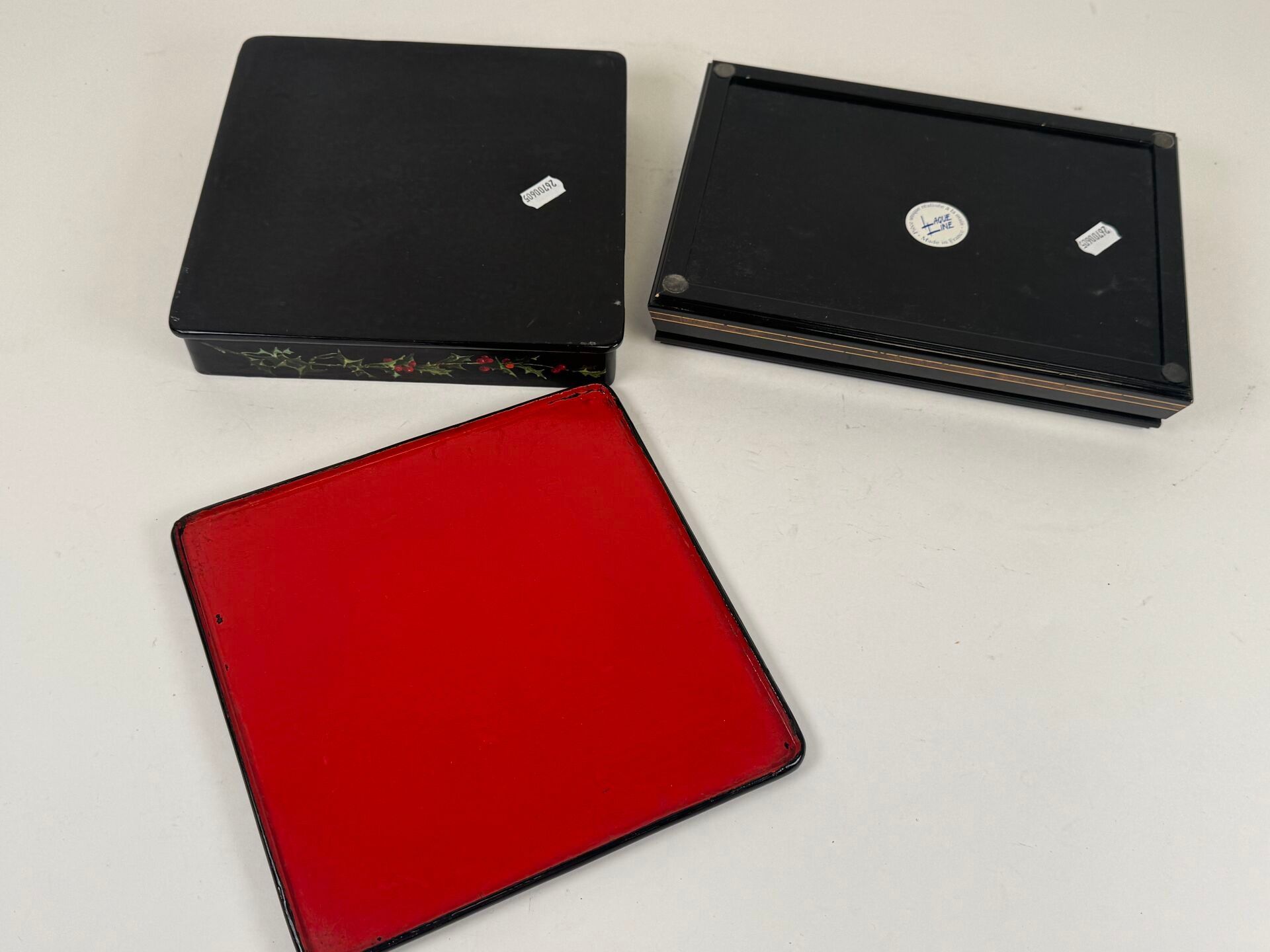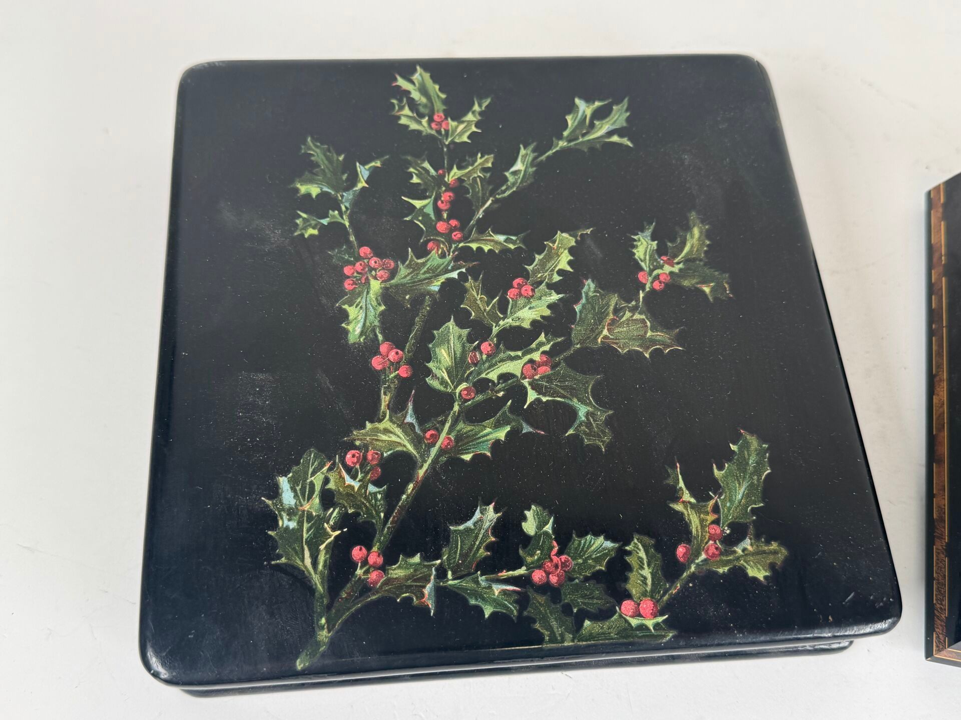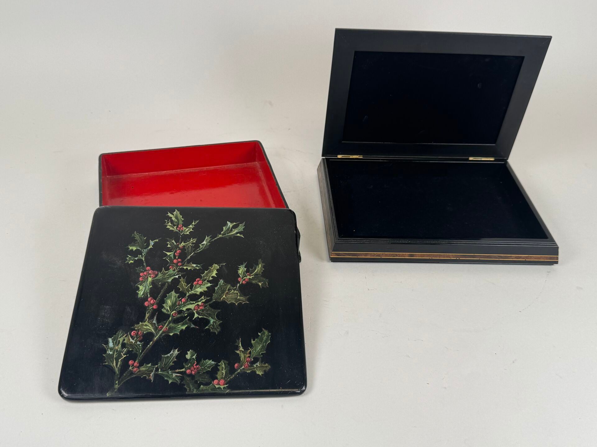 Two boxes, one decorated with holly, the other in lacquer, t…