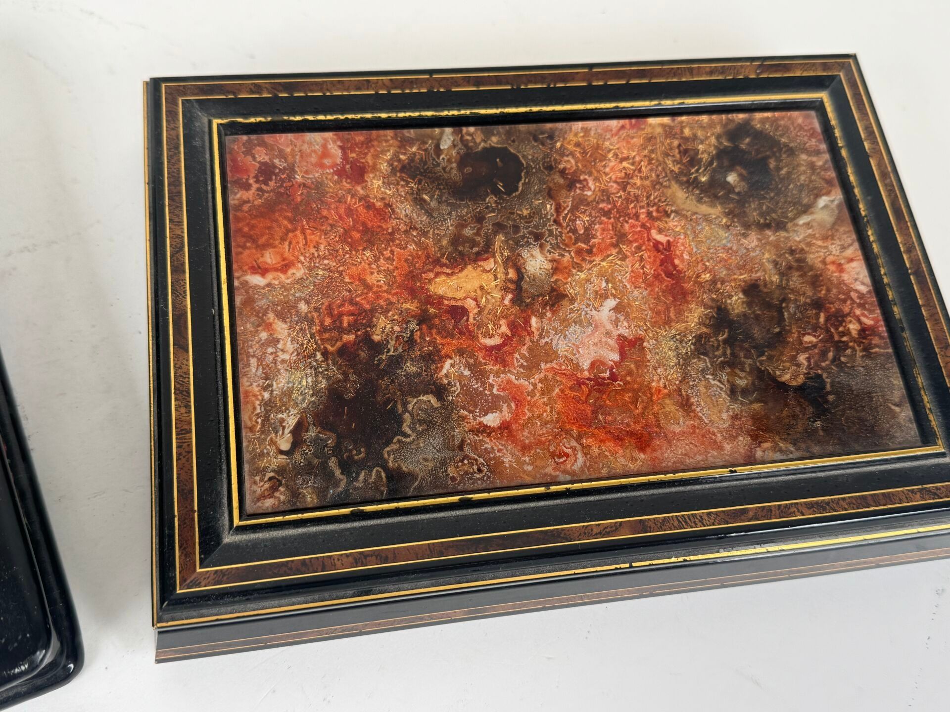 Two boxes, one decorated with holly, the other in lacquer, the lid on a marbled background.