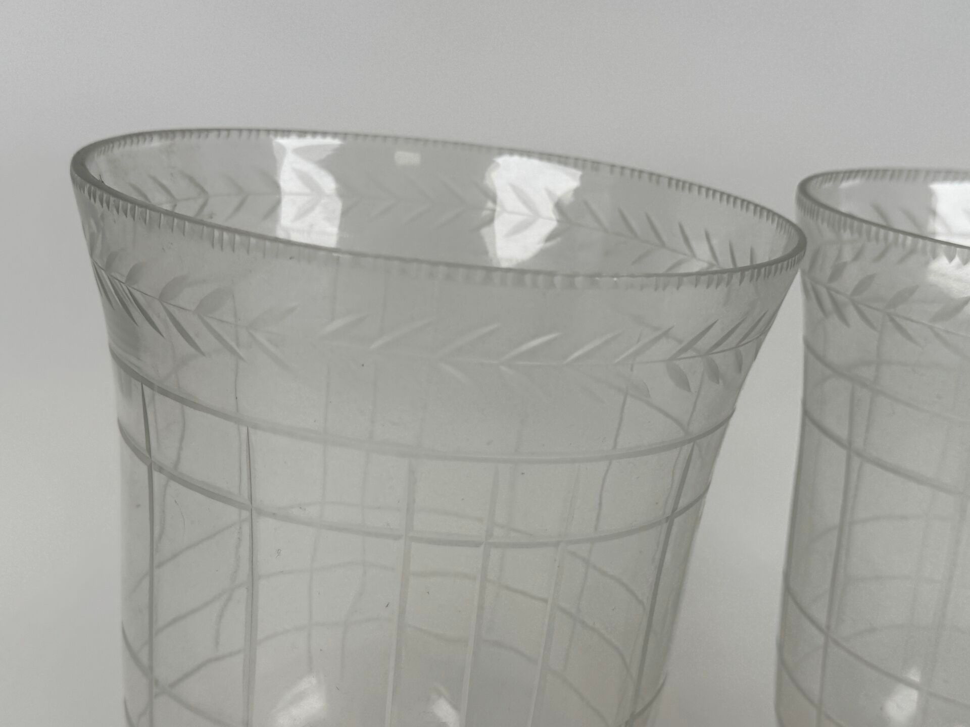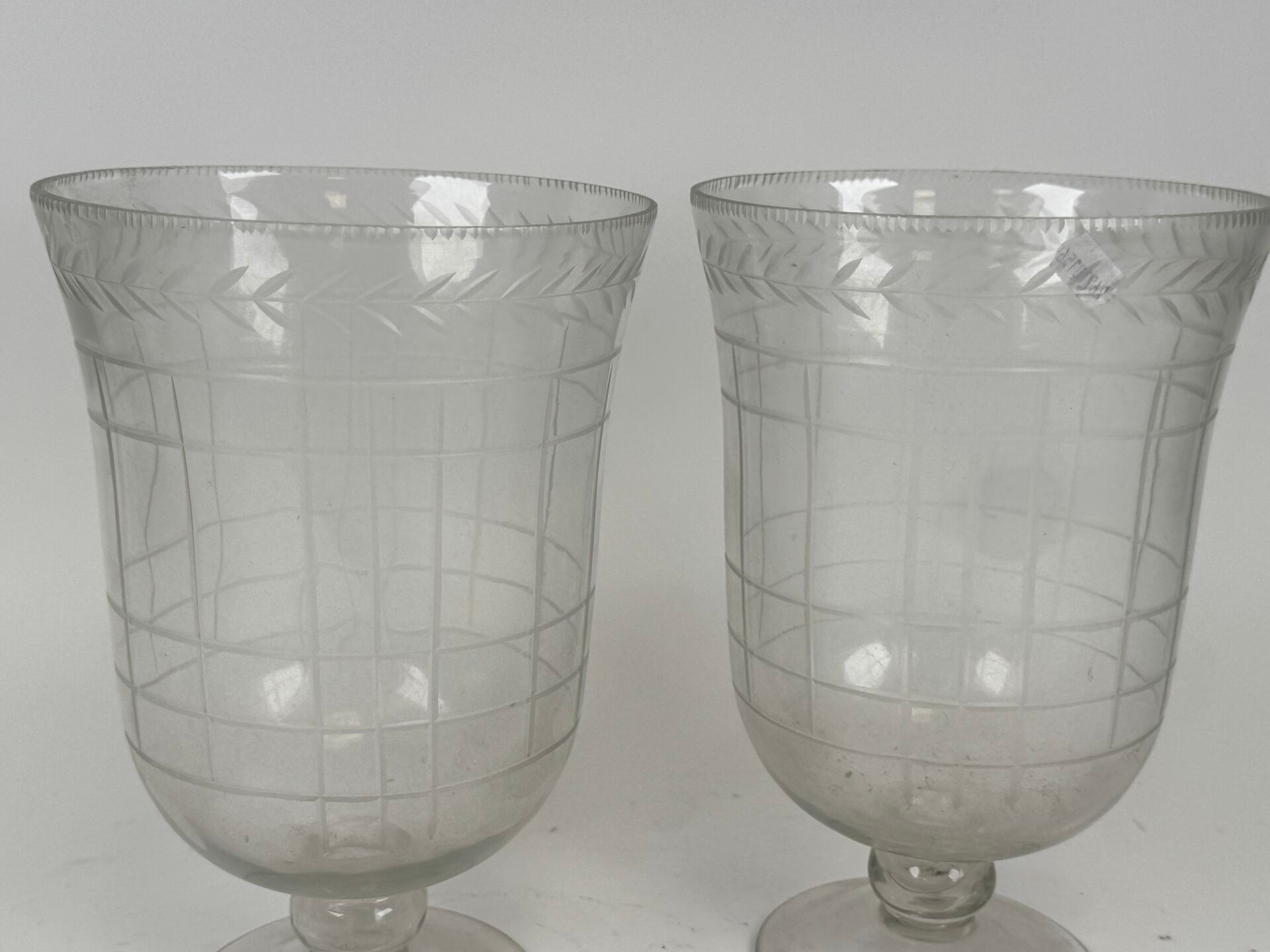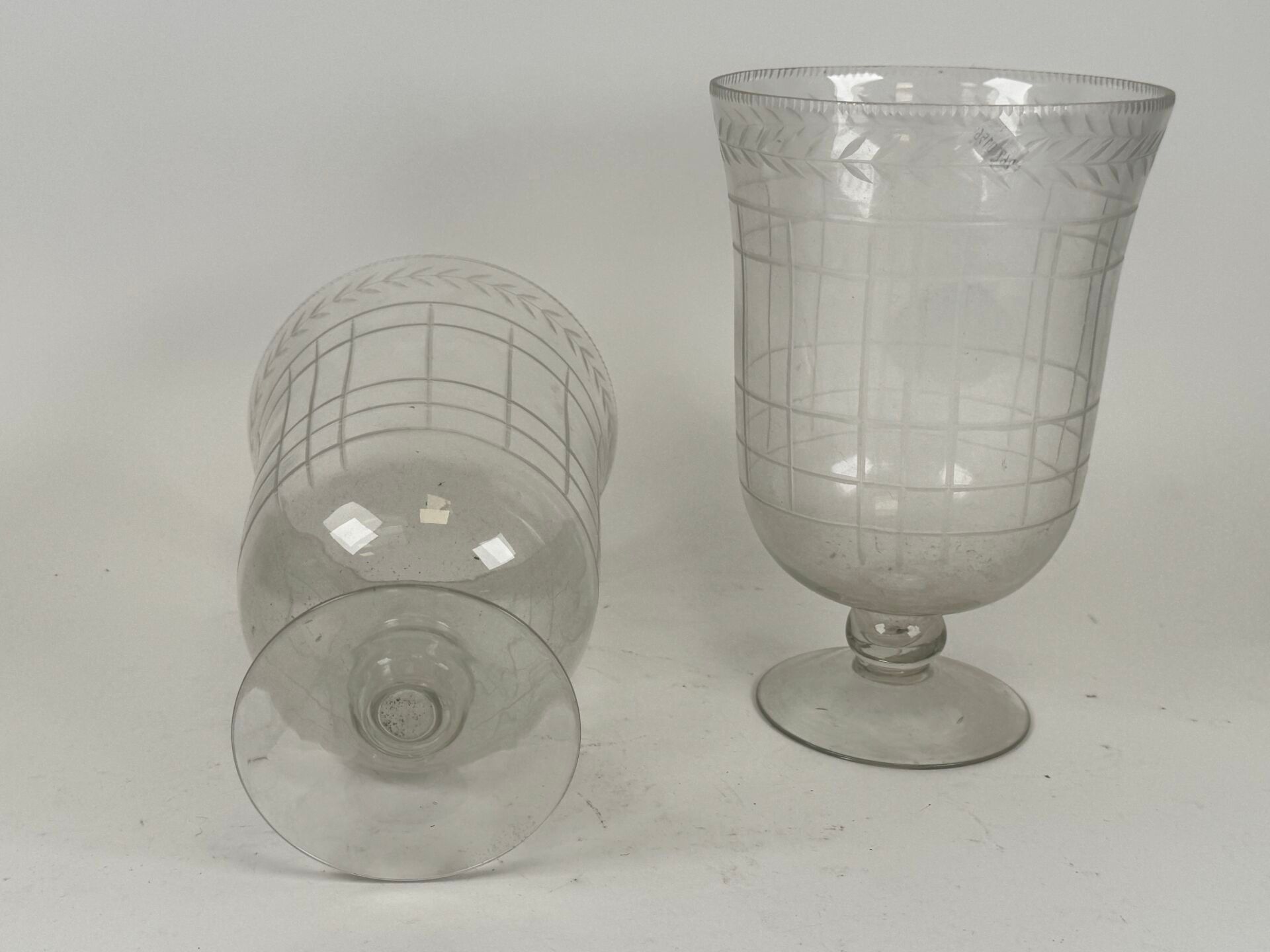 A pair of engraved glass candle holders decorated with geometric motifs and stylised foliage, on circular bases.