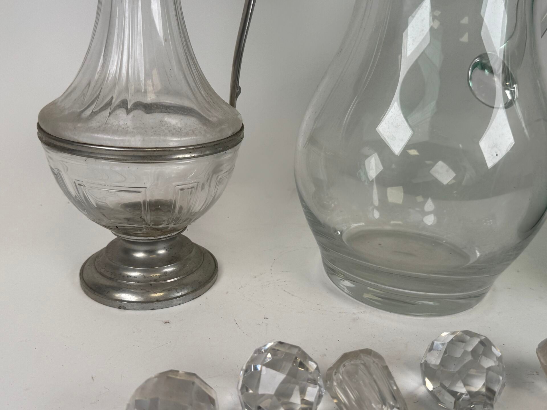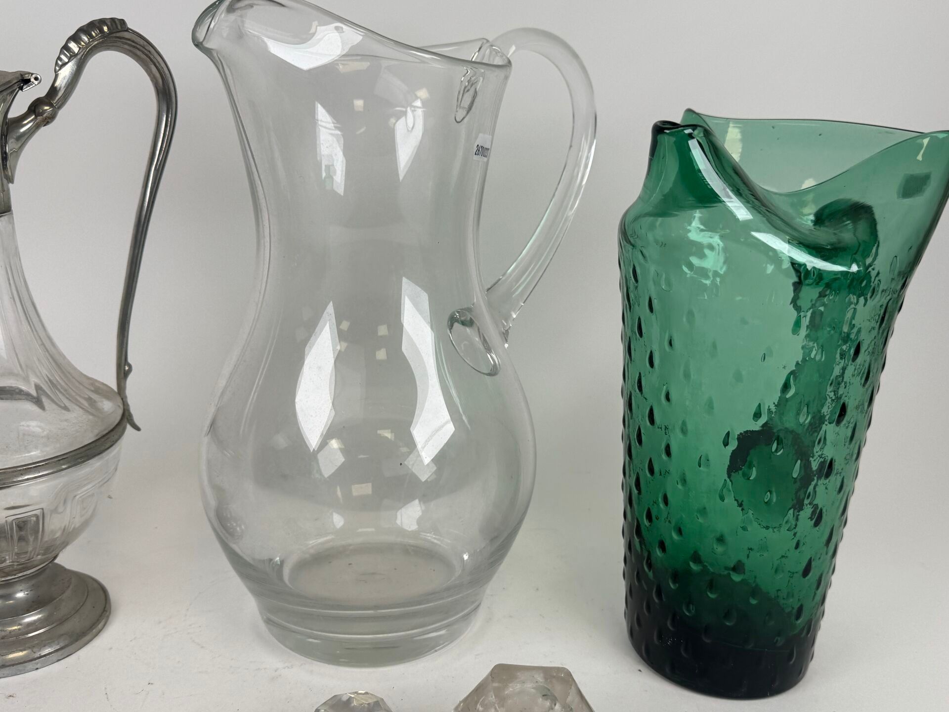 - two carafes, one coloured green with relief decoration of droplets.