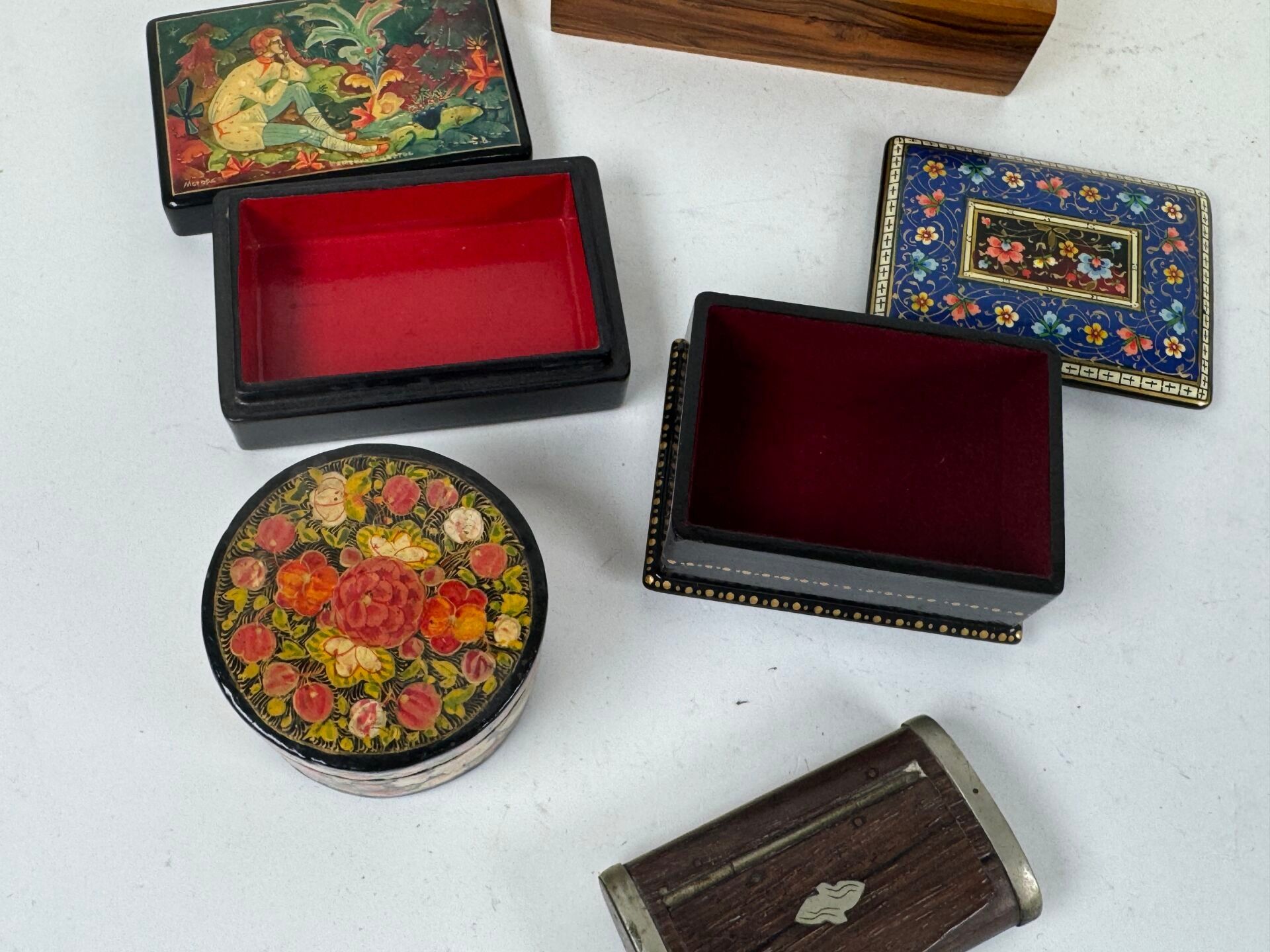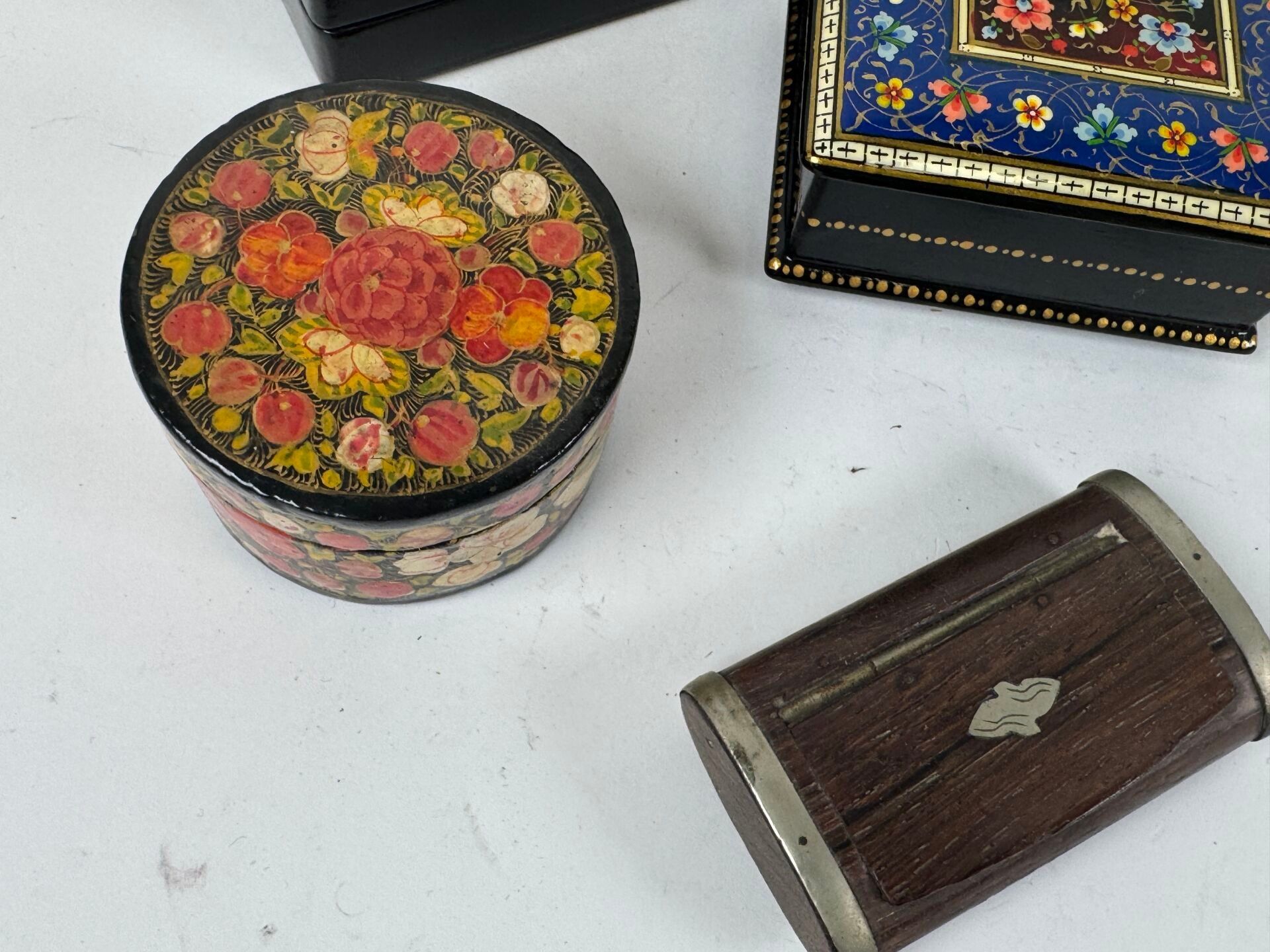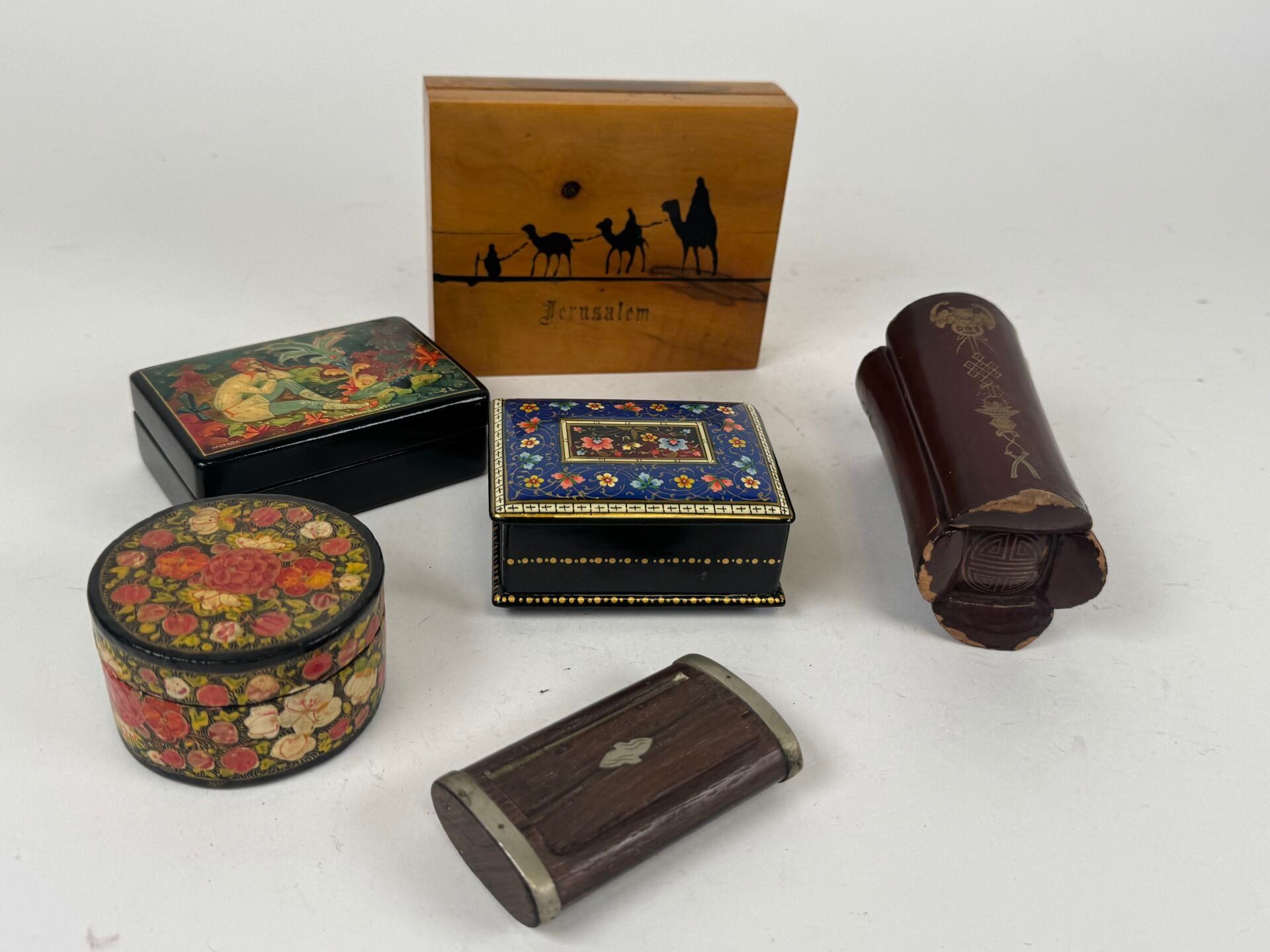 Five wooden or boiled cardboard boxes are included, including two Russian ones, a "Jerusalem" mark and a snuffbox;