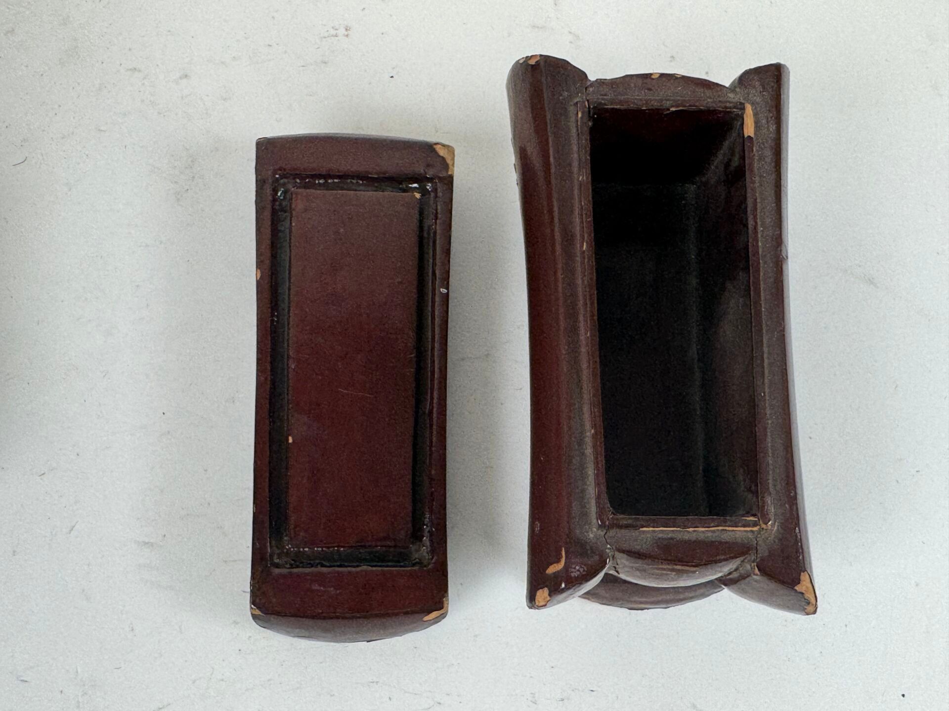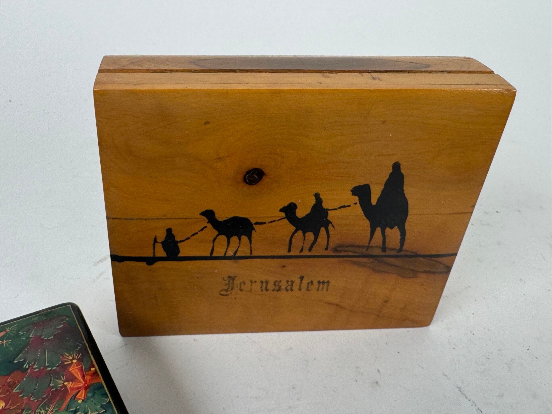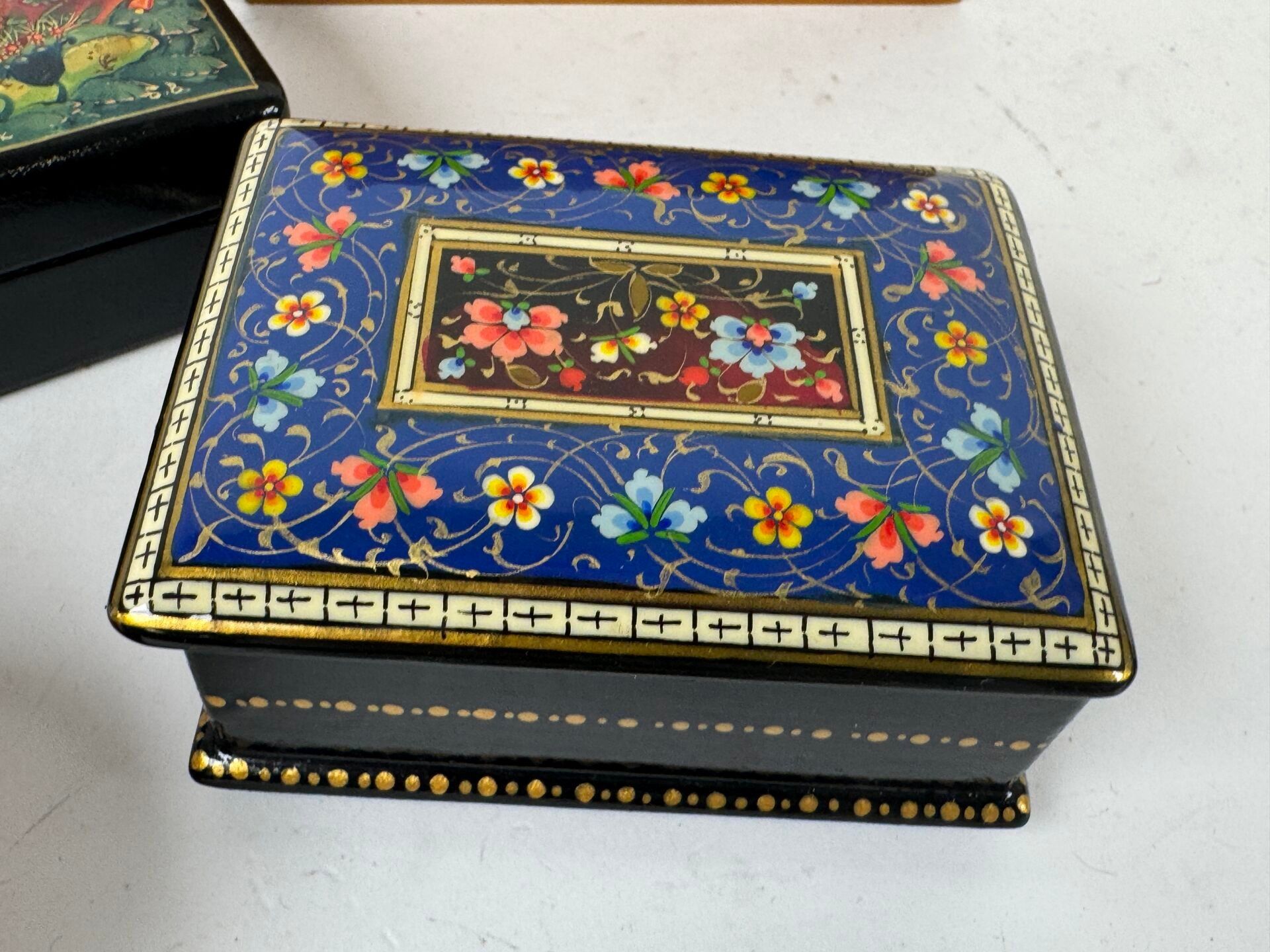 Five wooden or boiled cardboard boxes are included, including two Russian ones, a "Jerusalem" mark and a snuffbox;