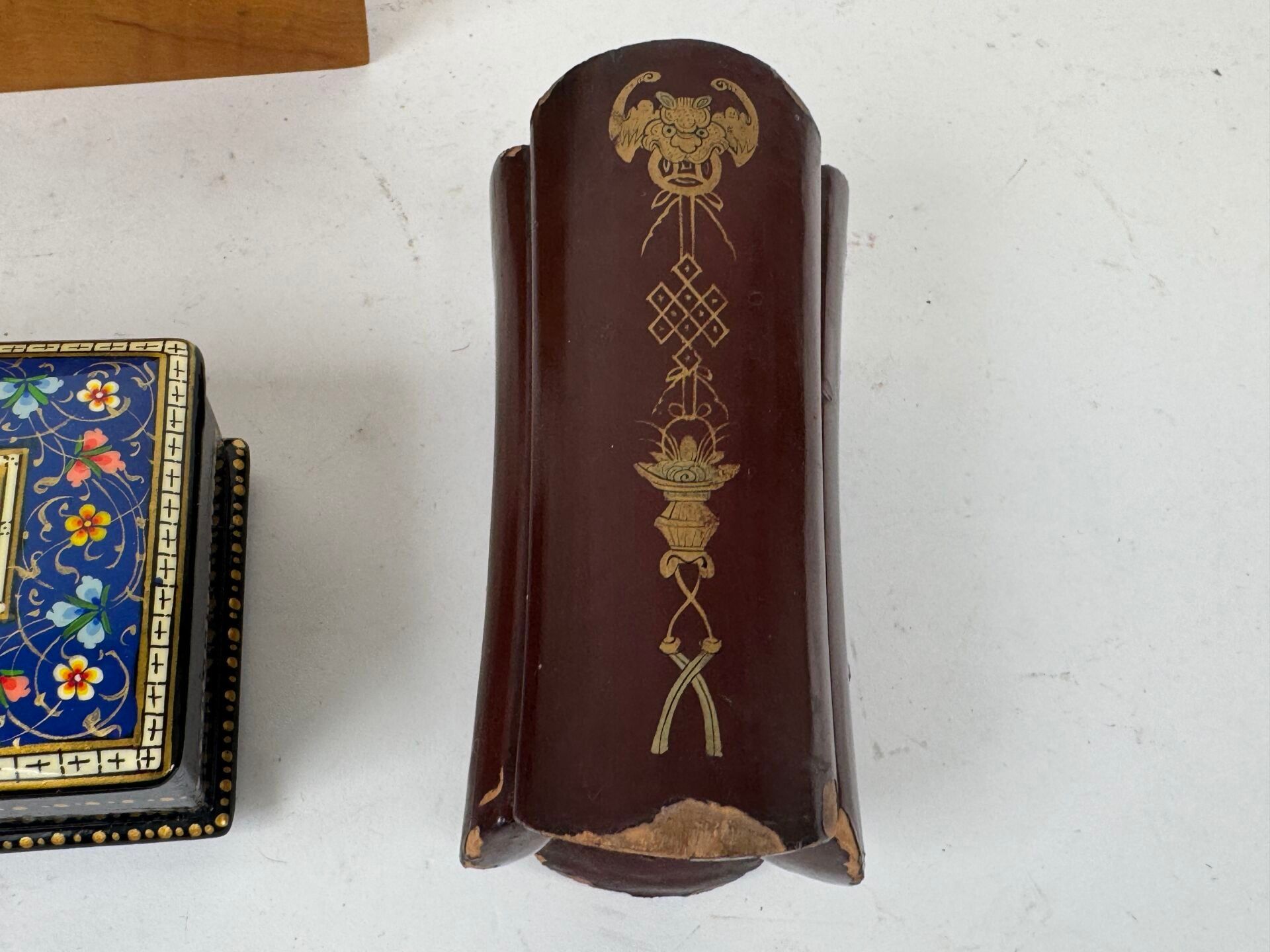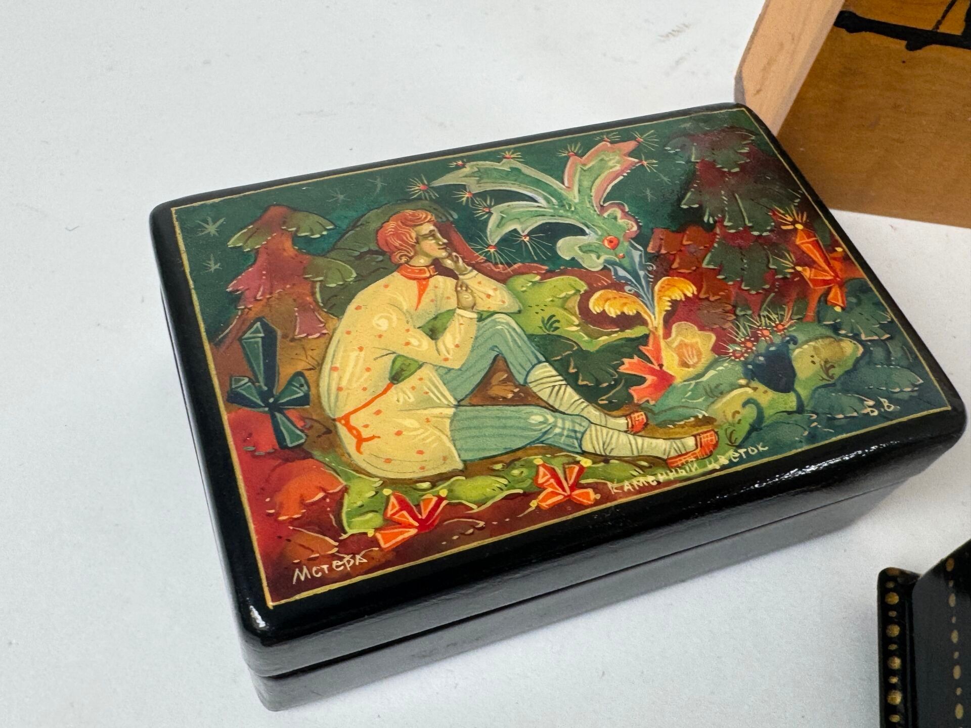 Small lacquered wood box with gold decoration of a stylized dragon.