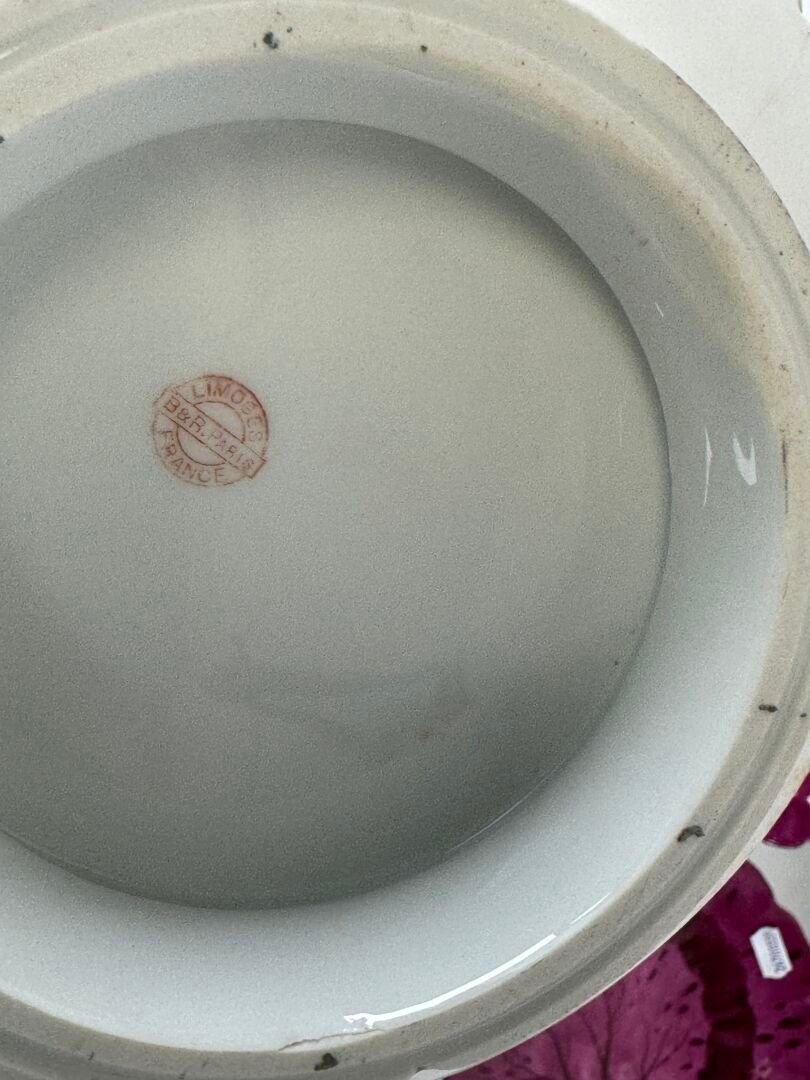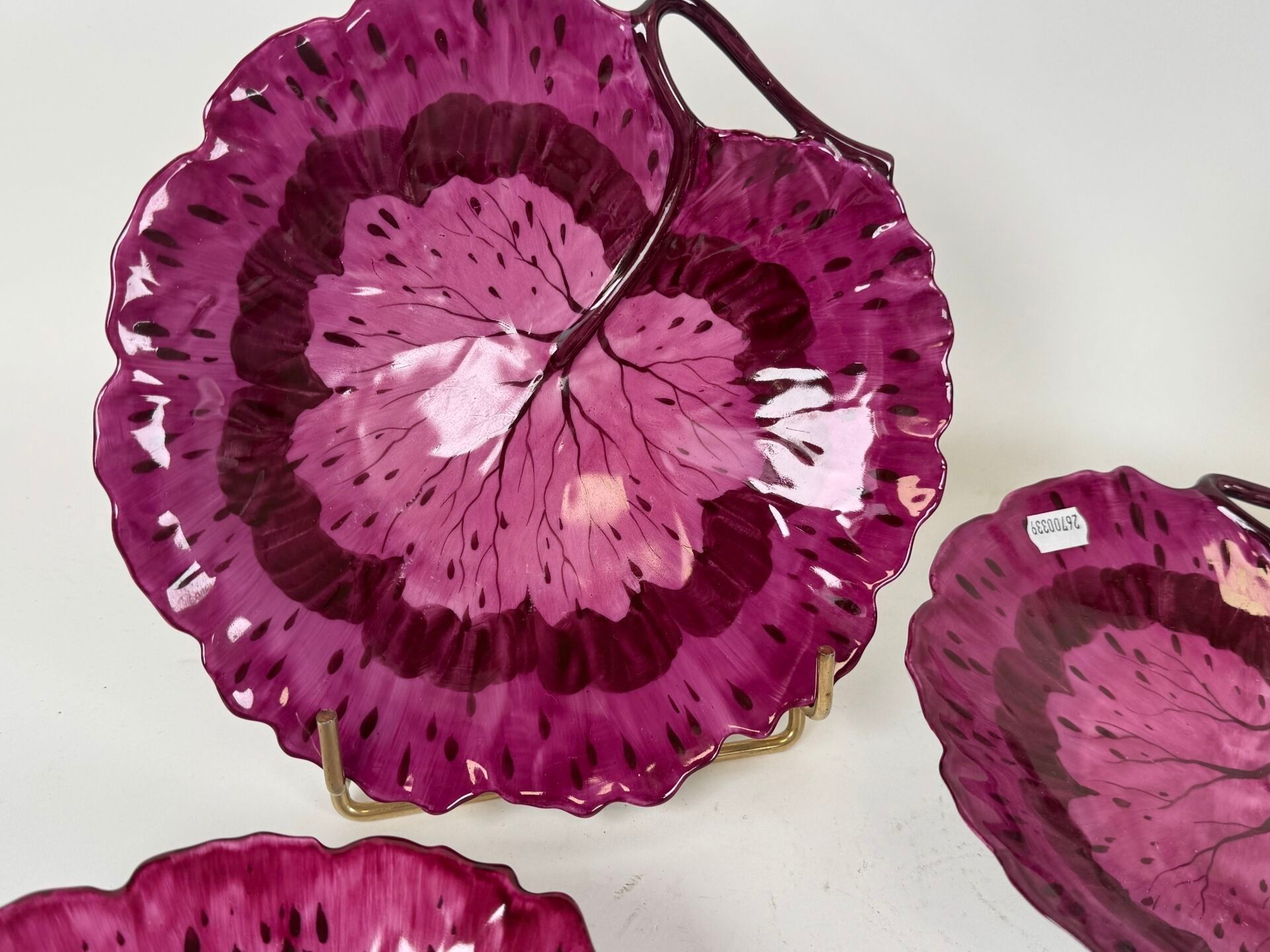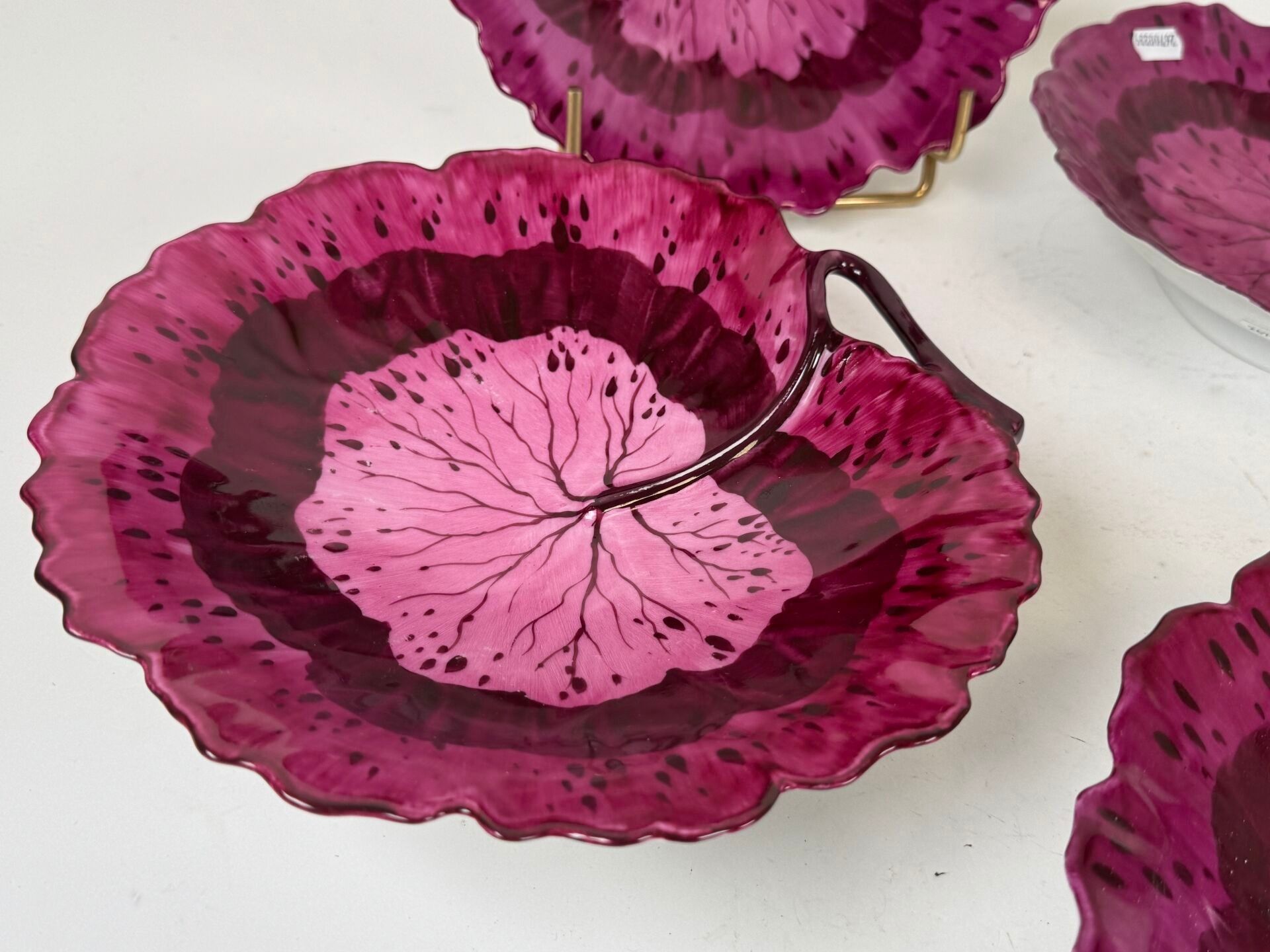 4 bowls or soup plates decorated with leaves on a mauve background.