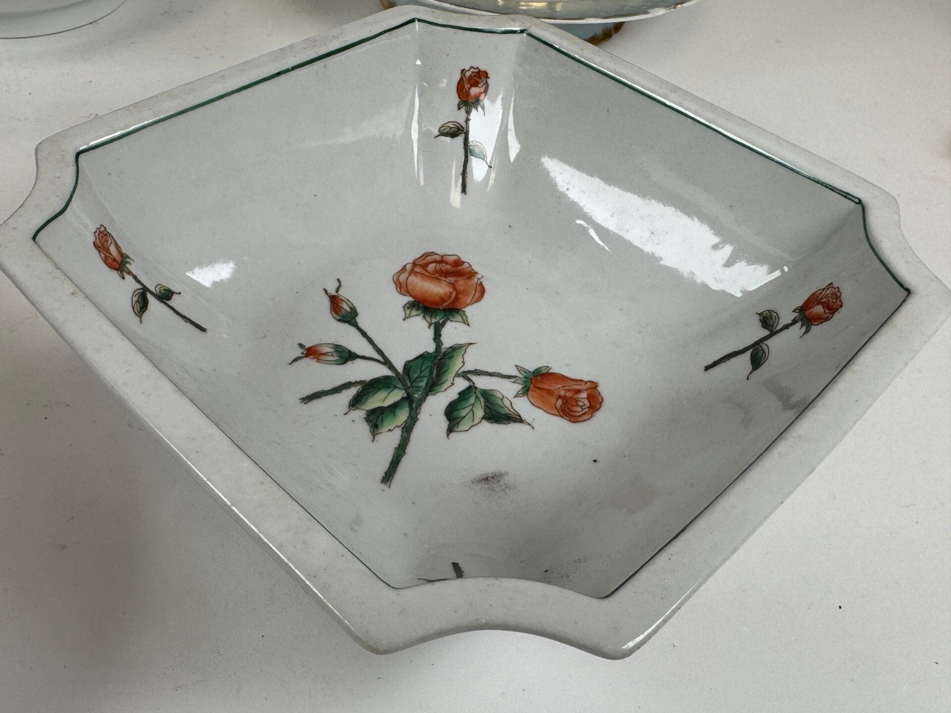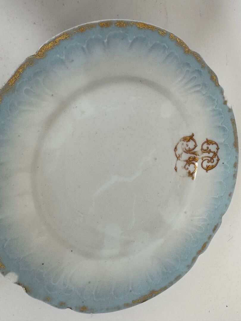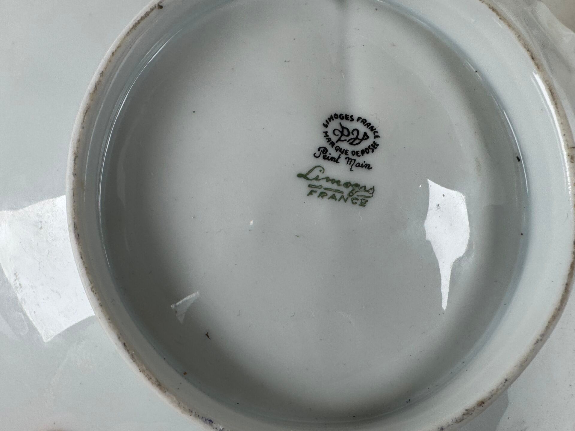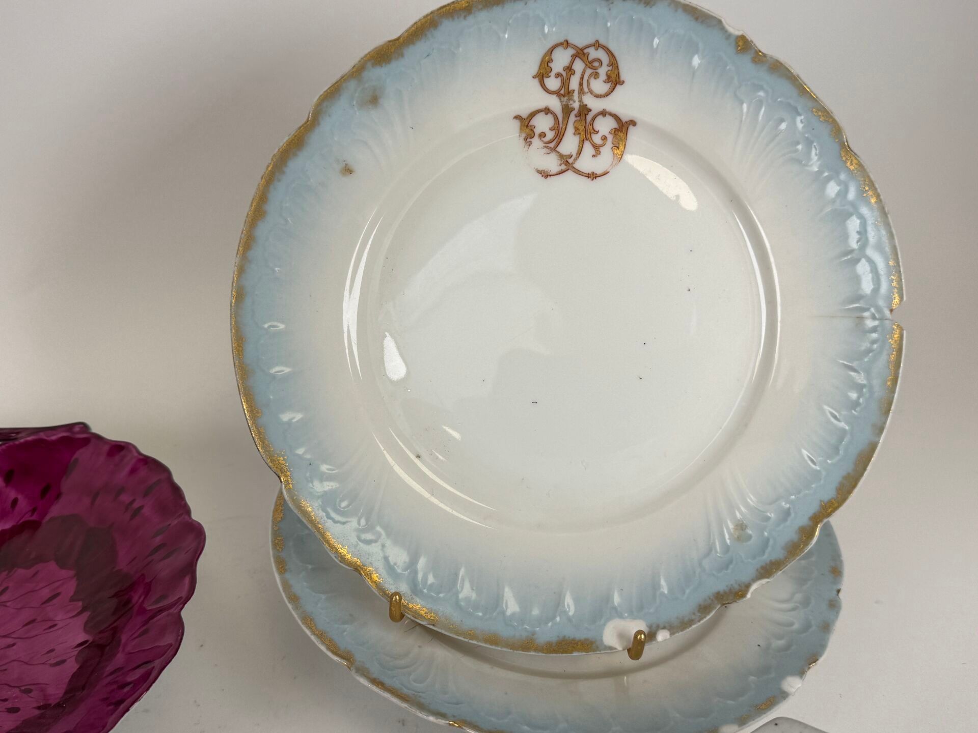 4 bowls or soup plates decorated with leaves on a mauve background.