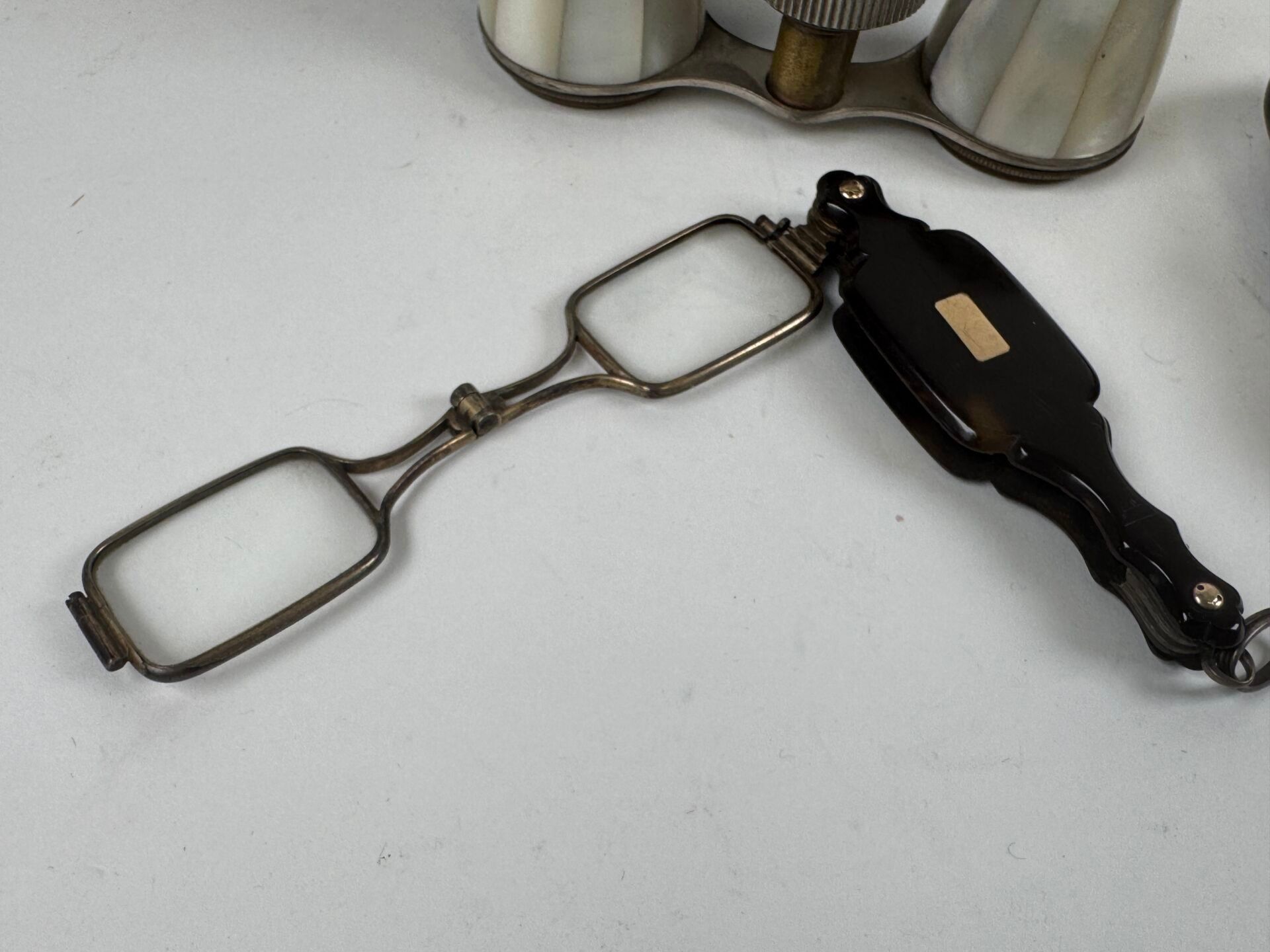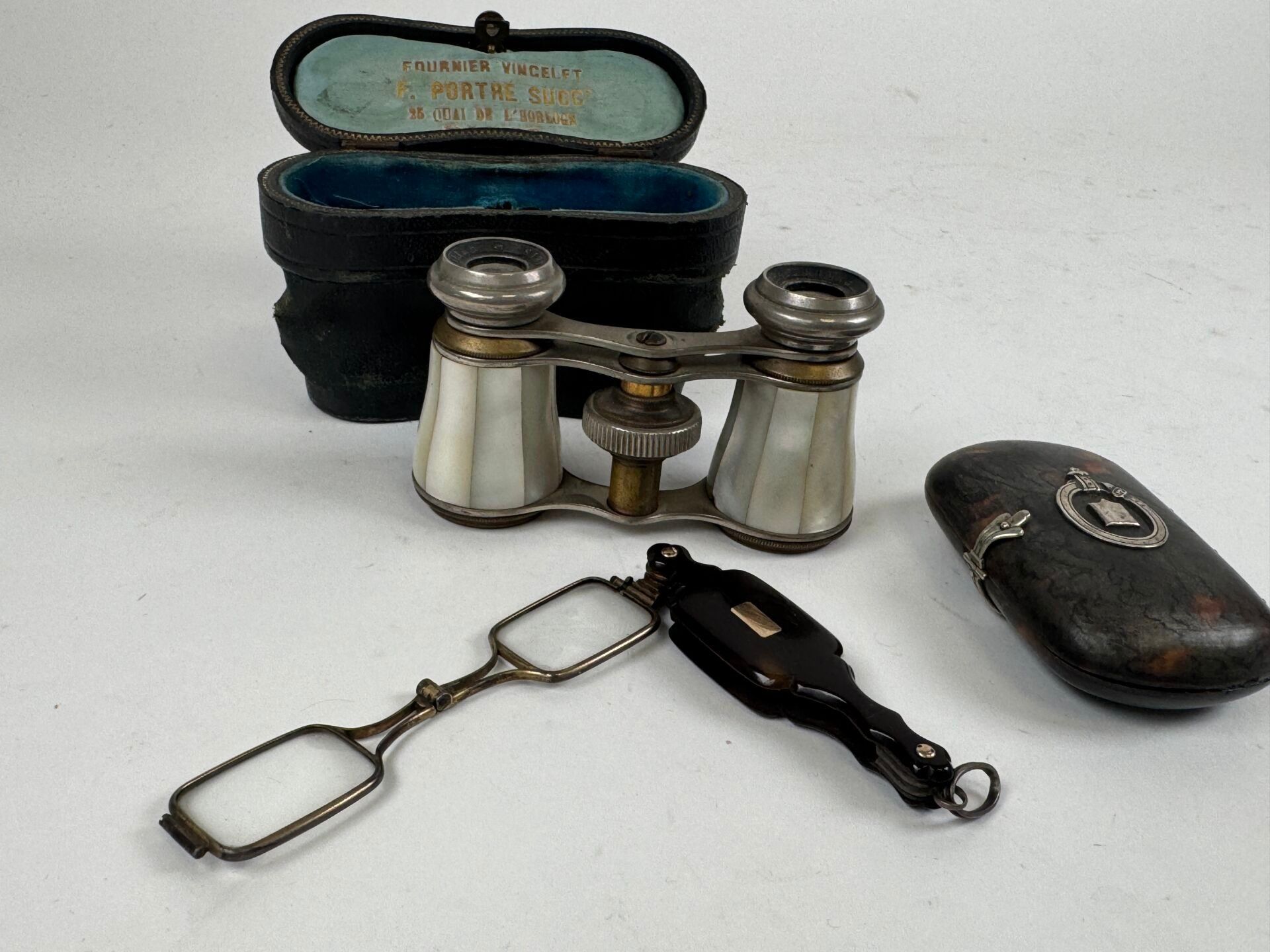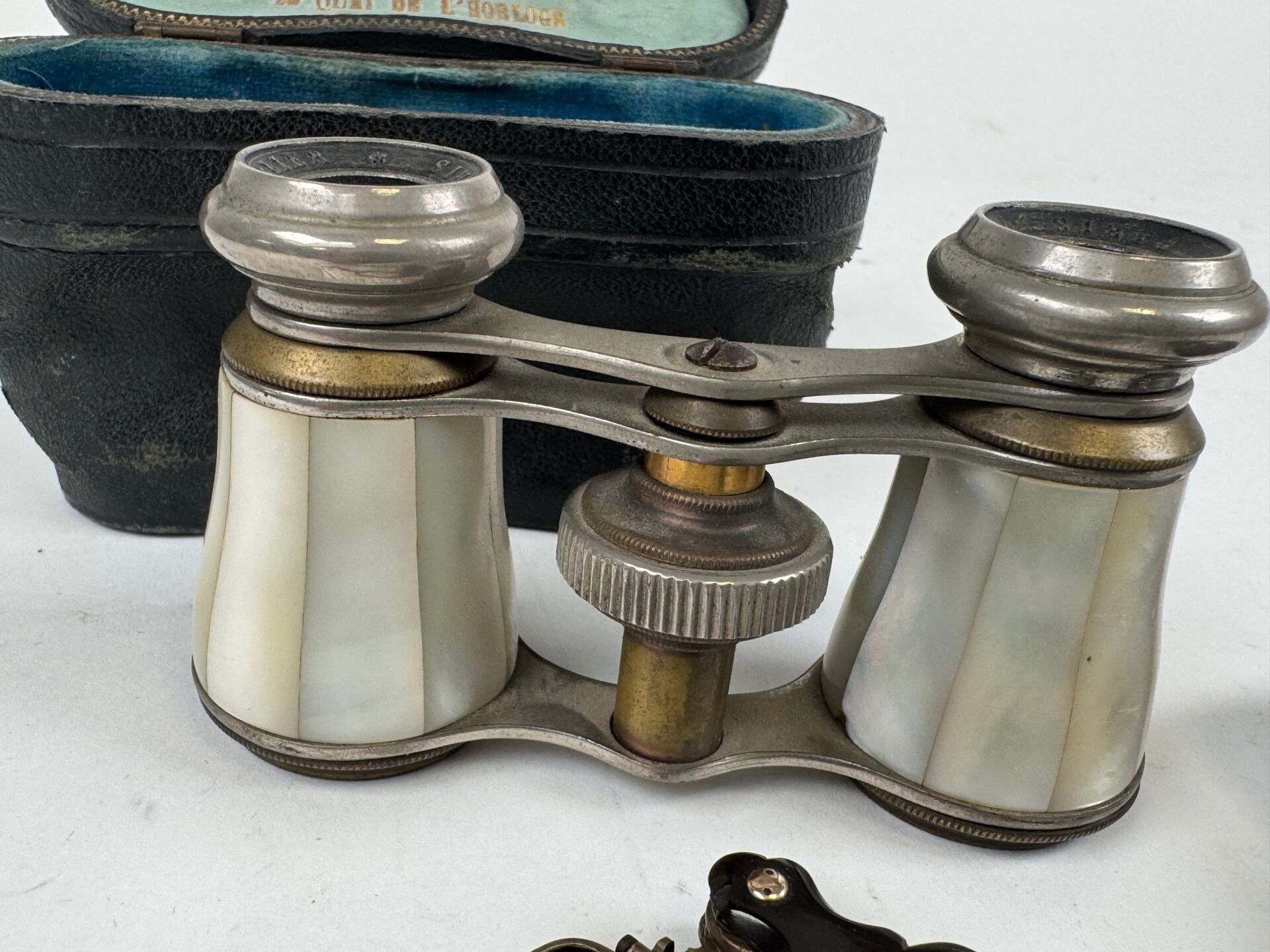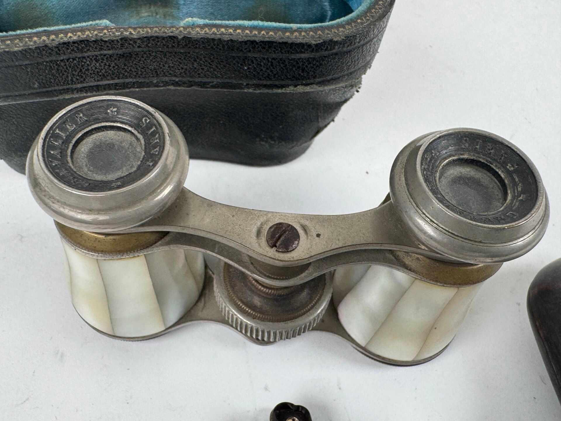 - CHEVALIER à Paris - Pair of mother-of-pearl and metal theatre binoculars, presented in a case.