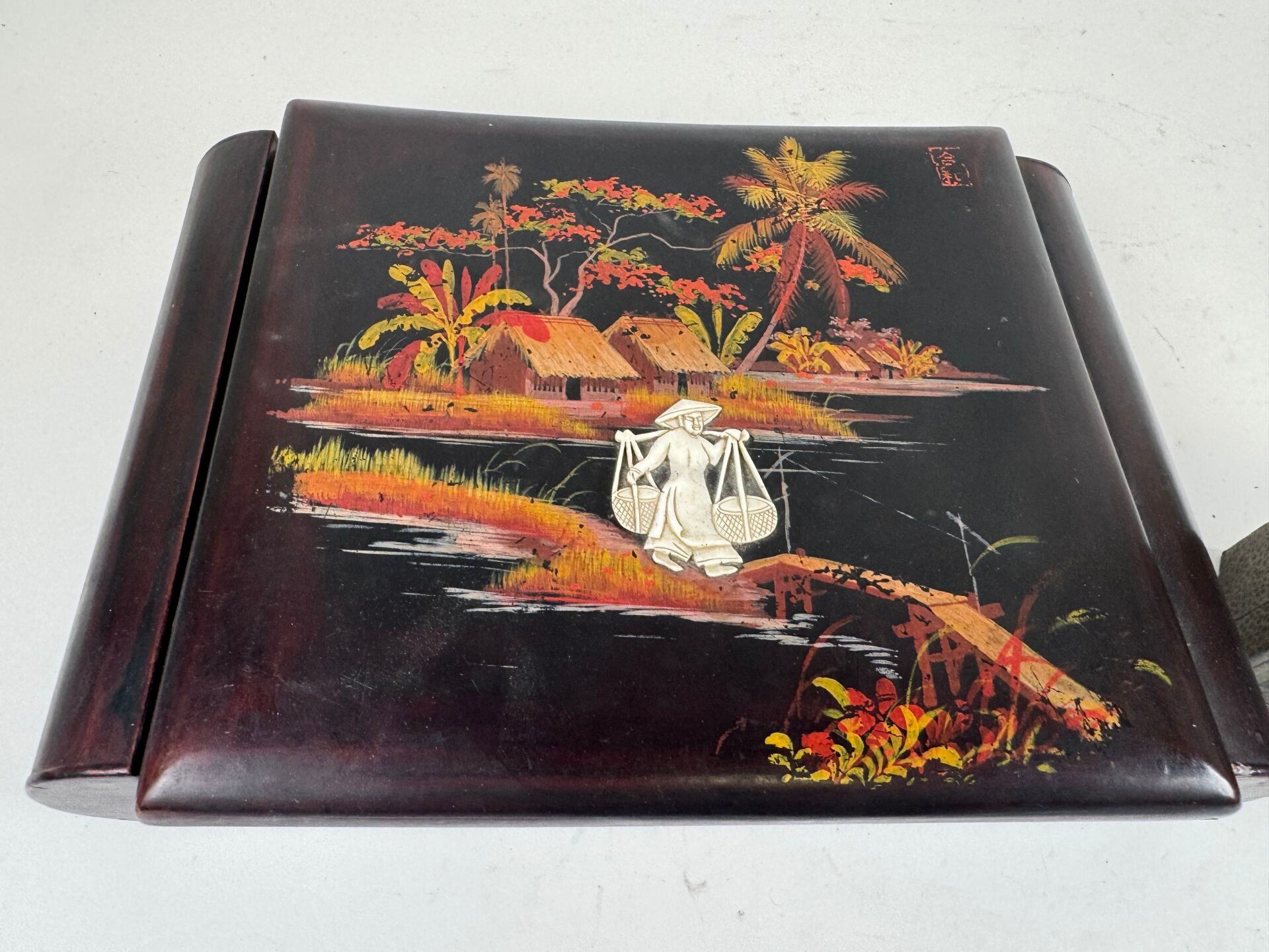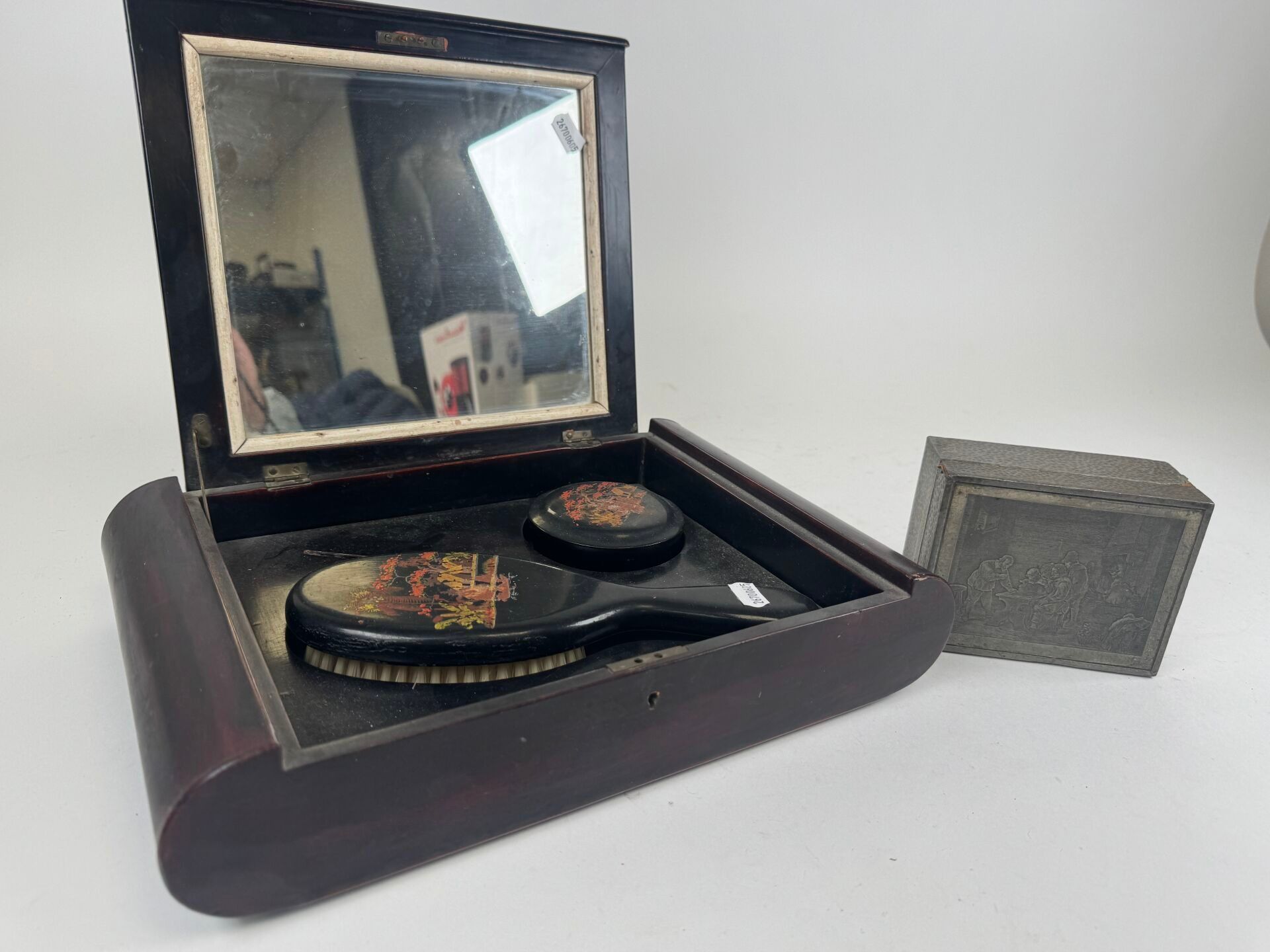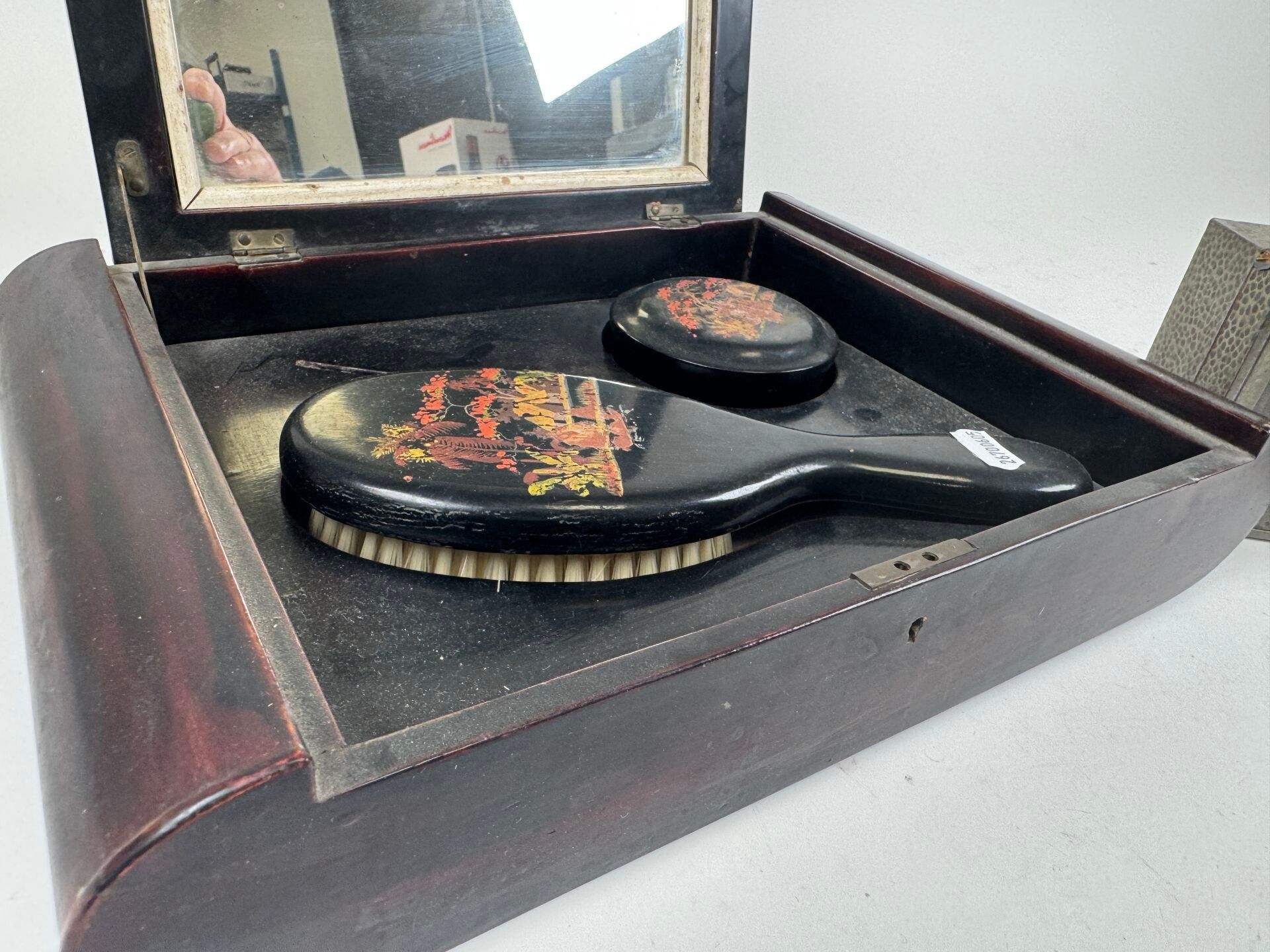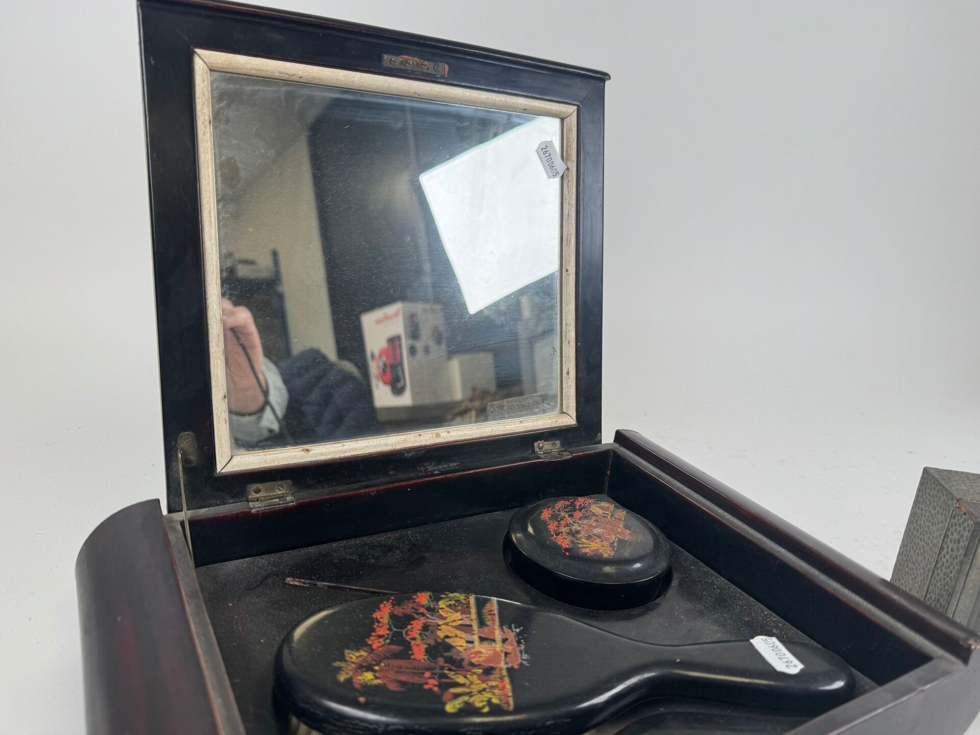 Small travel dressing table in lacquered wood and ivory inlay decorated with a landscape, inside a mirror with brush and small circular box.