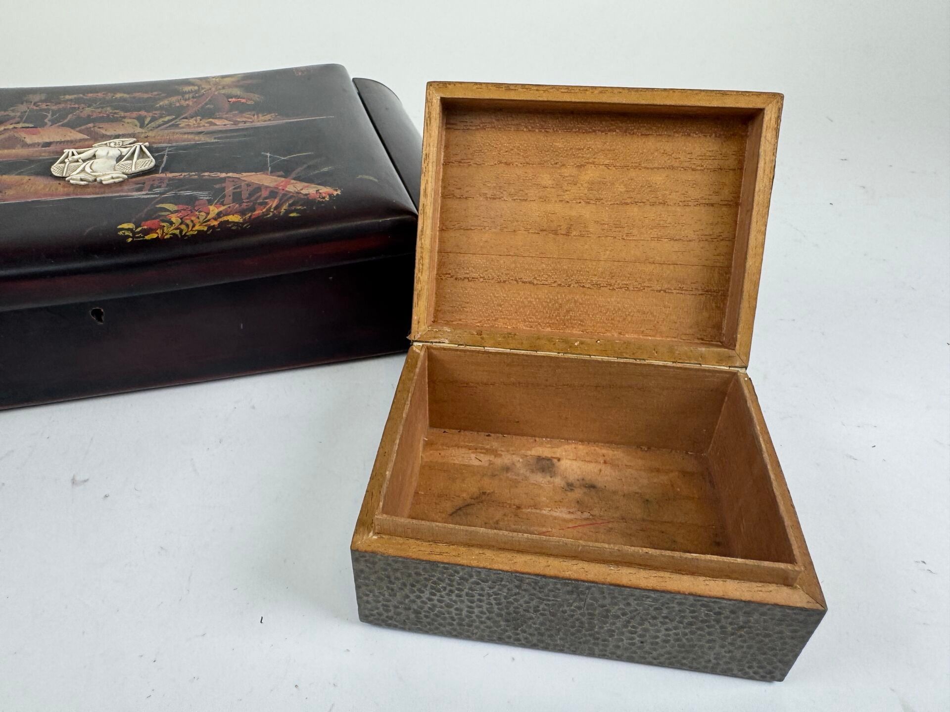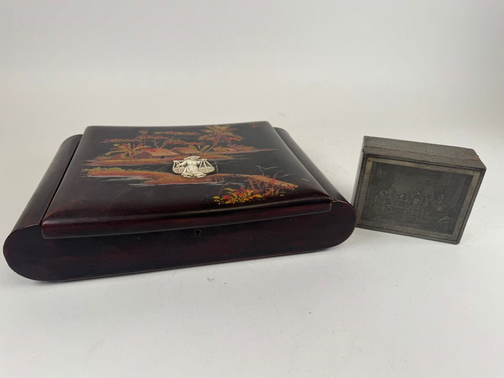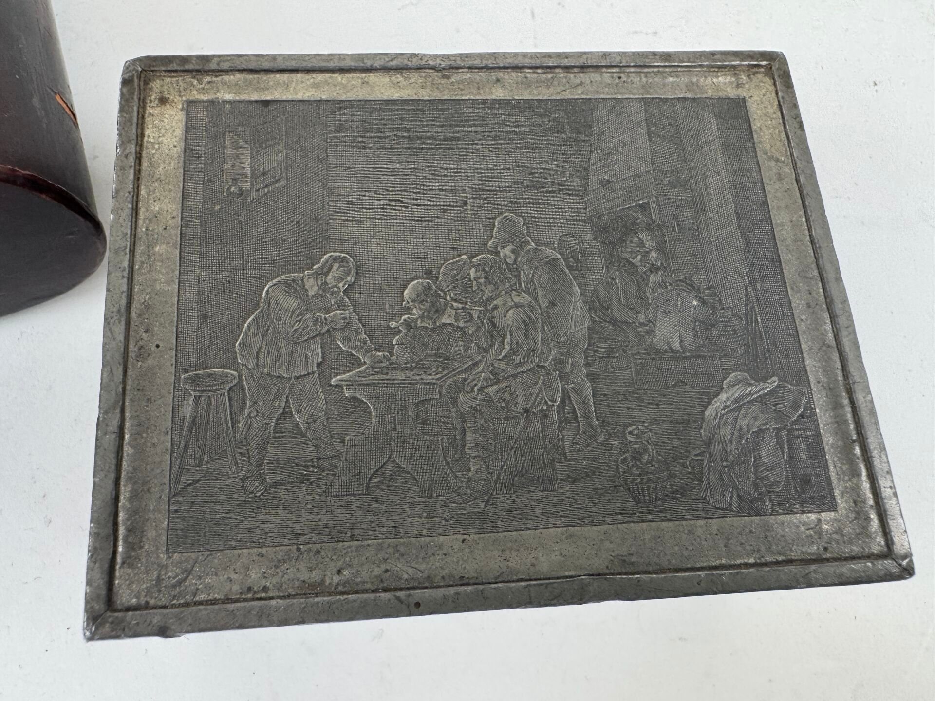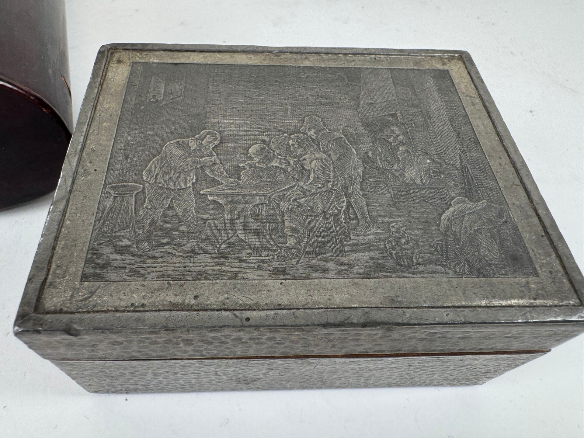 - A small rectangular tin-covered wooden box decorated with a tavern scene.