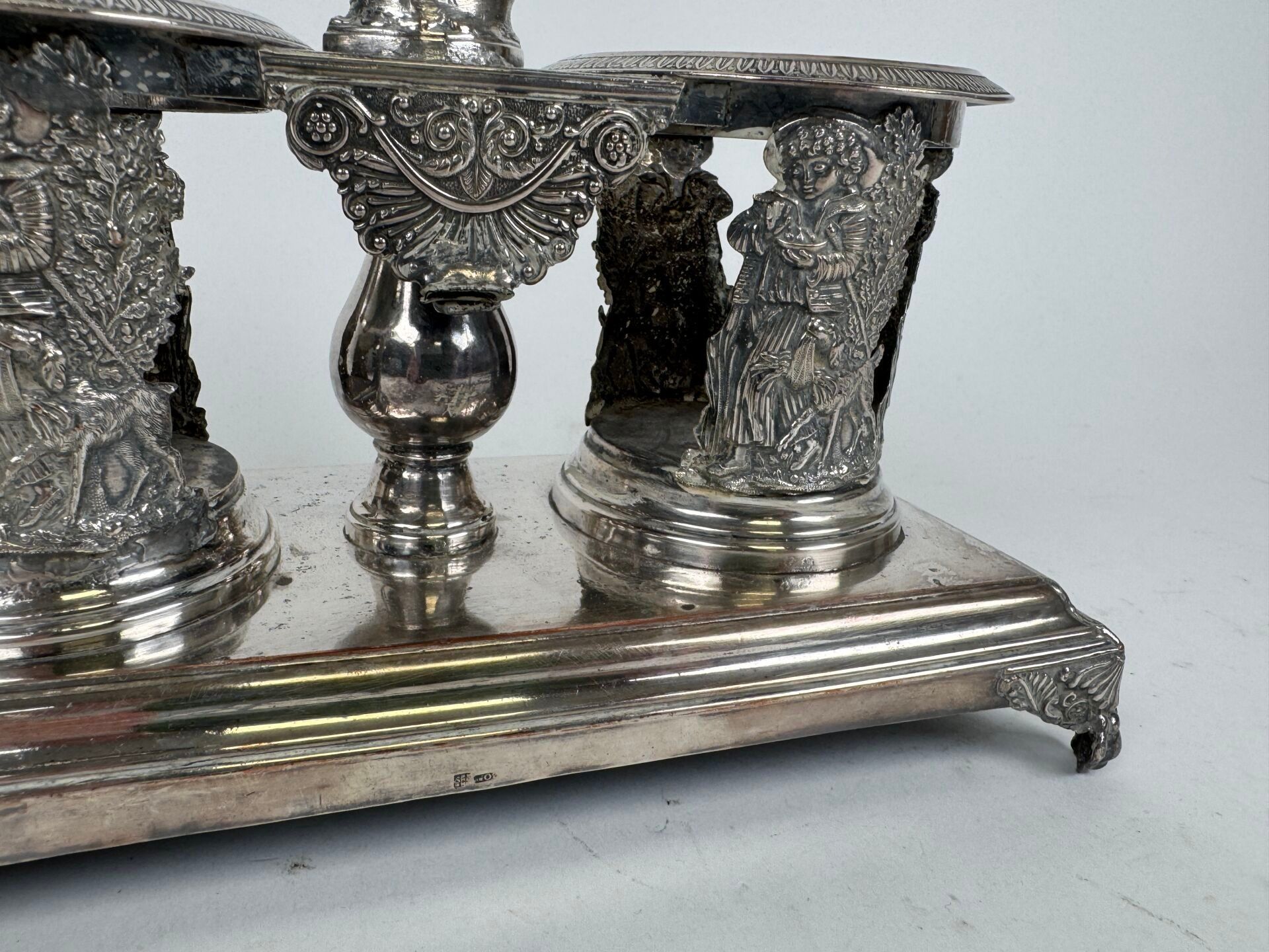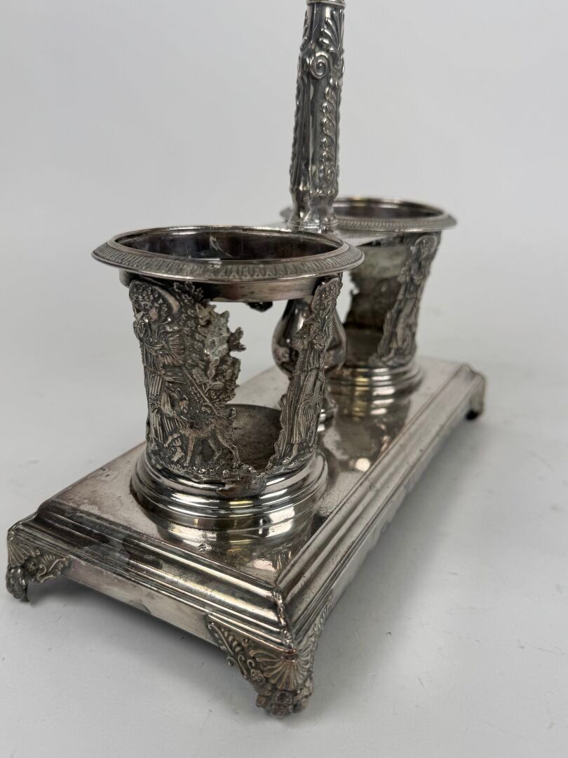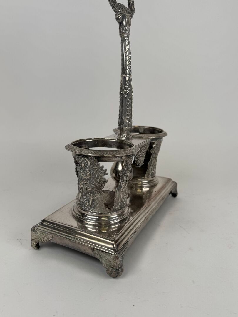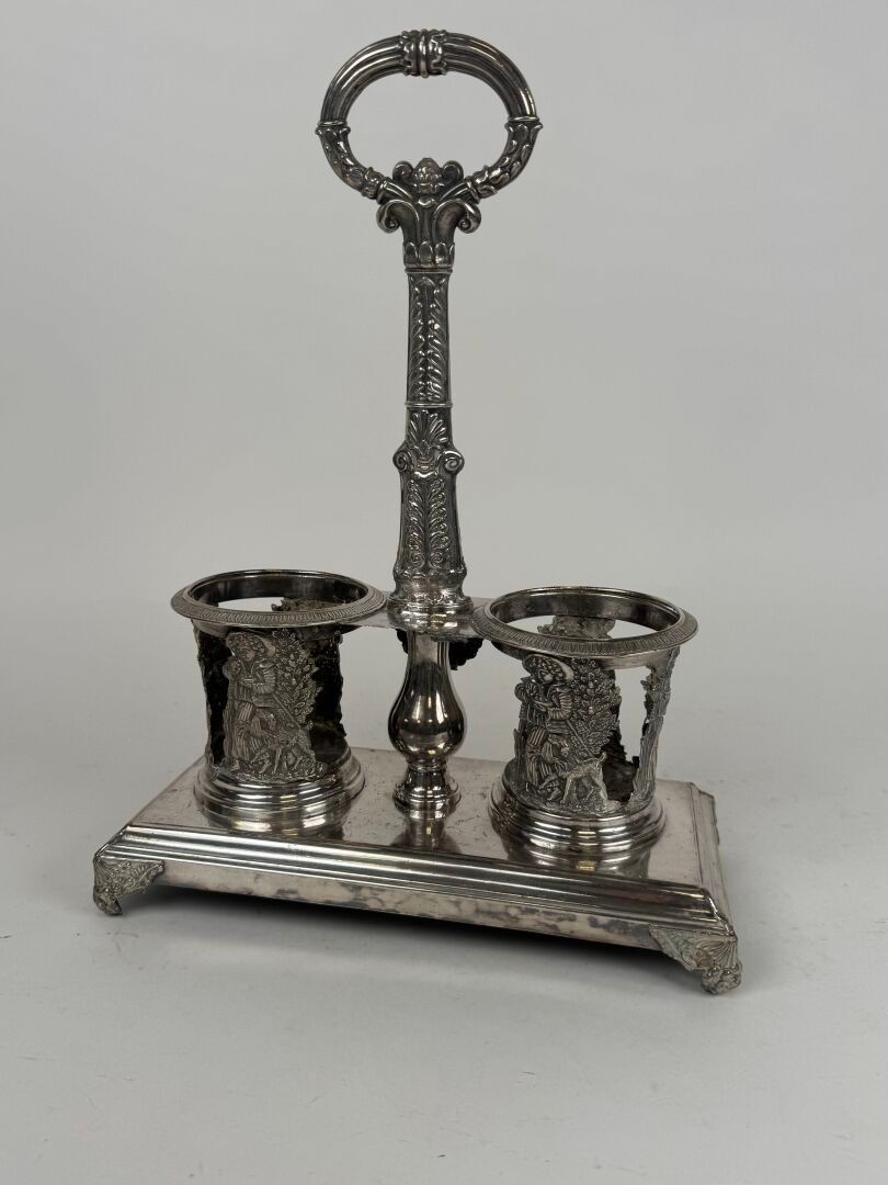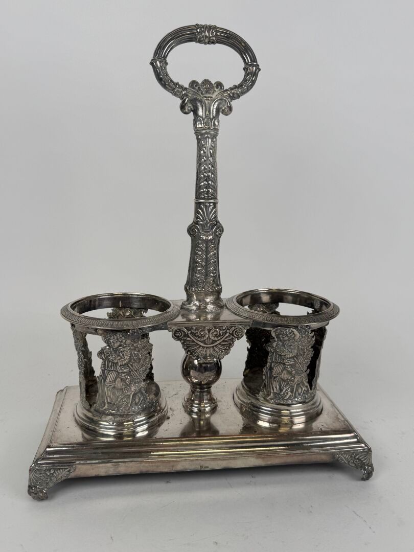 A silver plated oil and vinegar cruet decorated with figures and stylised palmettes.
