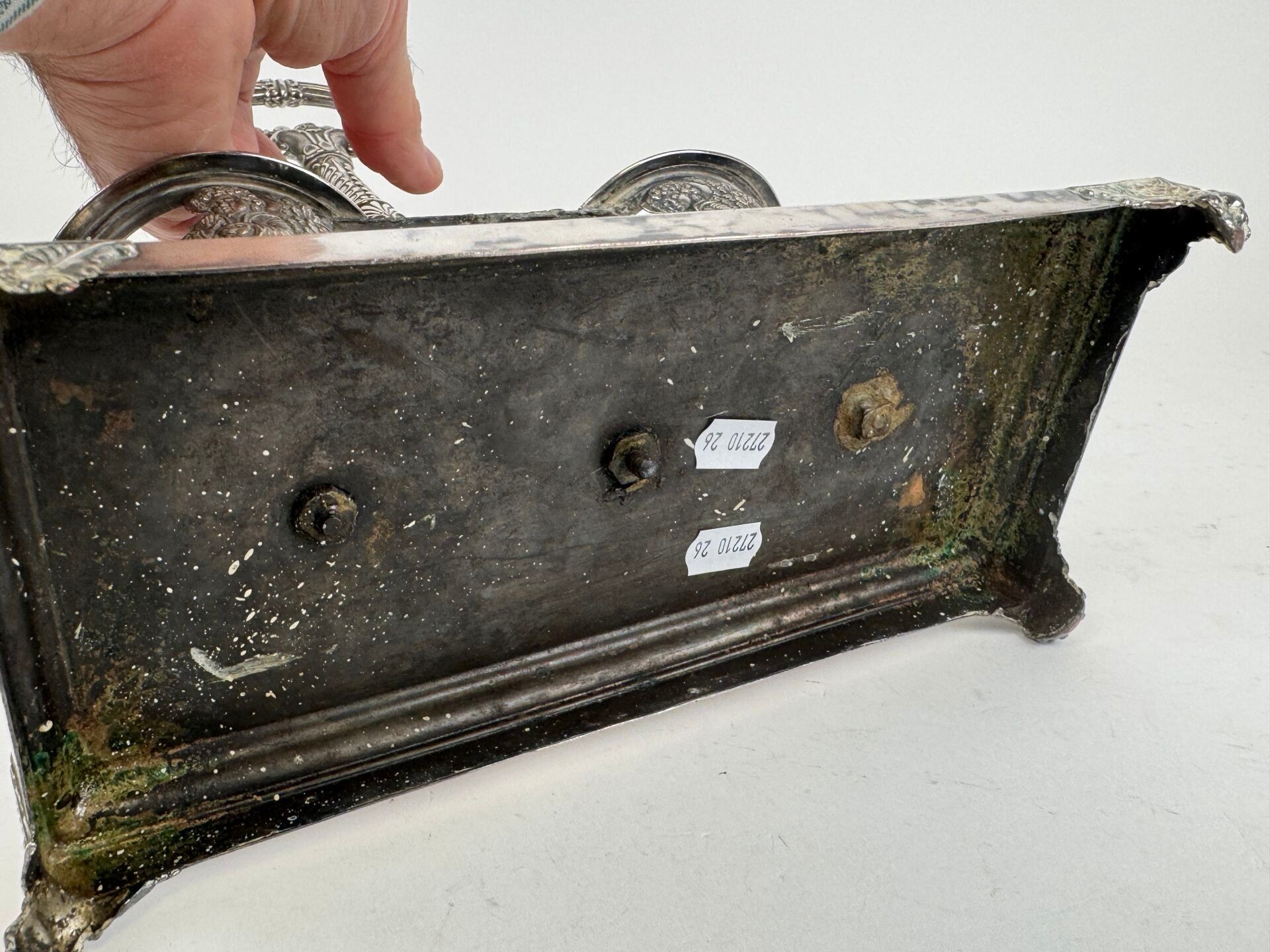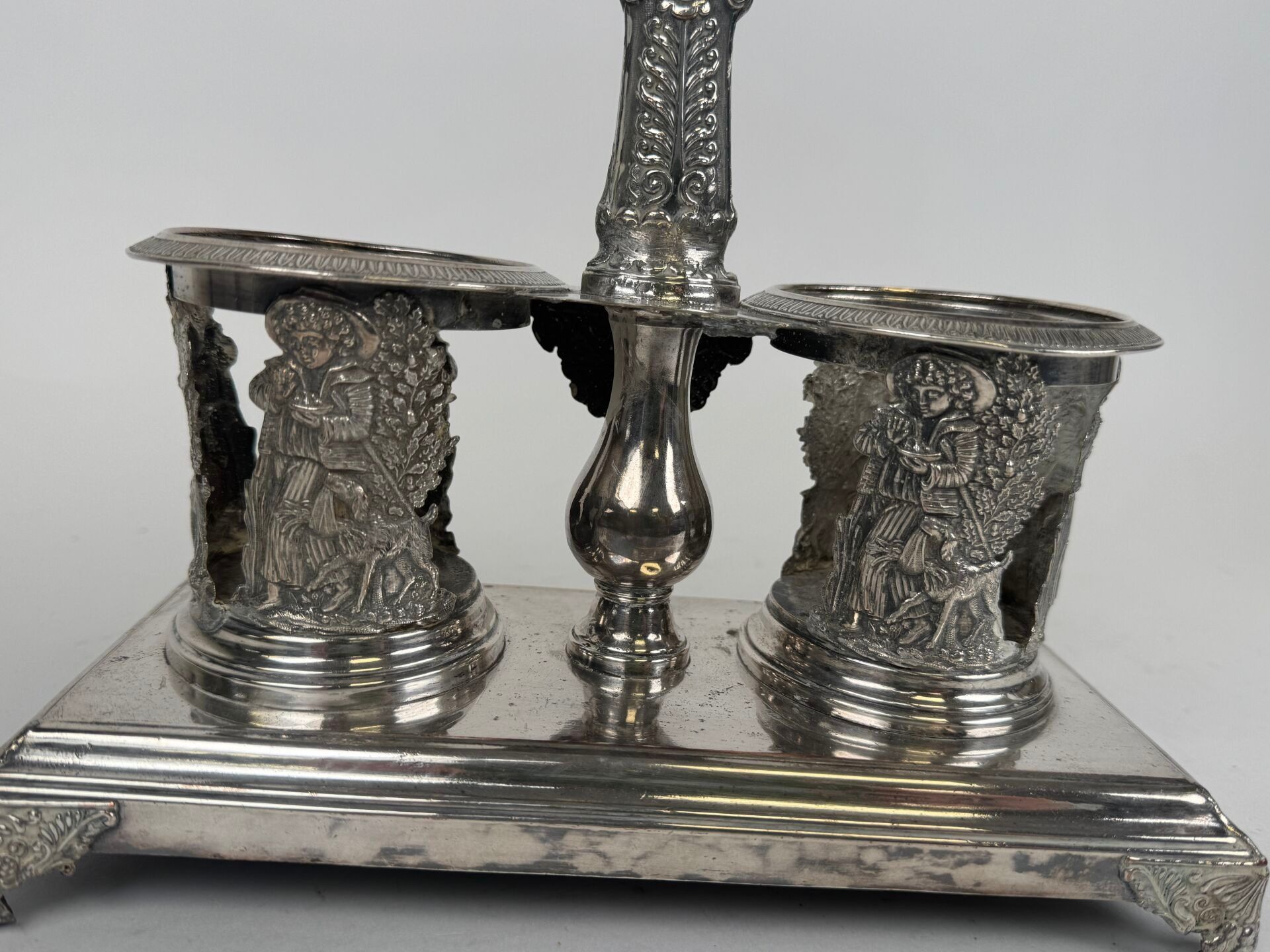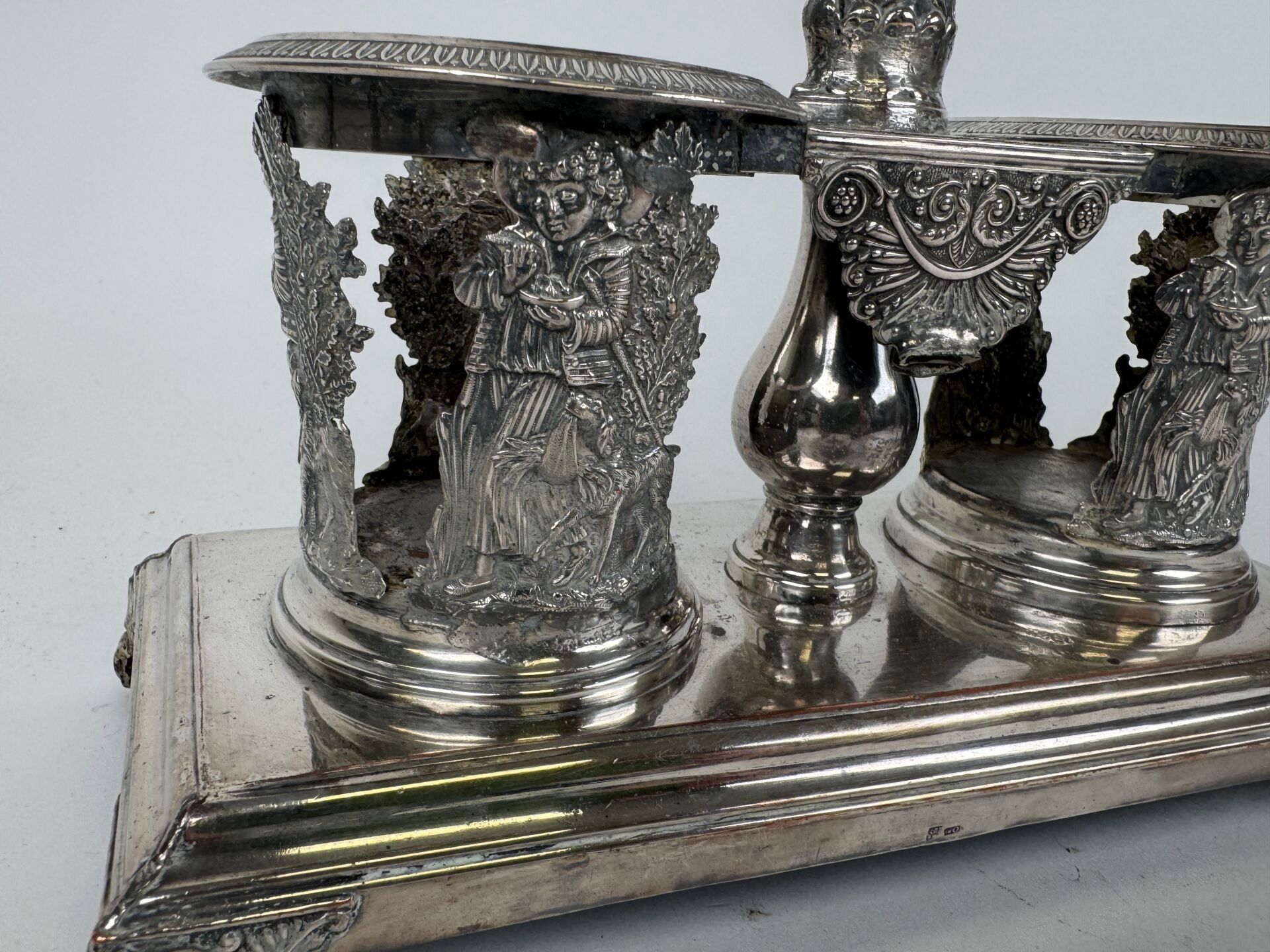 A silver plated oil and vinegar cruet decorated with figures and stylised palmettes.