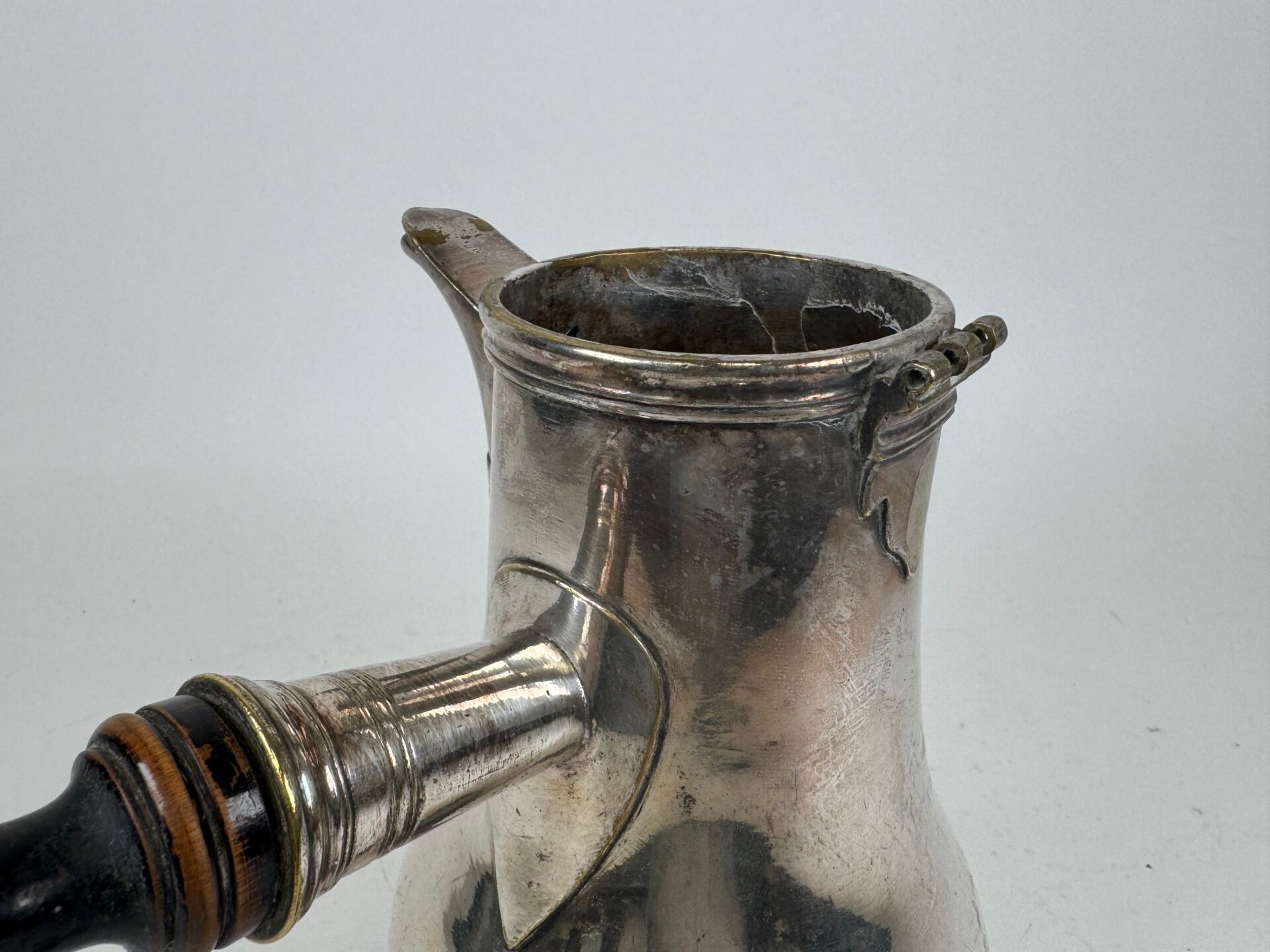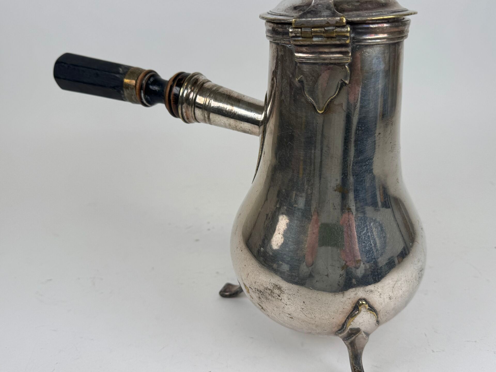 Silver plated chocolate pot, blackened wooden handle, tripod legs.