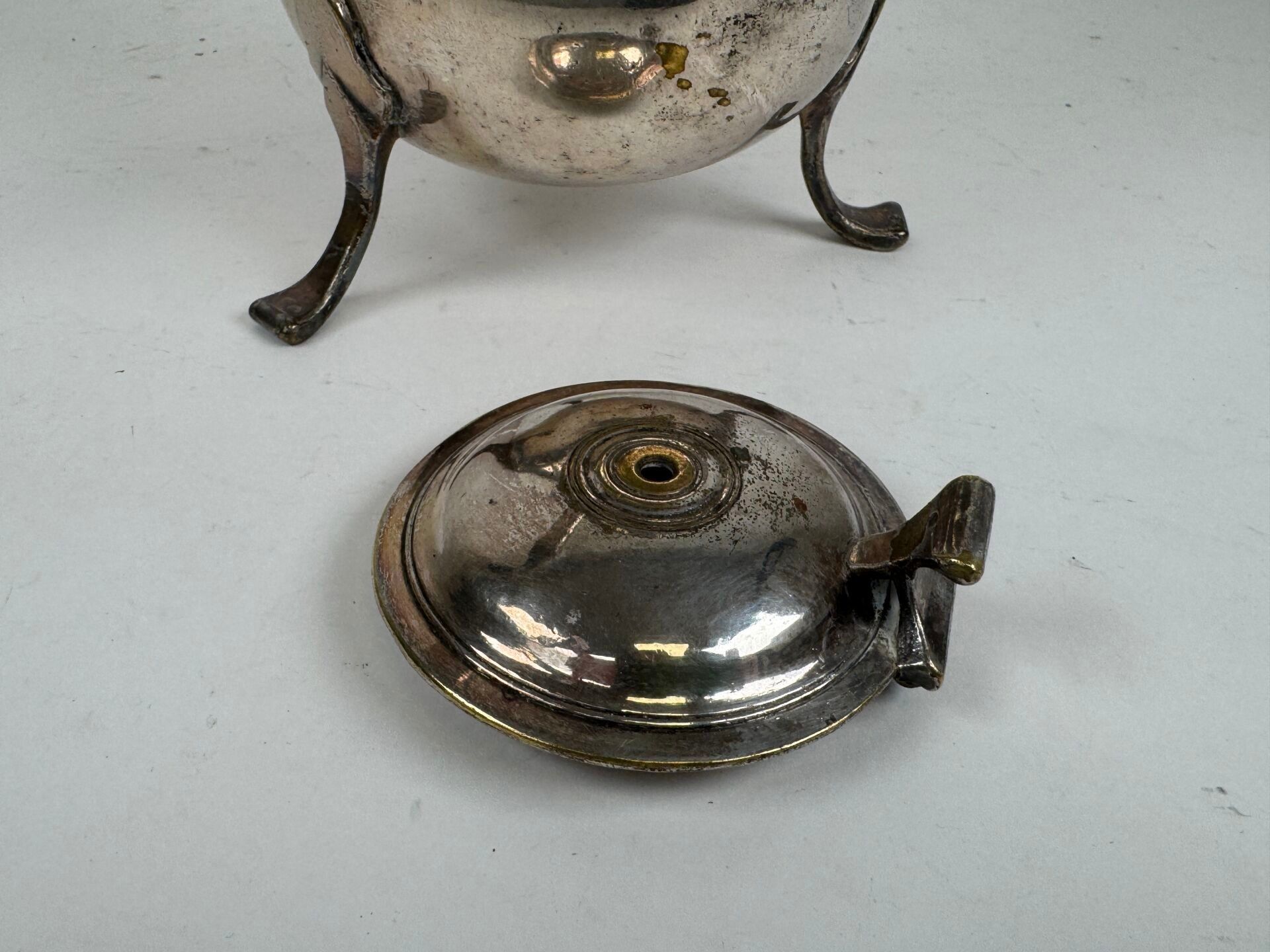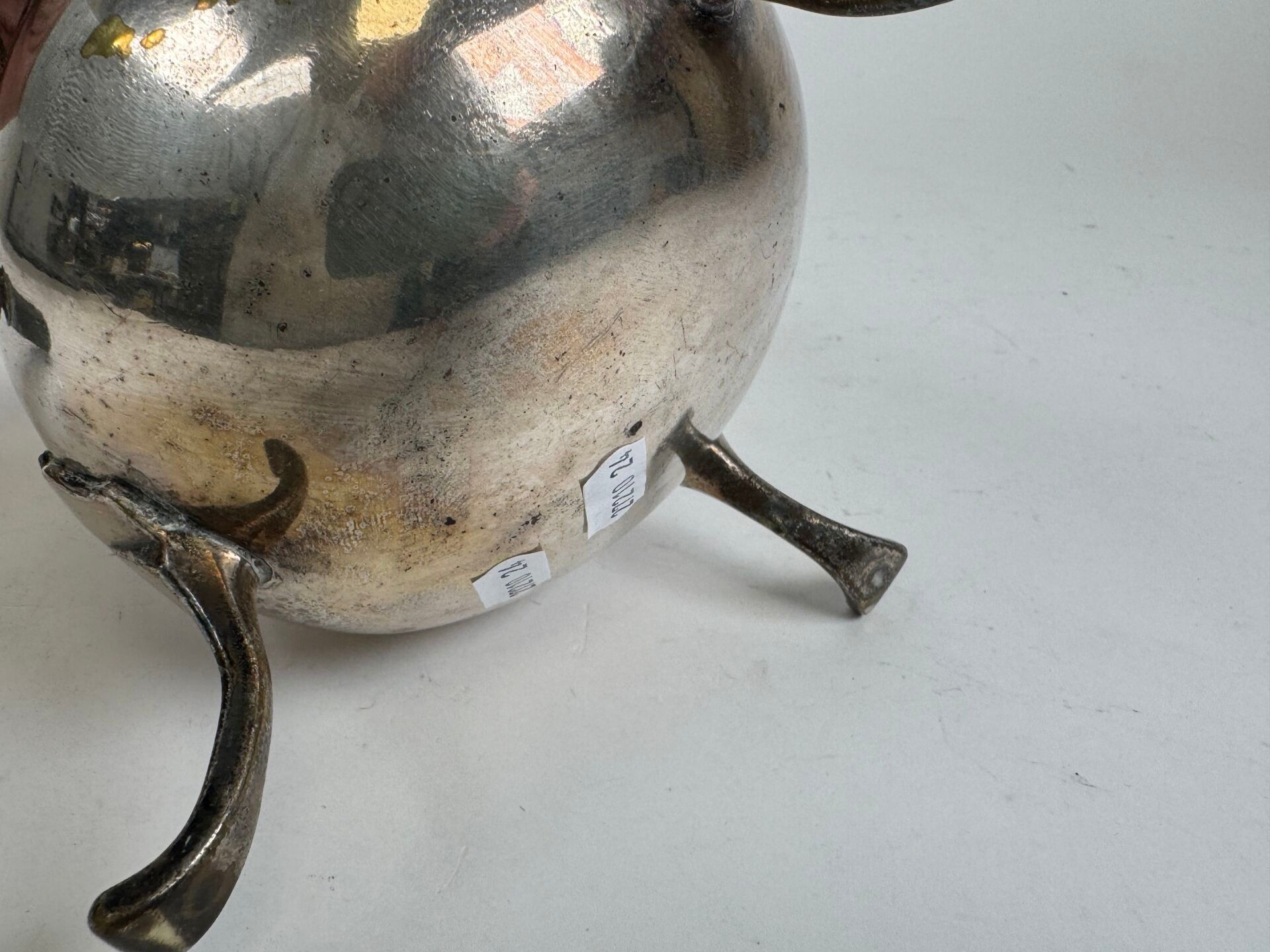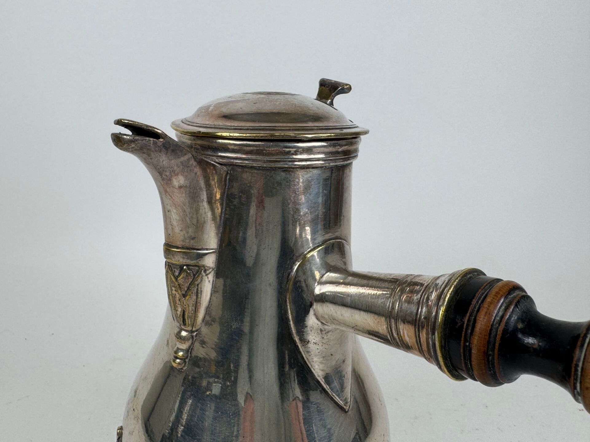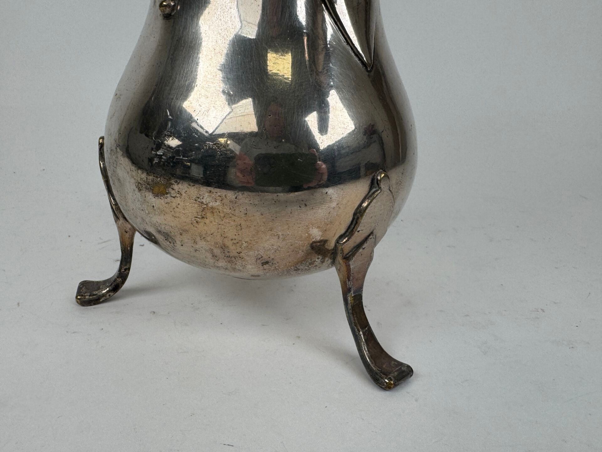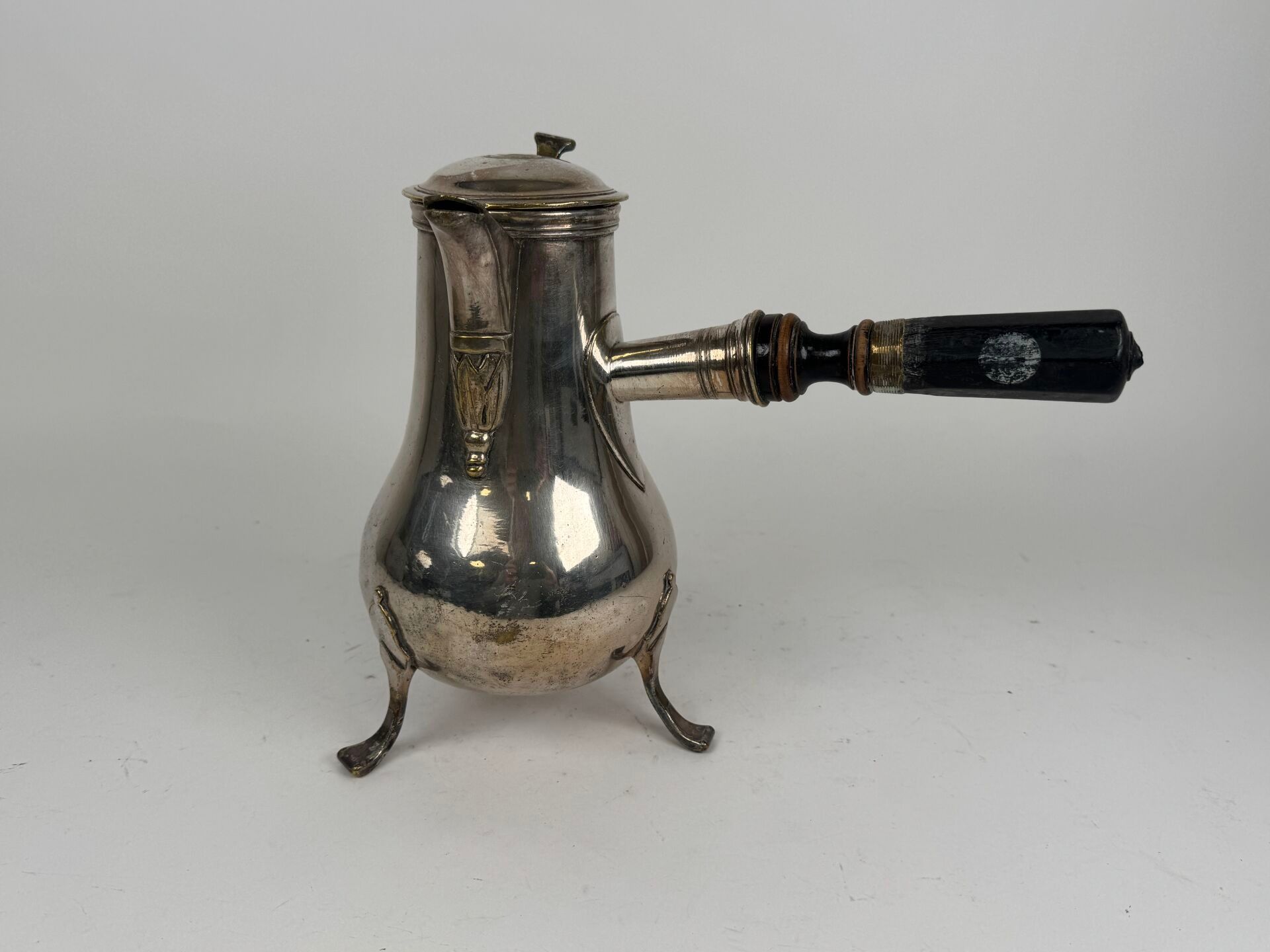 Silver plated chocolate pot, blackened wooden handle, tripod…
