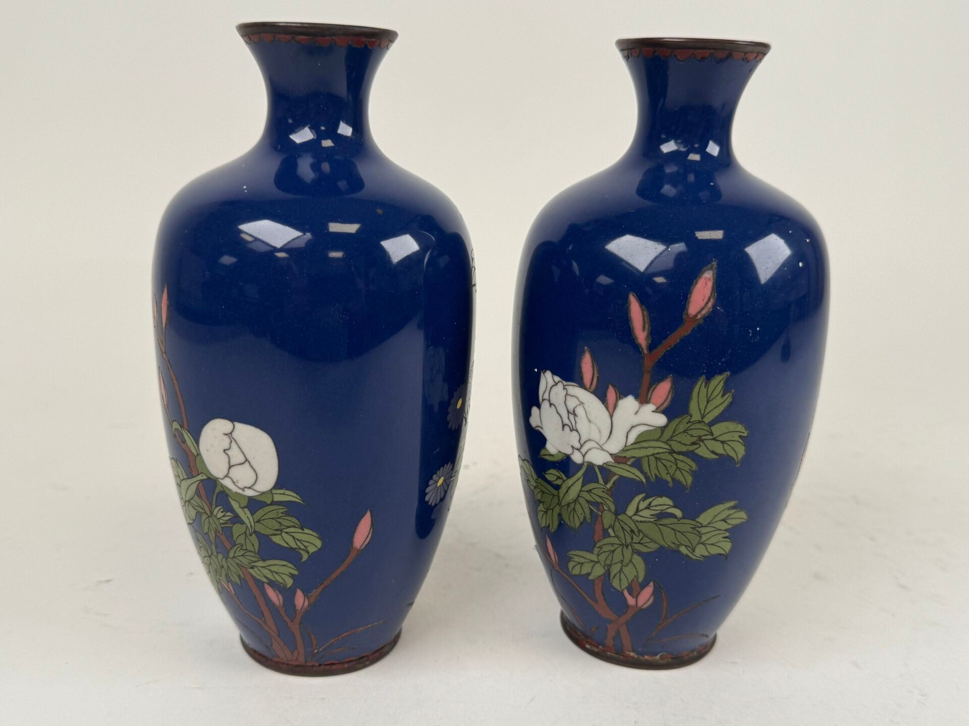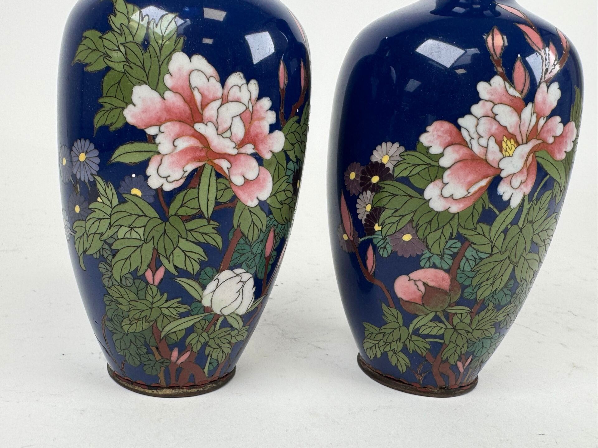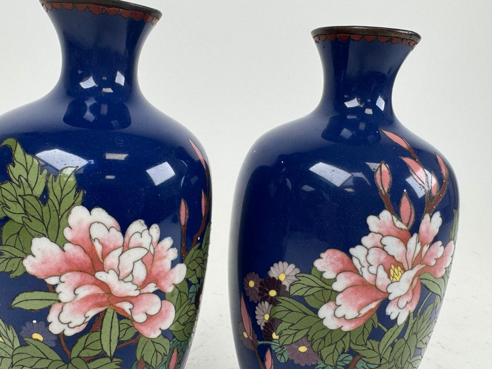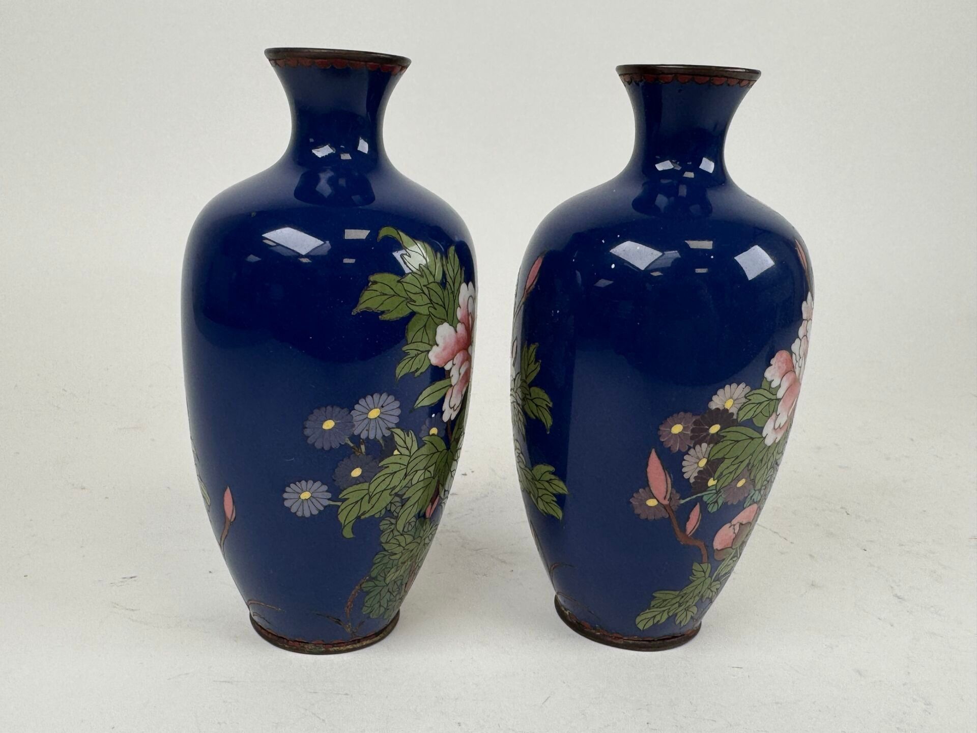 A pair of cloisonné vases with flowers on a blue background.